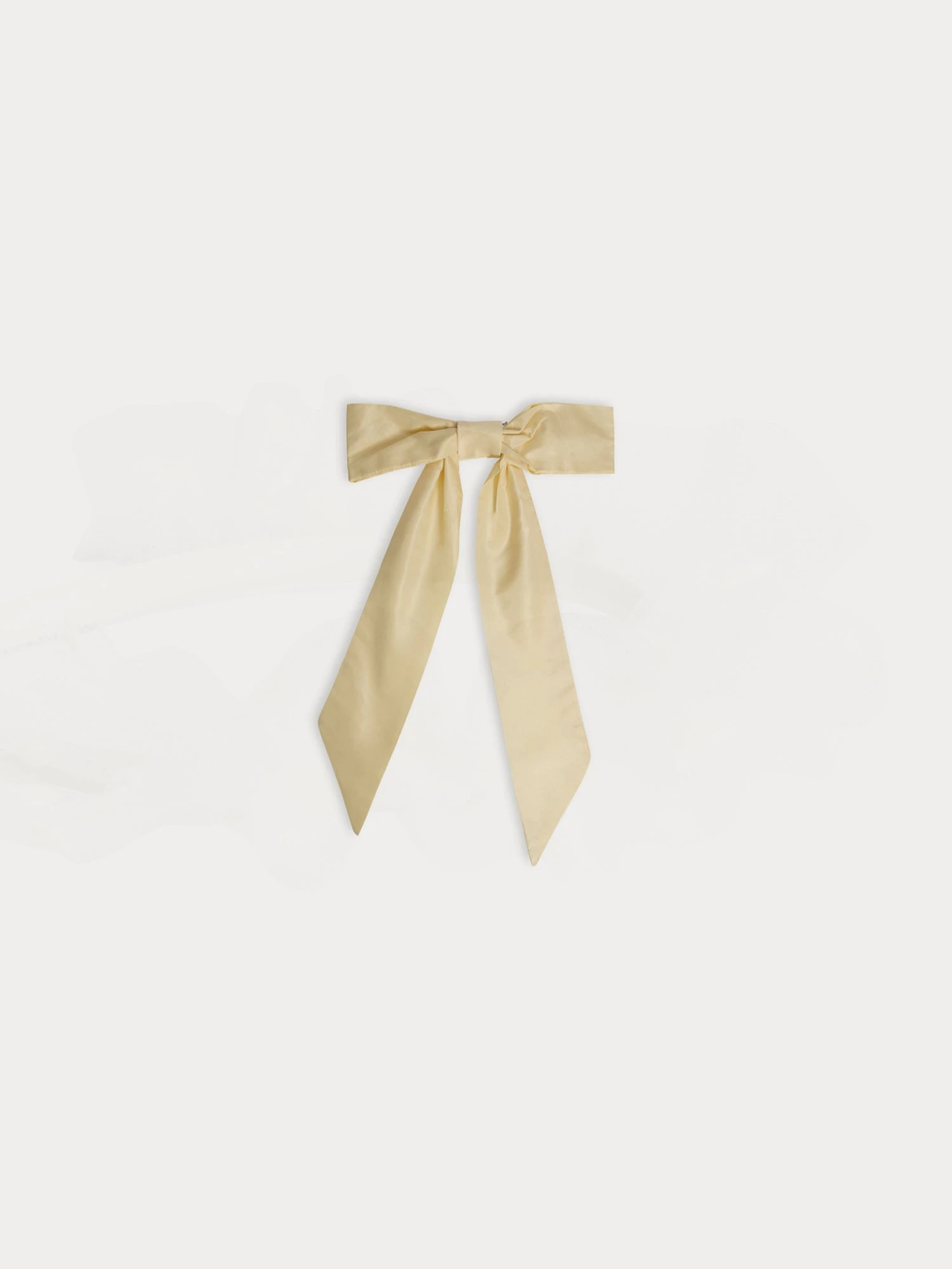 En soie naturelle unie, la barrette Domina pour fille s’orne d’un nœud plat aux longs pans biseautés. Adapté aux cheveux longs, cet accessoire élégant finalise une tenue de cérémonie.