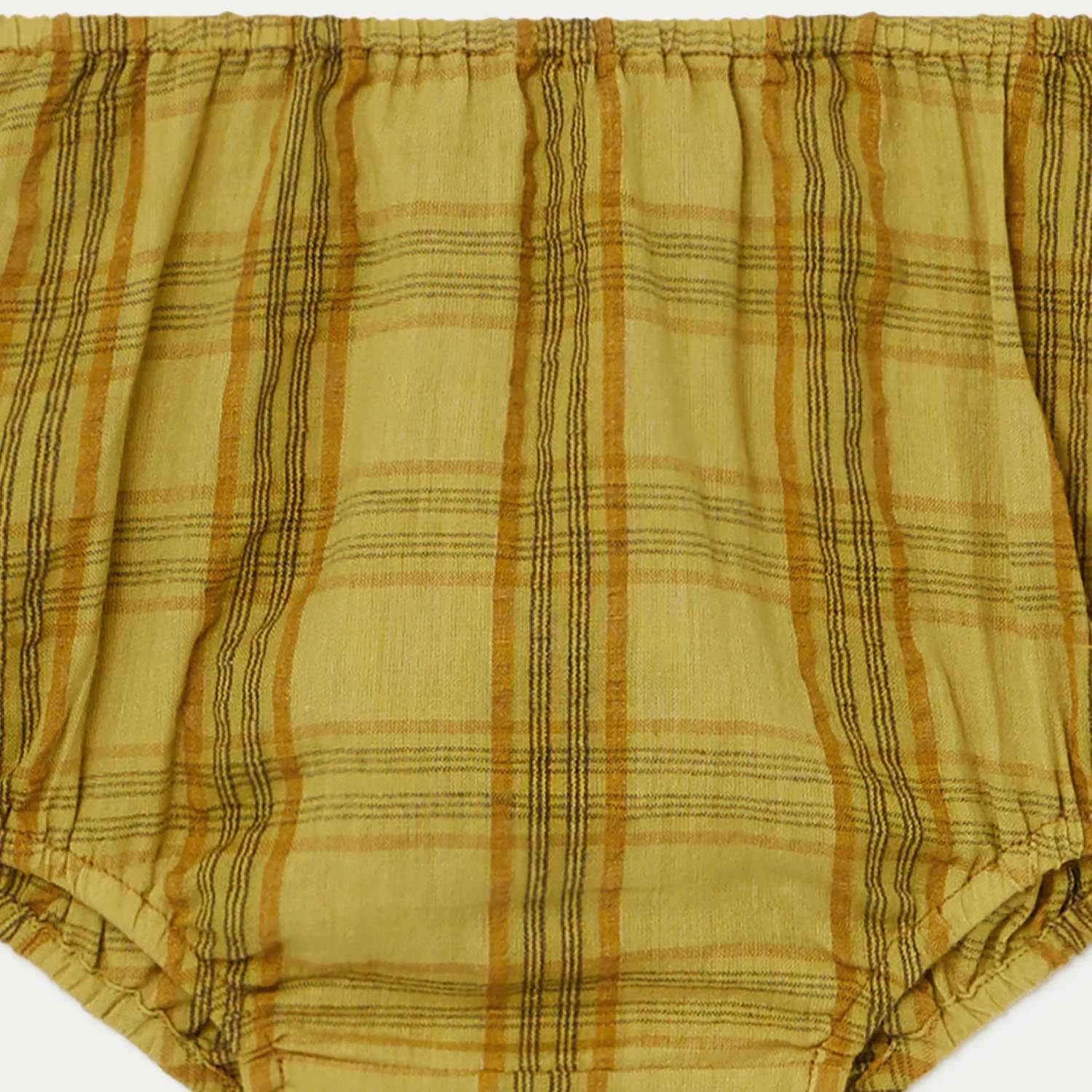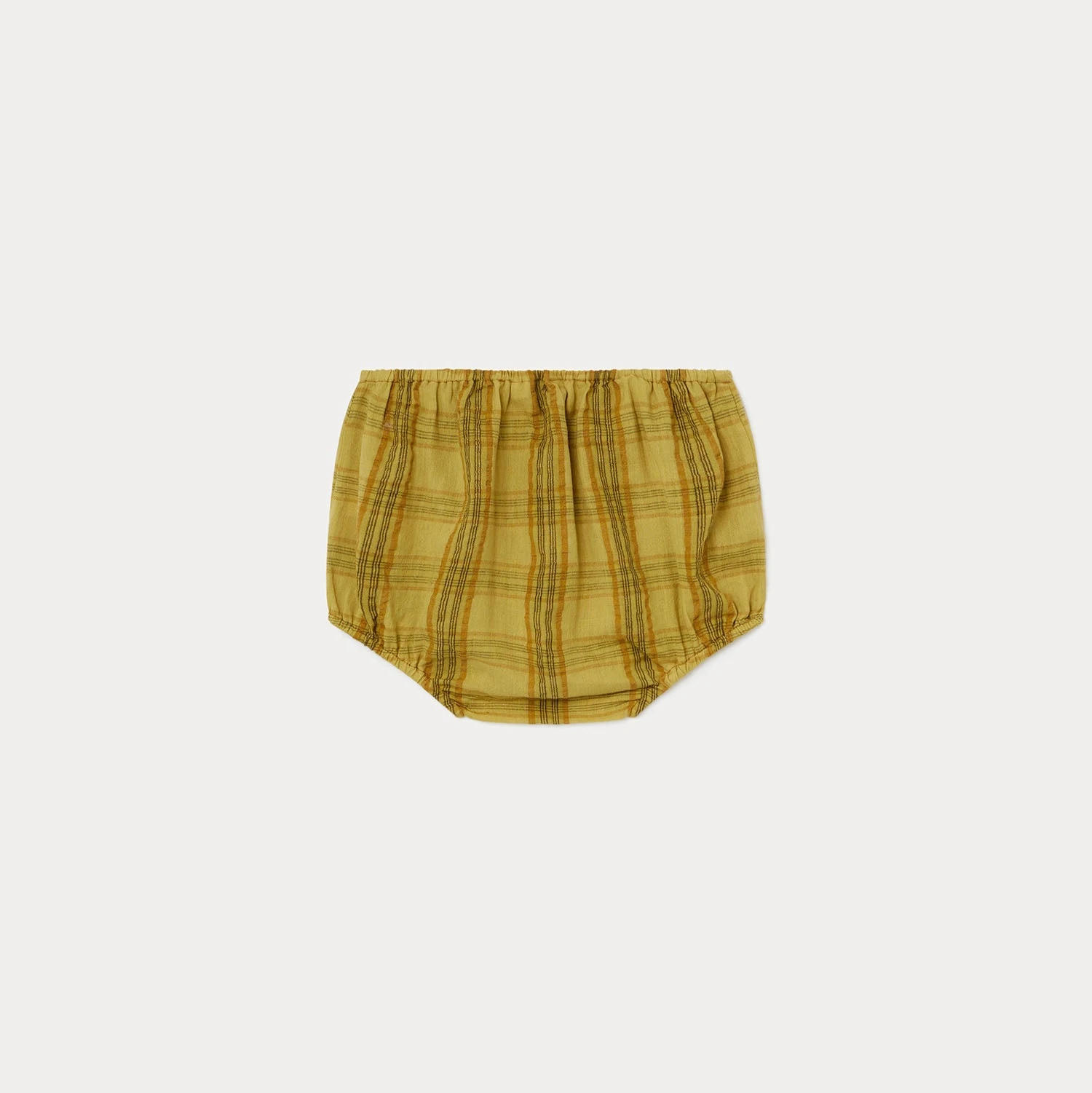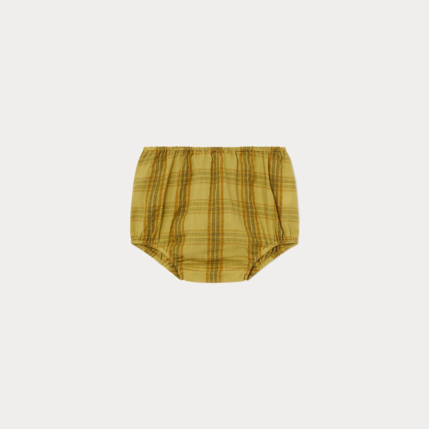 Le bloomer Aki pour bébé est un intemporel de la Maison. Son tissu voile teint s’orne de carreaux et de rayures élégantes.