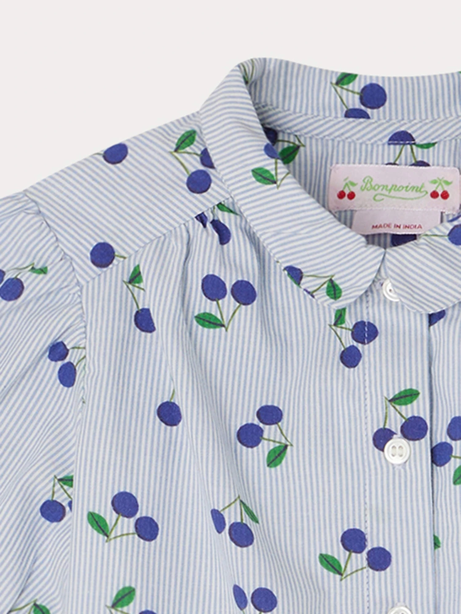 Les cerises iconiques s’invitent de manière graphique sur l’imprimé à rayures verticales de la blouse Adele pour fille. Le petit col Claudine lui ajoute un supplément de charme.
