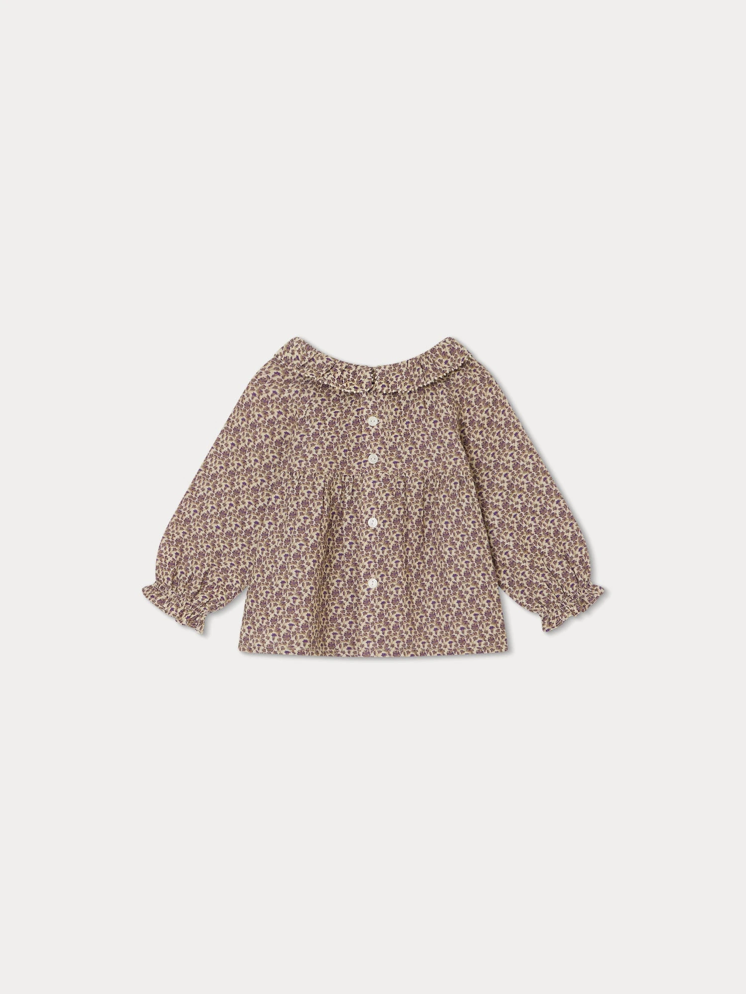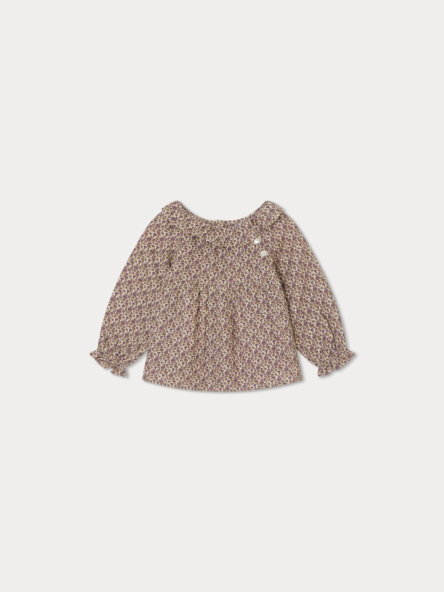 En crêpe de coton fluide, la blouse Melly pour bébé s’habille d’un imprimé floral. Collerette brodée, manches bouffantes volantées et raglan boutonné à l’épaule ornent ce modèle iconique.