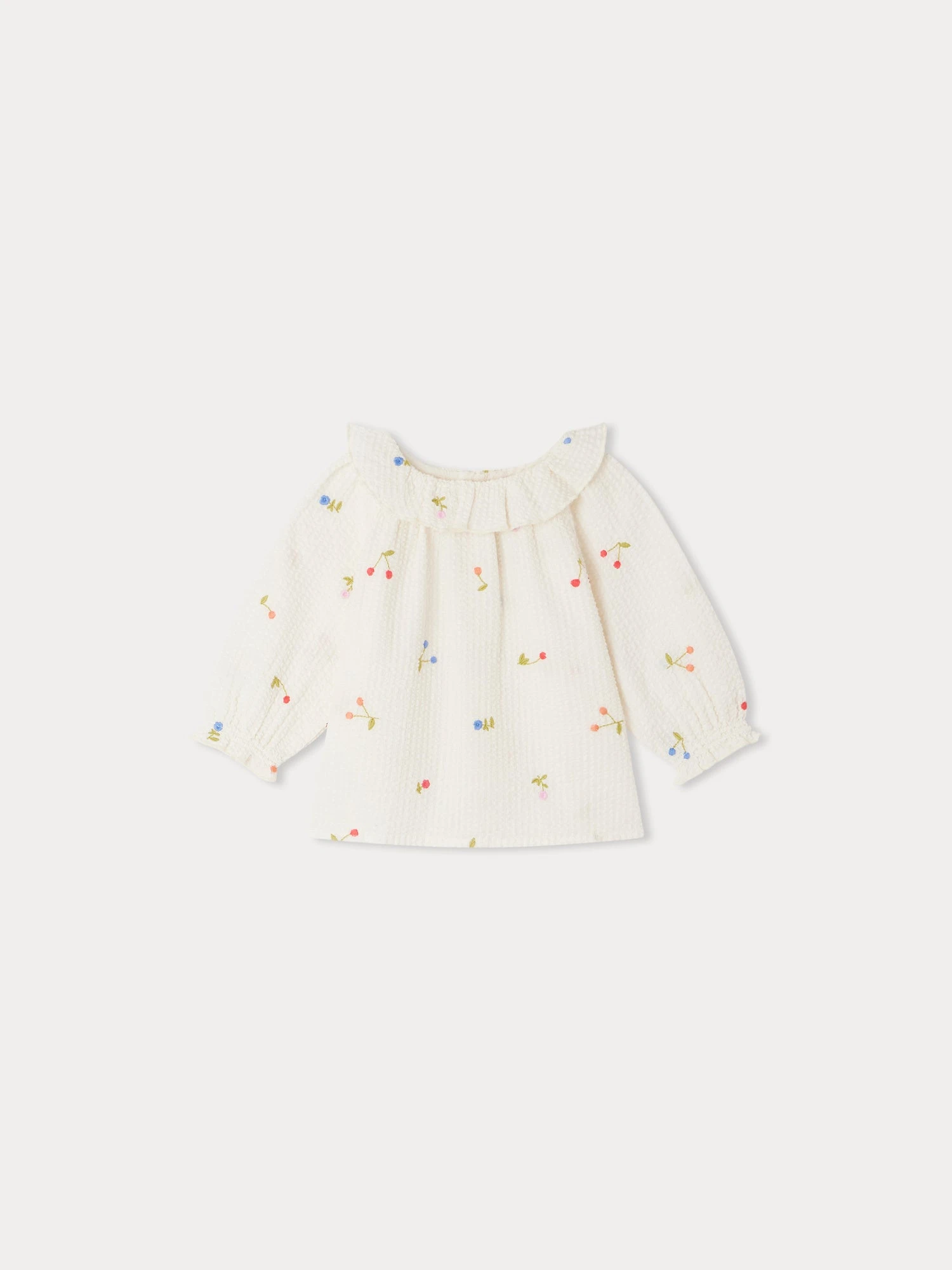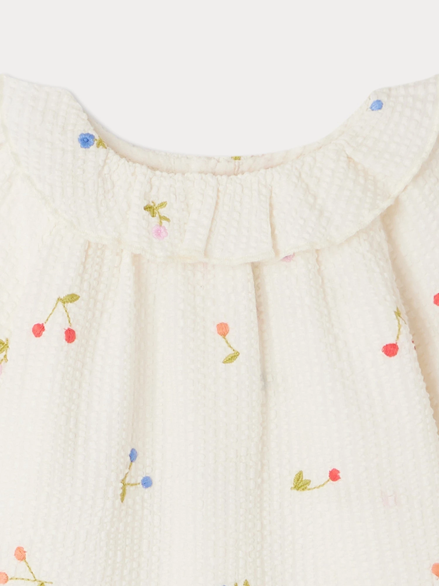 La blouse Dolci pour bébé, confectionnée en coton biologique gaufré, offre un charmant volume. Elle est agrémentée de broderies multicolores de cerises Bonpoint, d’une délicate collerette et de manches longues volantées.