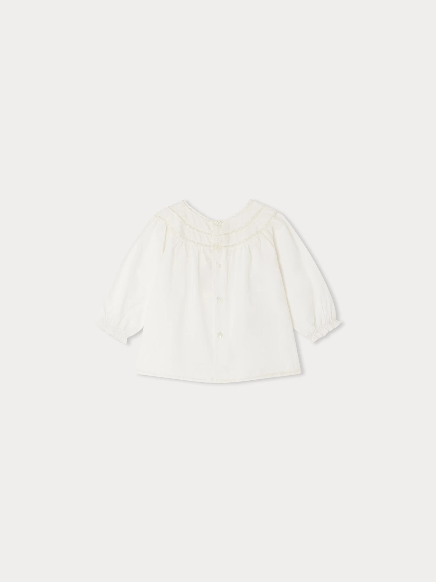 Confectionnée en voile de coton biologique, cette blouse pour bébé Felexi est élégante et agréable à porter. Elle est rehaussée de broderies faites à la main et d’empiècements en dentelle de Calais.