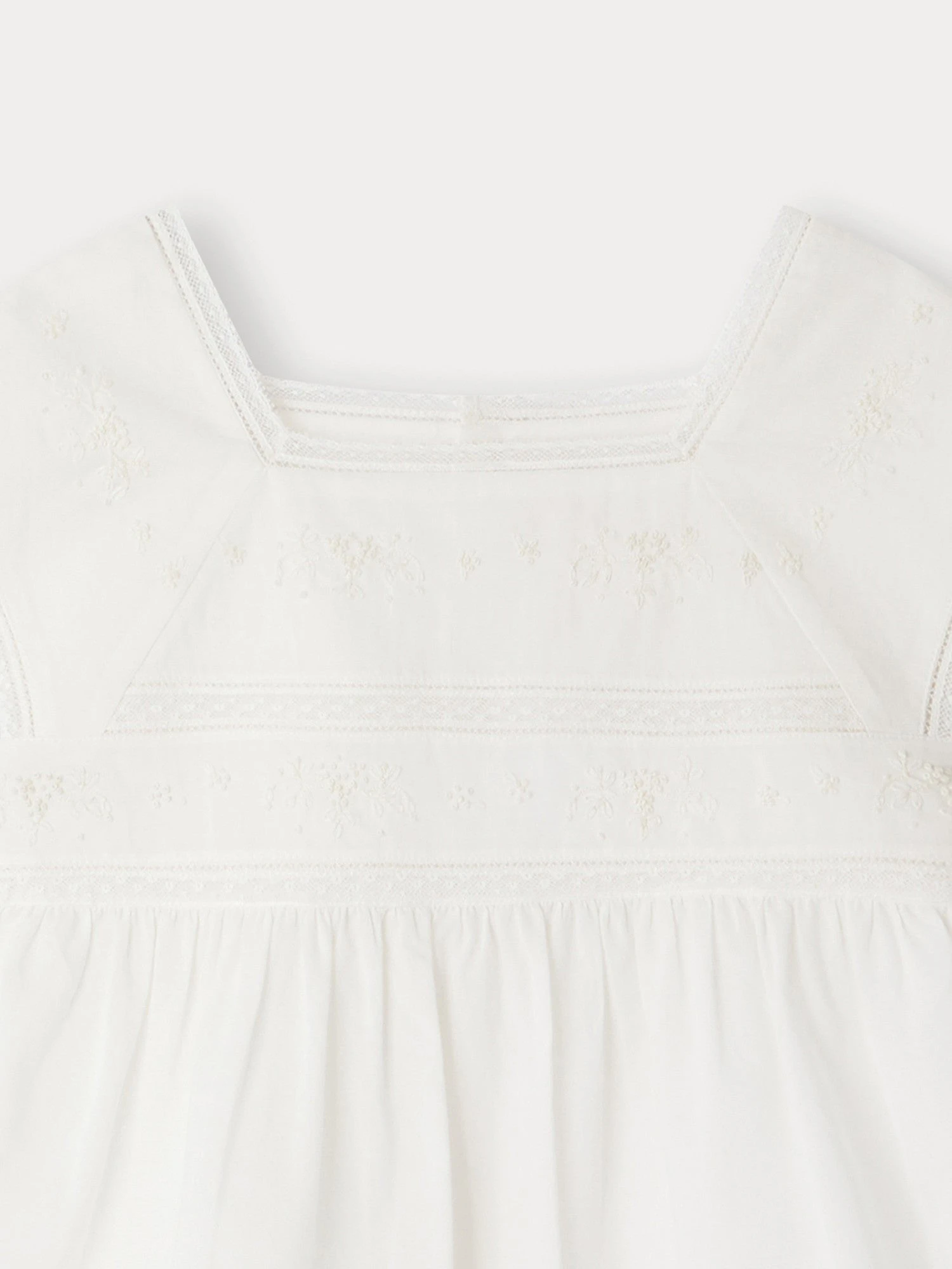 Cette blouse pour fille Flower est ravissante avec ses inserts en dentelle de Calais sur le buste. Confectionnée en voile de coton biologique, elle présente une coupe évasée.
