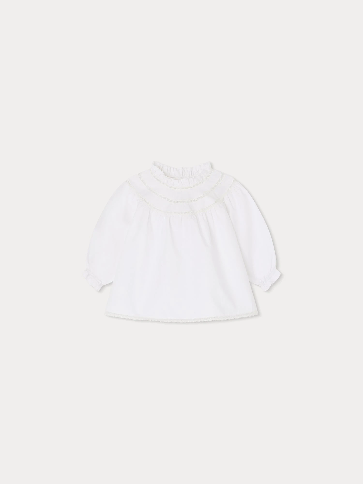 En coton biologique fin et doux, cette blouse unie Jelexi pour bébé s’orne d’un col et de poignets volantés. L’empiècement rond en corolle est rehaussé d’entre-deux de dentelle.