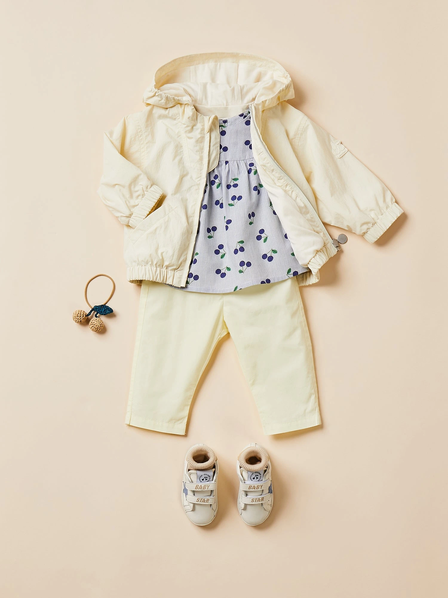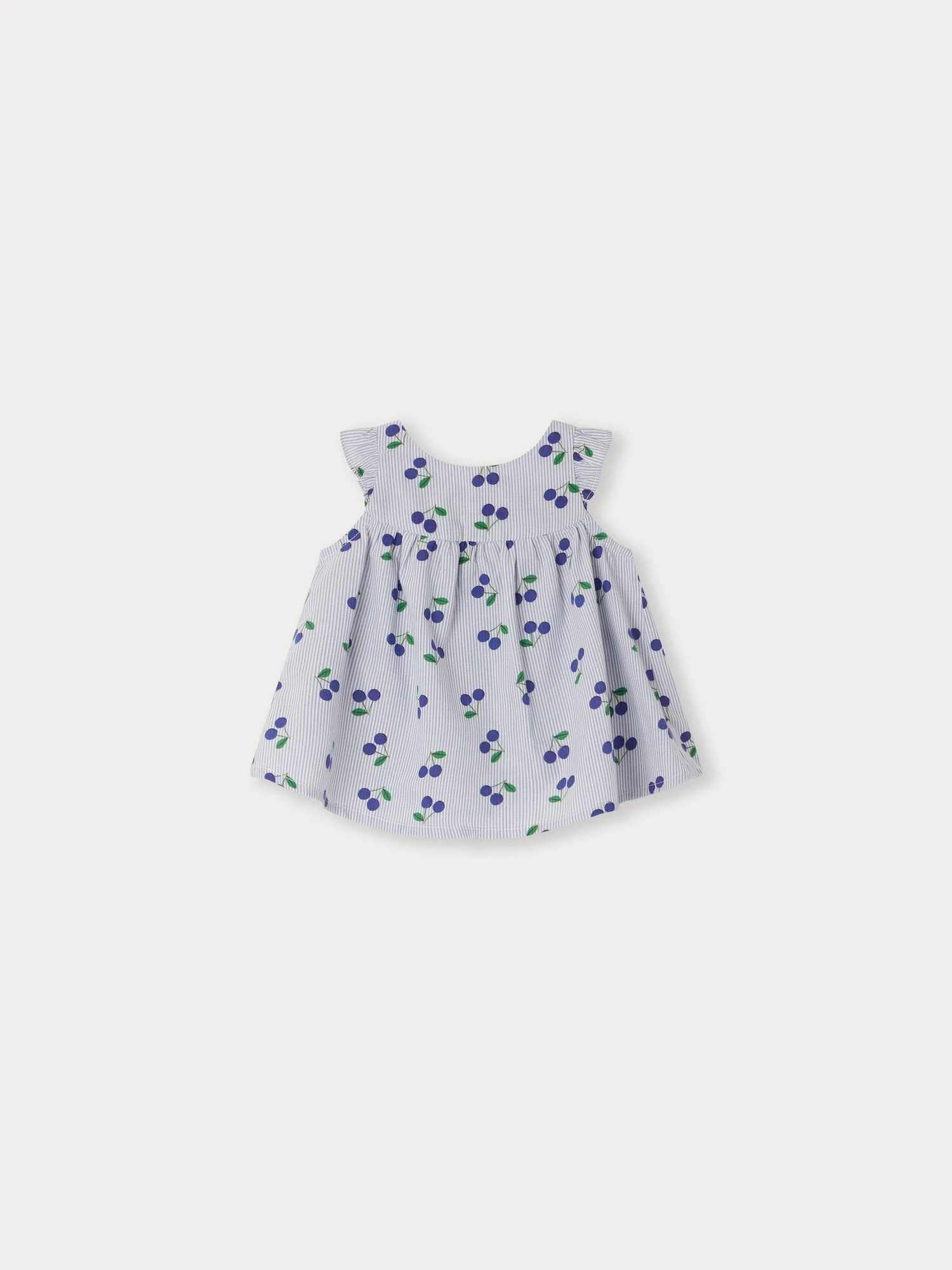 Les cerises emblématiques créent un contraste esthétique sur les rayures verticales imprimées de la blouse Lutine pour bébé. Les mancherons sur les épaules se composent d’un volant.