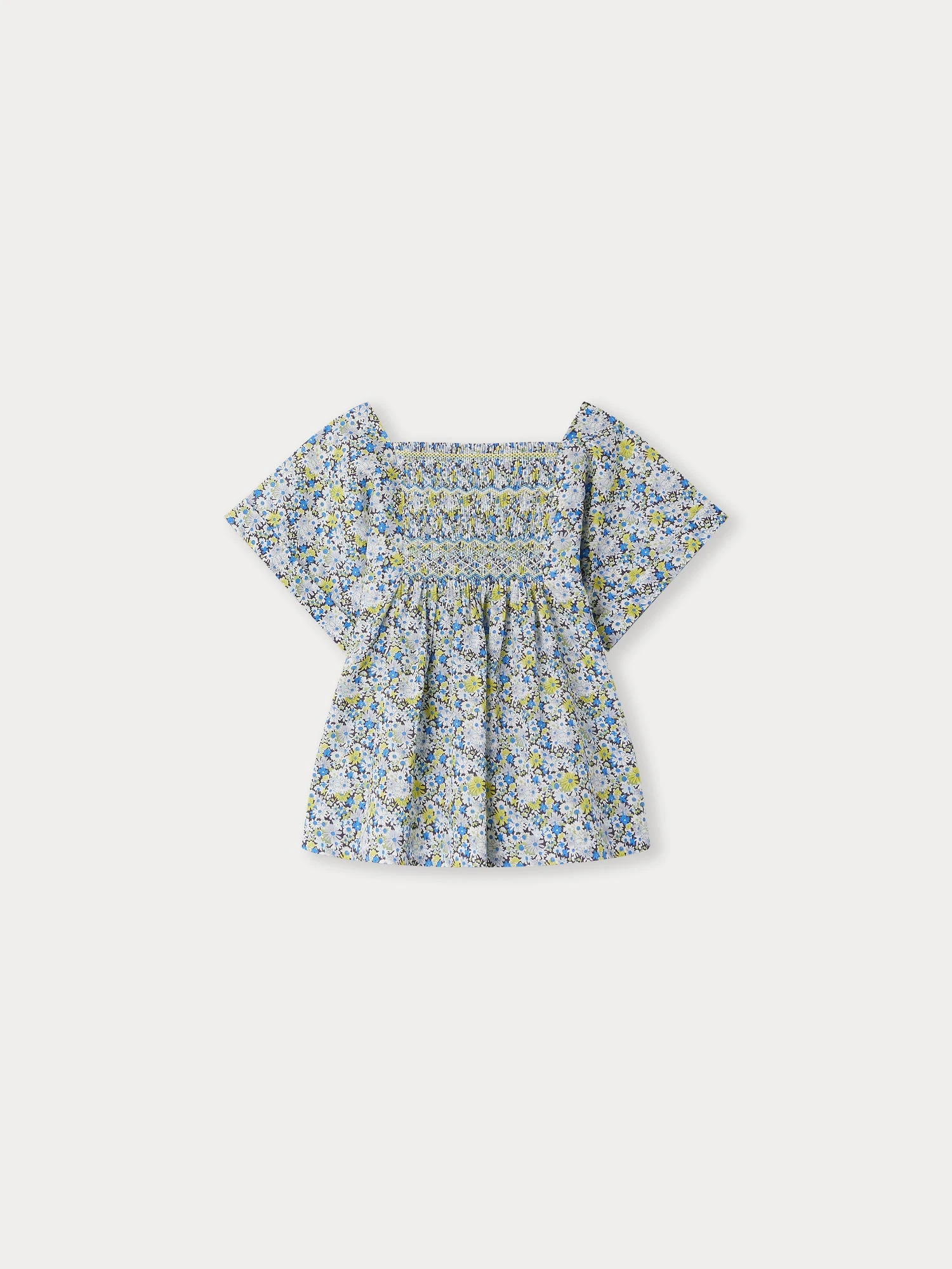 Confectionnée en coton biologique, cette blouse pour fille Pays séduit par son tissu Liberty aux motifs frais et colorés. Elle comporte des smocks brodés à la main sur le buste.
