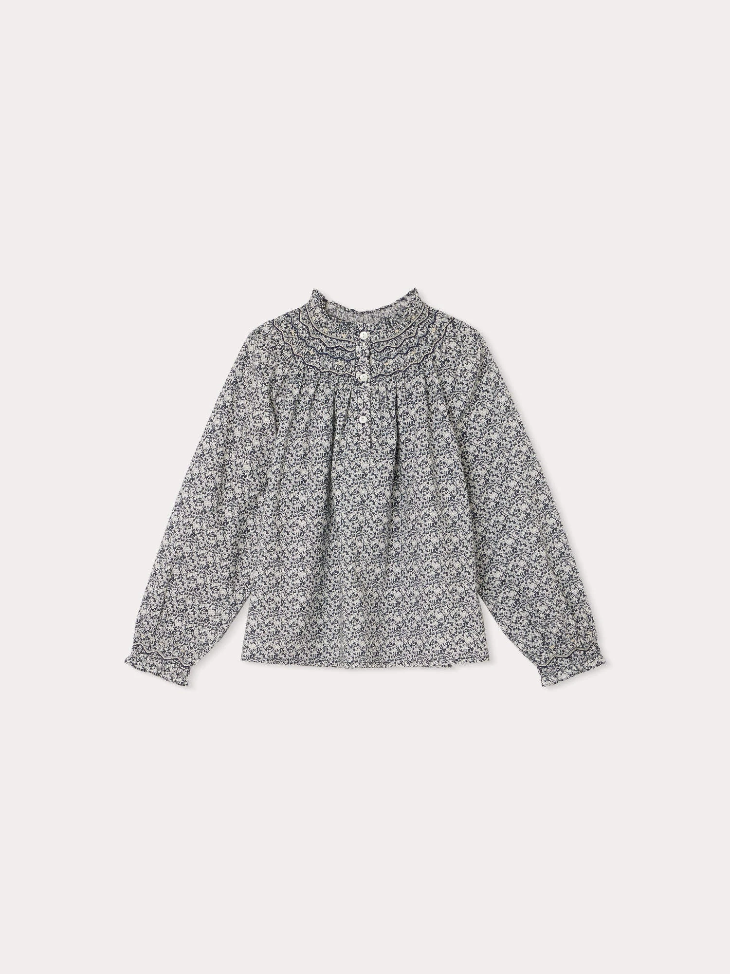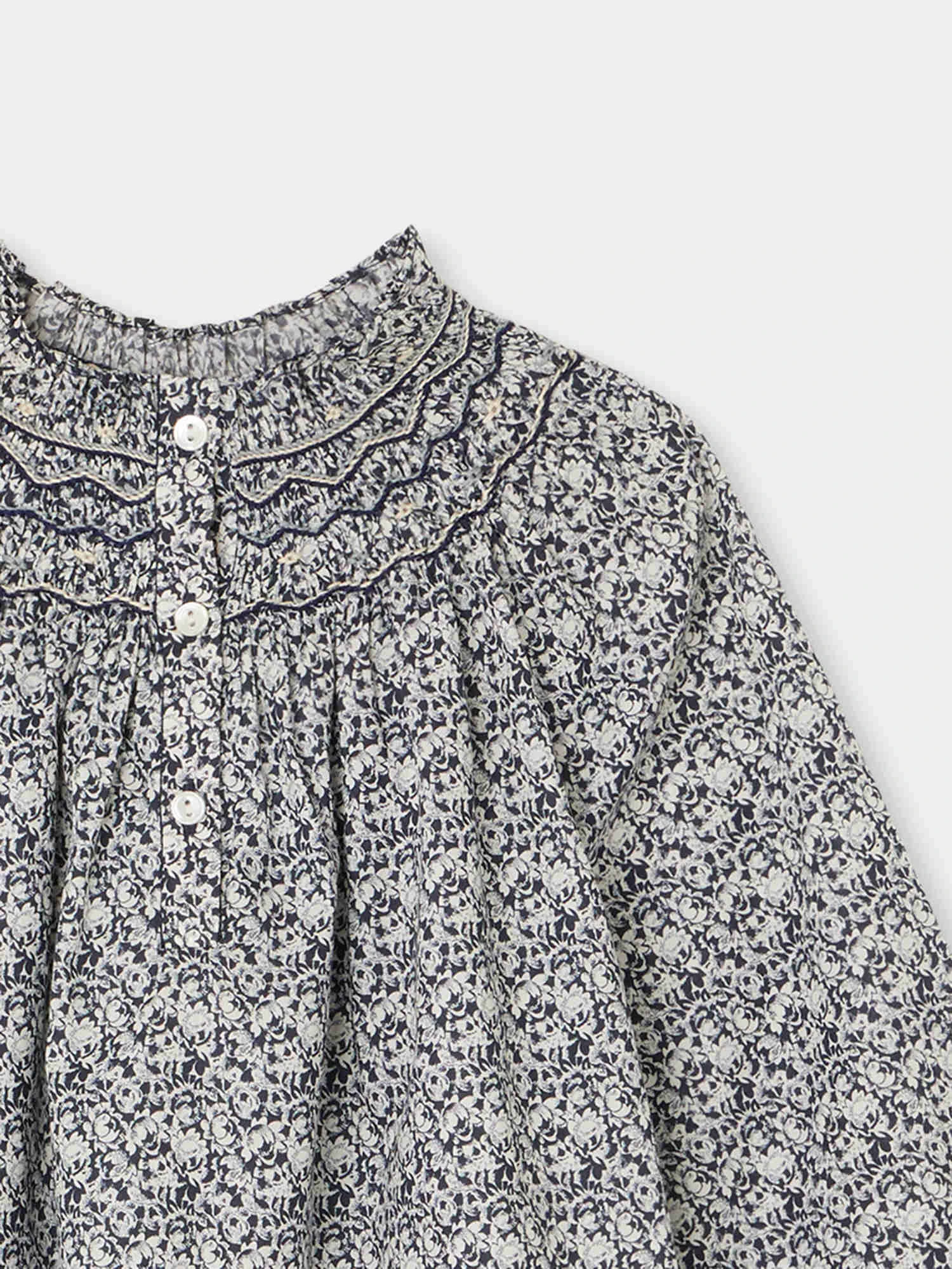Cette blouse à manches longues Pétale pour fille s’orne d’un col montant plissé et fermé à l’avant par 3 petits boutons. La pièce en tissu Liberty est brodée à la main au niveau du col et des poignets.