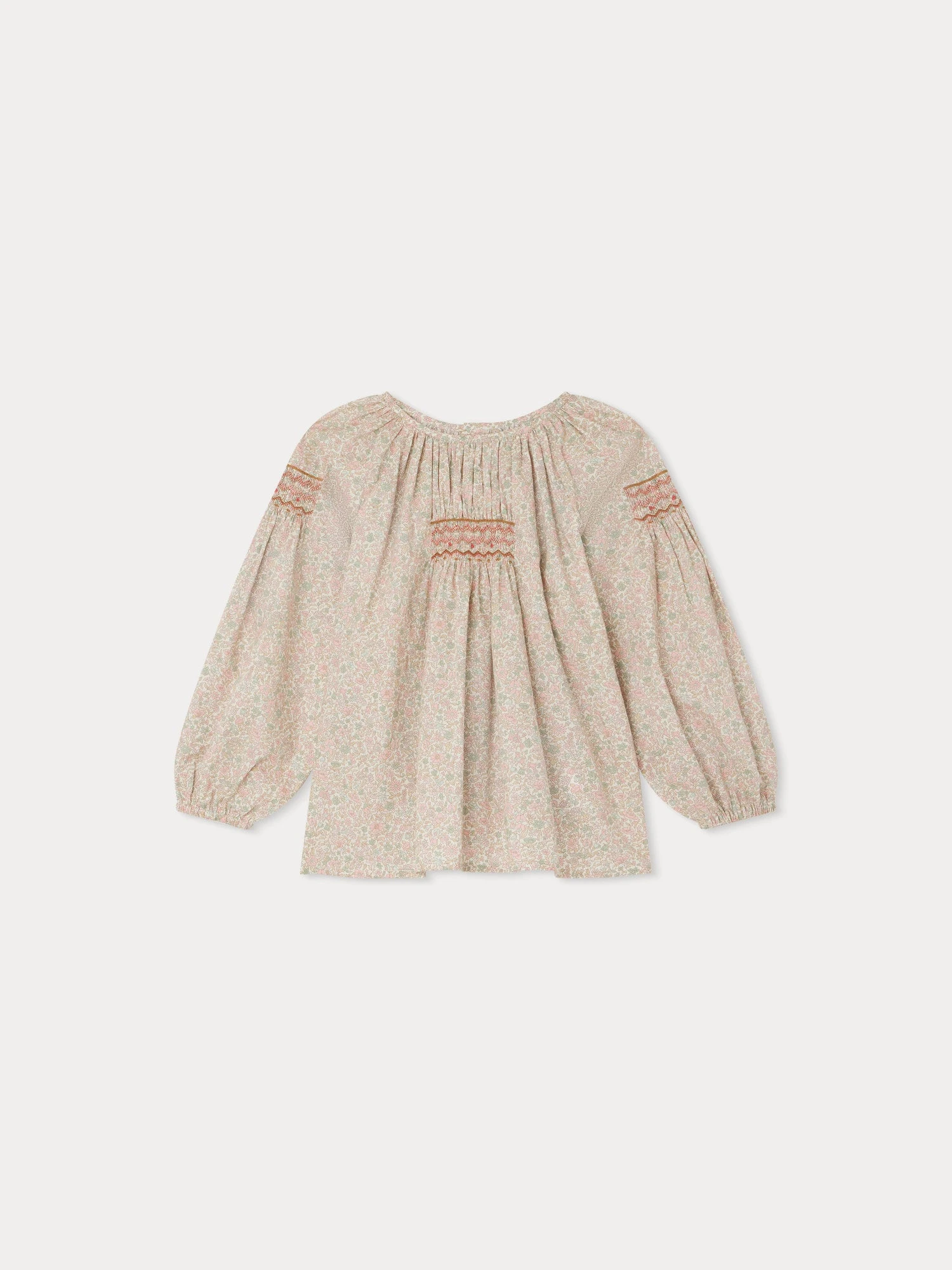 Dotée d’un joli volume en corolle avec détails smockés, l’iconique blouse Poldie pour fille s’habille d’un tissu Liberty aux motifs doux. Elle se ferme au dos par 3 petits boutons nacrés.