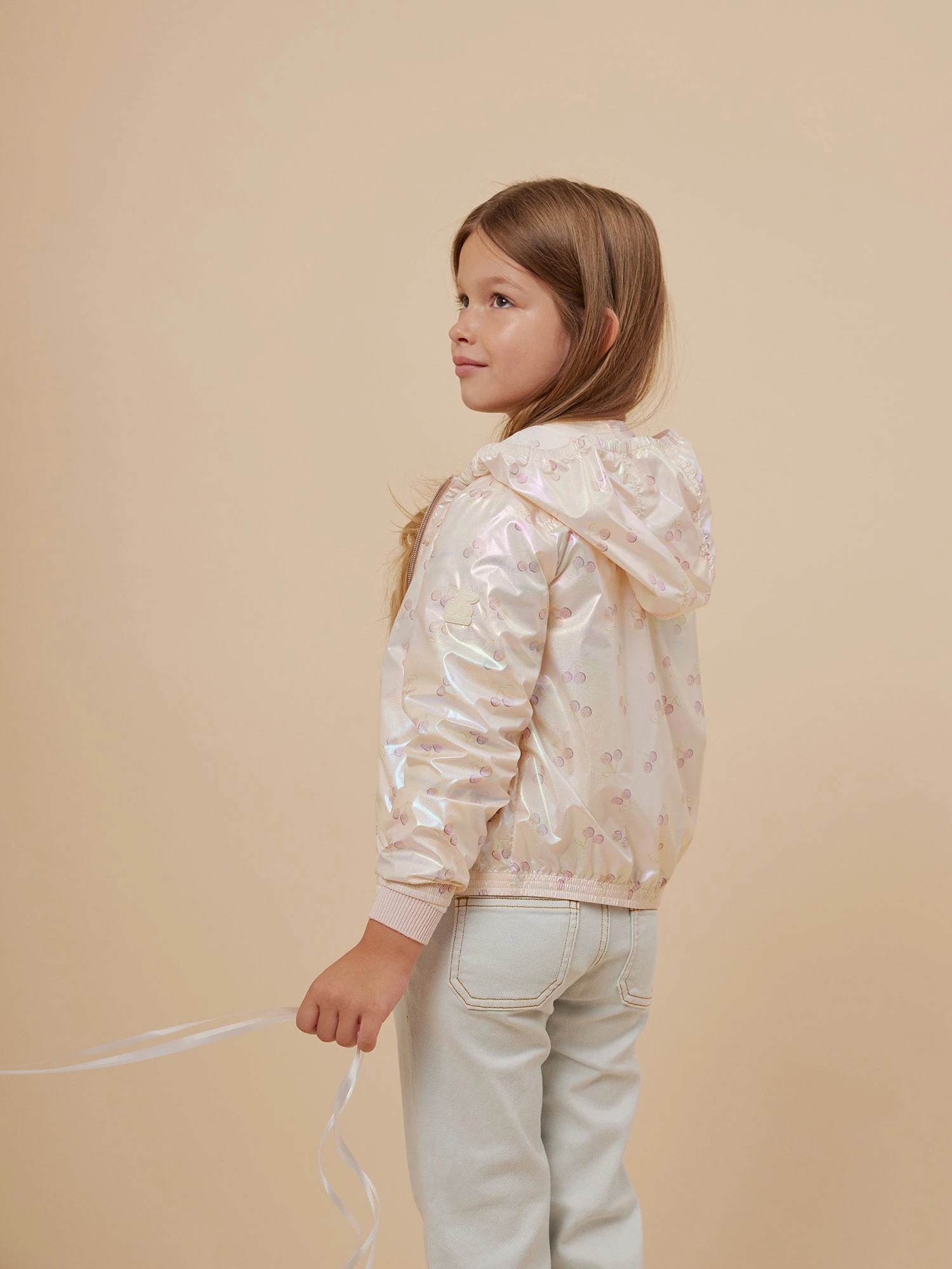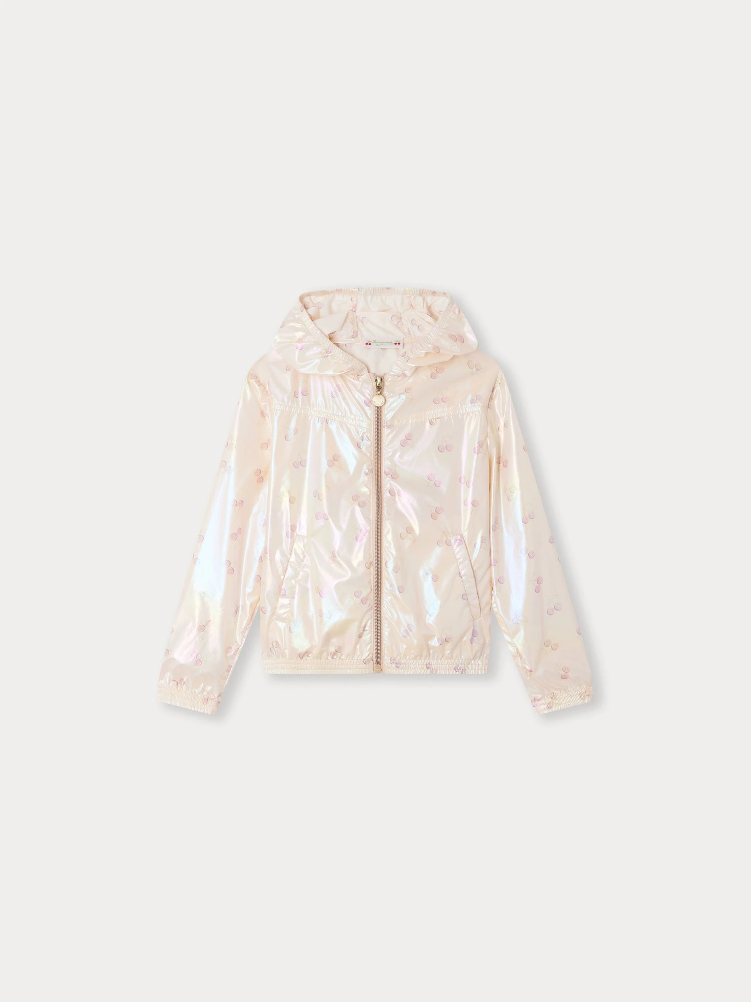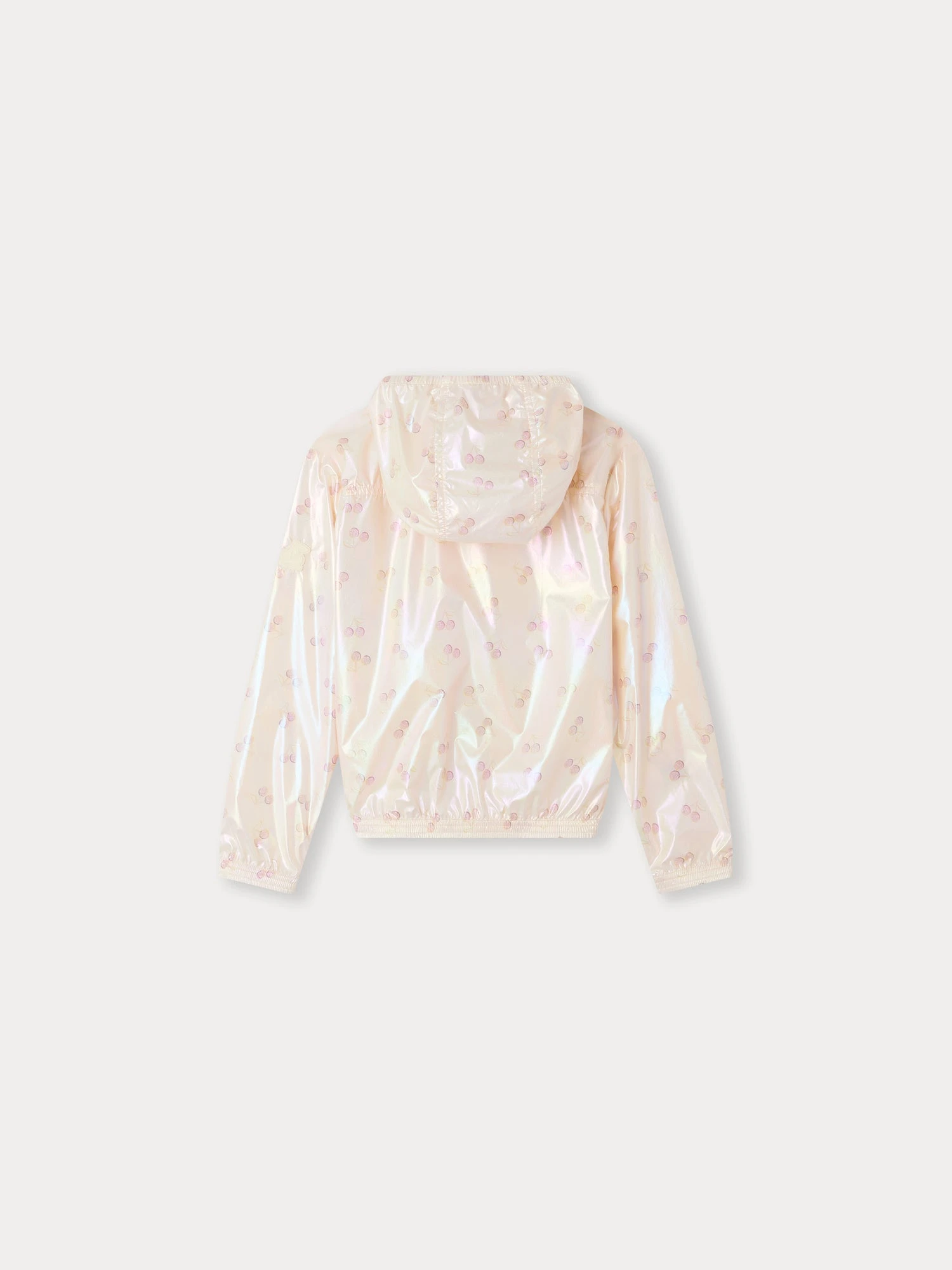 Le coupe-vent irisé à capuche Gytha pour fille, léger et déperlant, est imprimé de cerises sur l’ensemble. Capuche, poignets et base sont élastiqués pour protéger de la pluie.