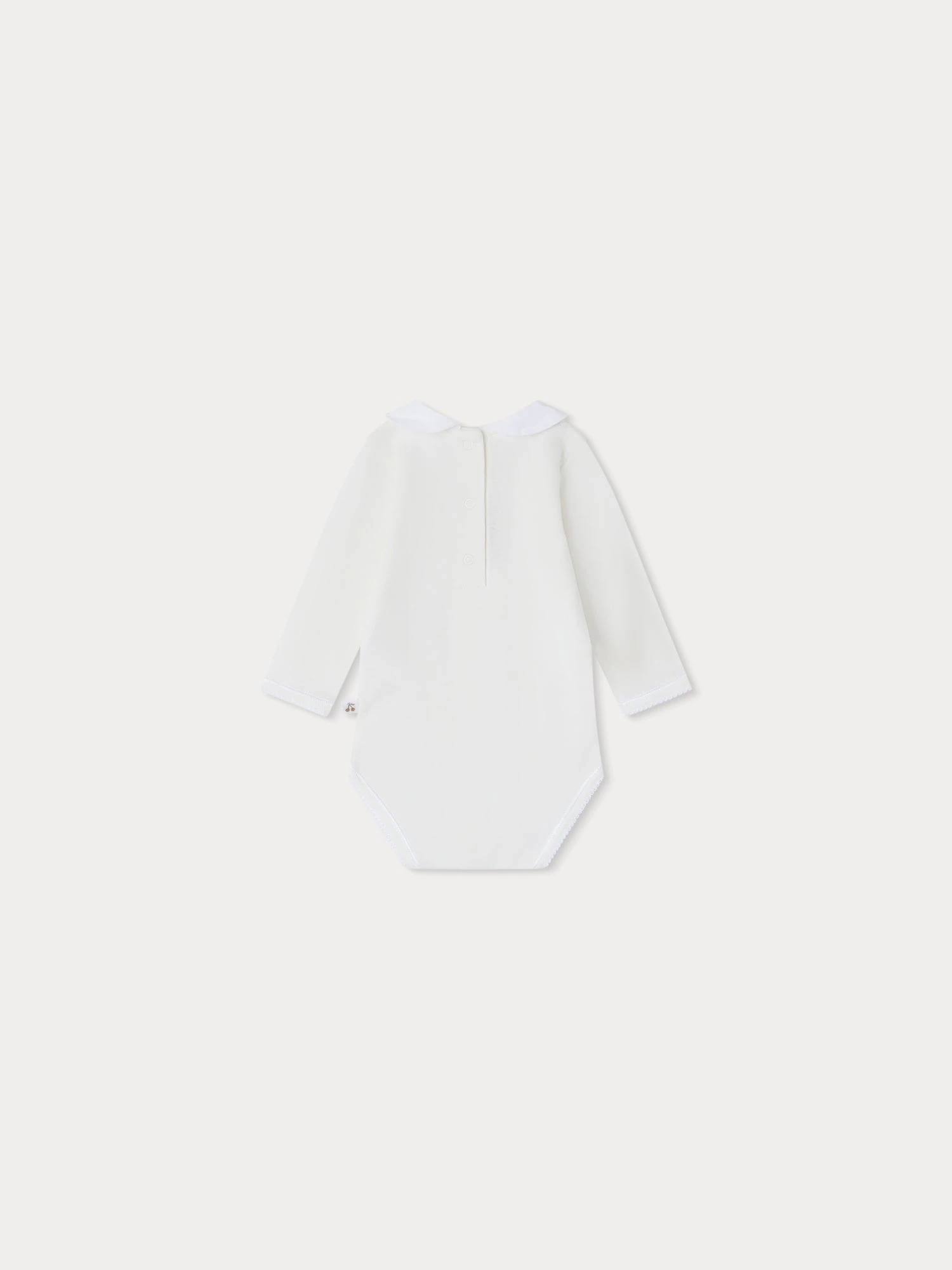 Ce body pour bébé Cygne se démarque par son ravissant col Claudine brodé à la main. Confectionné en coton biologique, il se dote d’une fermeture pressionnée discrète au dos, gage d’un enfilage aisé.