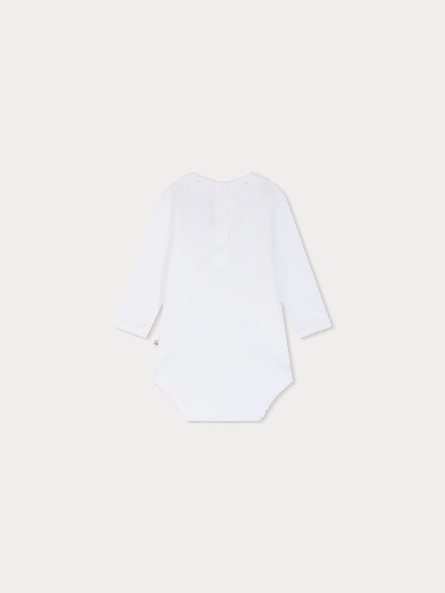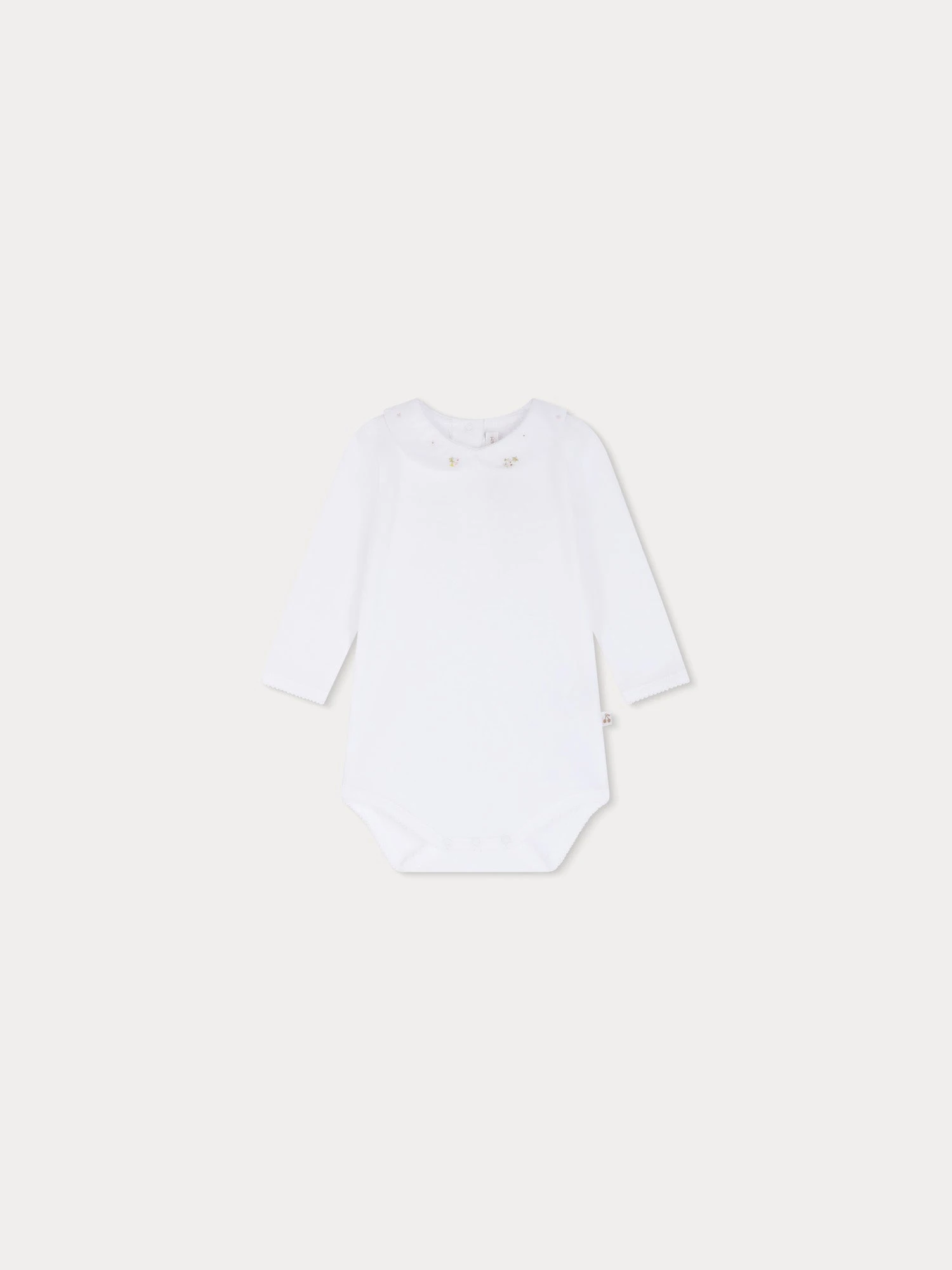 Ce body pour bébé Cygne séduit par son élégant col rehaussé de broderies florales réalisées à la main. Confectionné en coton biologique, il comporte une fermeture pressionnée dans le haut du dos.