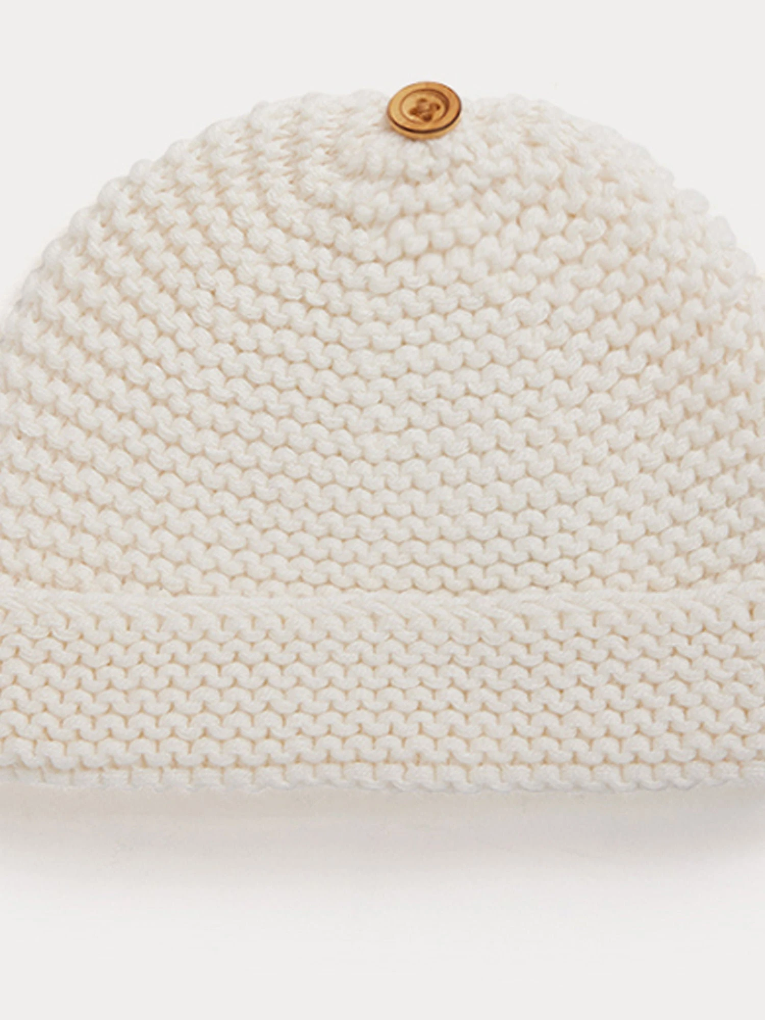 Couvrant la tête et les oreilles, ce bonnet Barbo en laine et coton aidera Bébé à conserver sa température. Il est fini de petits revers et d’un bouton top en bois.