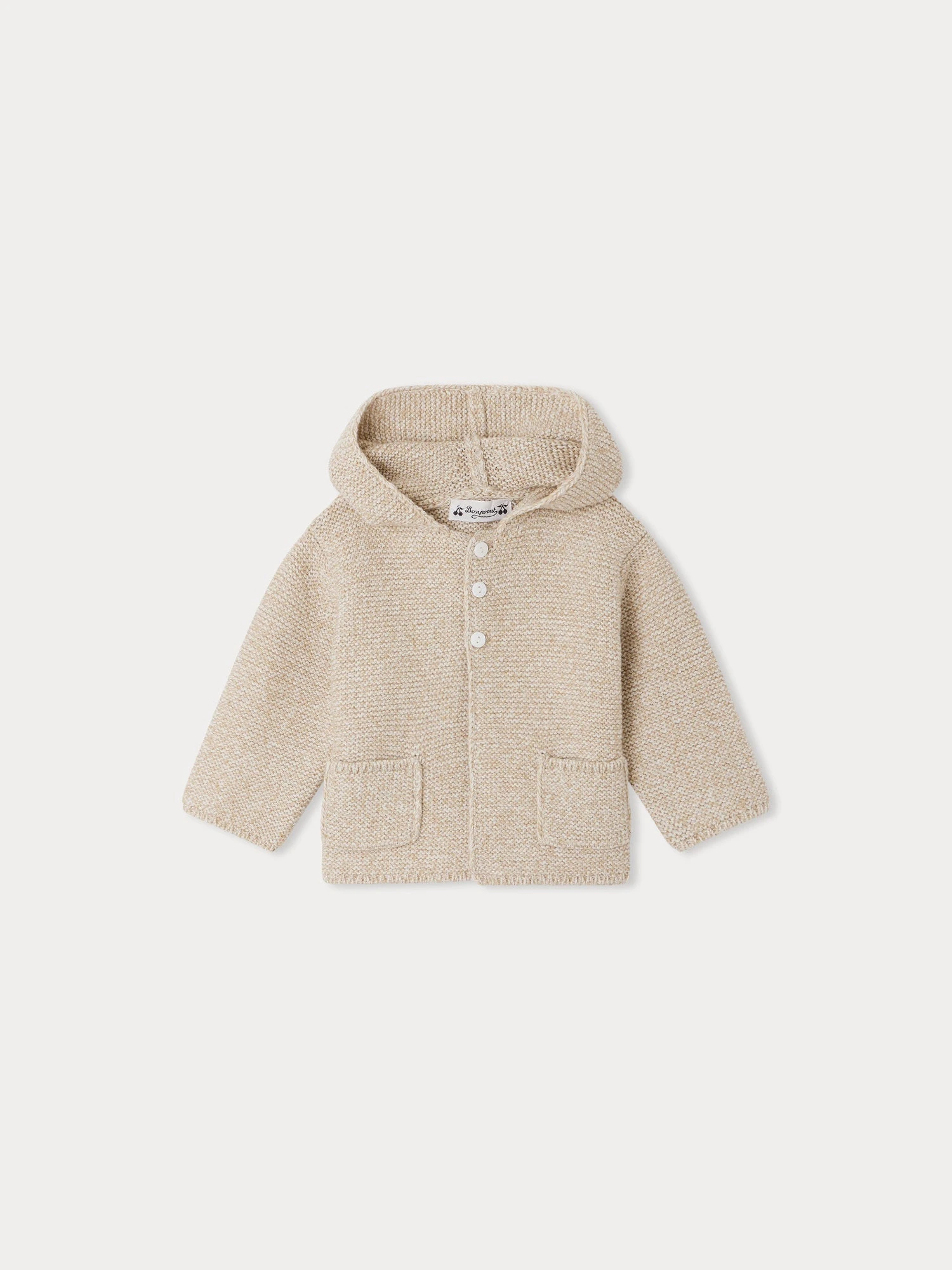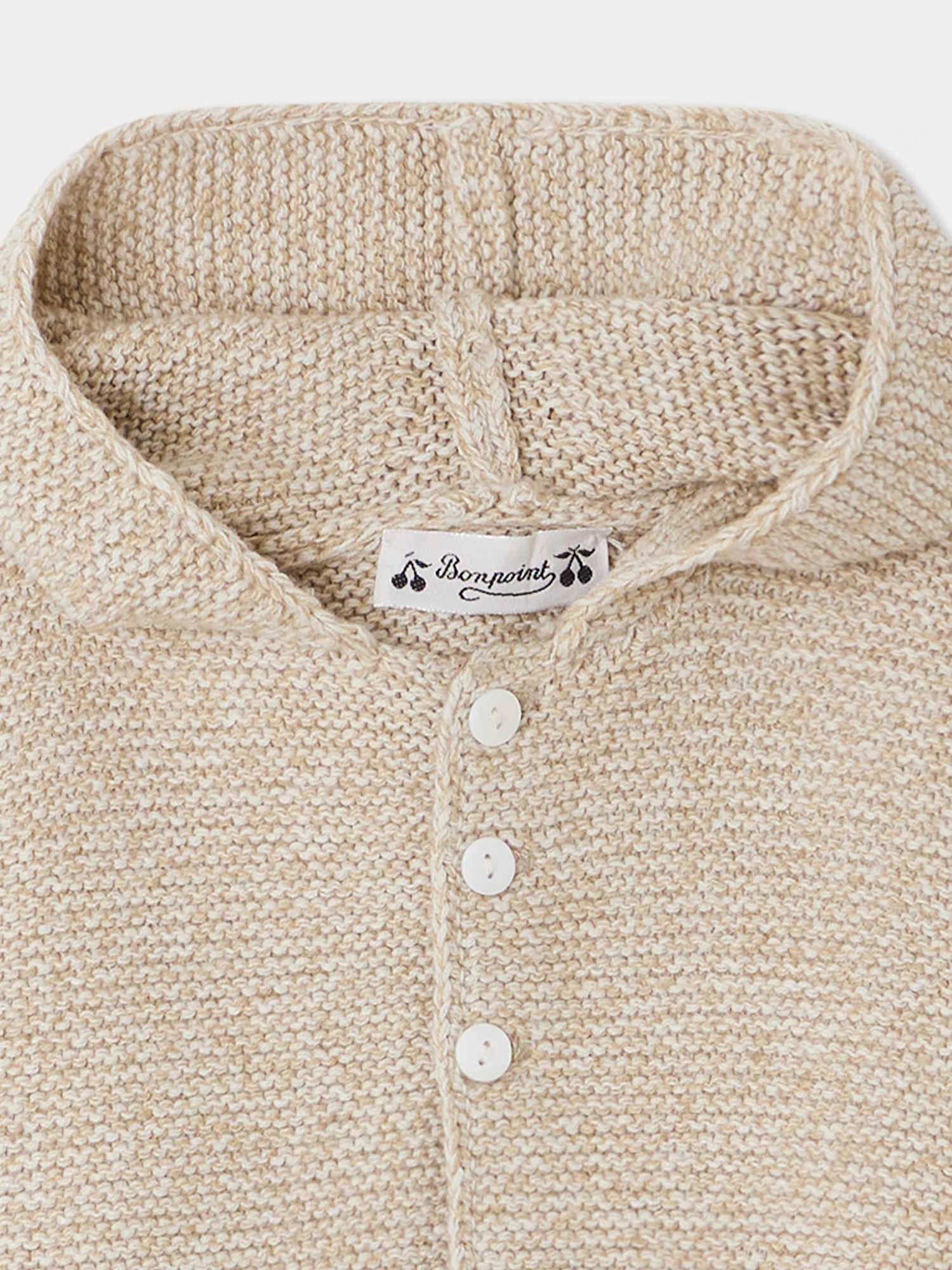 Cette veste à capuche en maille Atexane pour bébé, conçu en en laine et coton mélangé, se ferme grâce à trois délicats boutons nacrés. Sa conception en tricot point mousse élastique le rend facile à enfiler. La laine utilisée est certifiée, garantissant le bien-être animal.