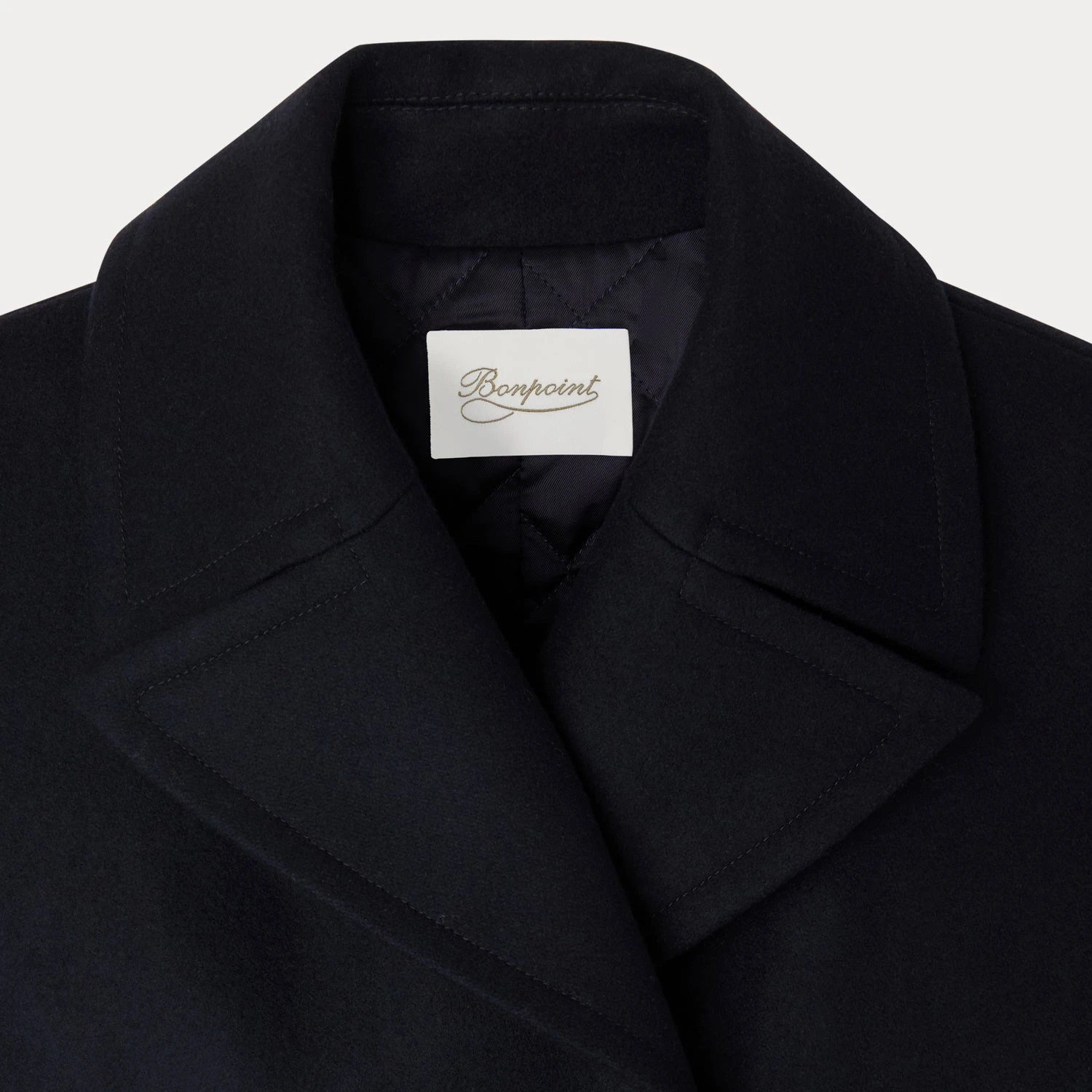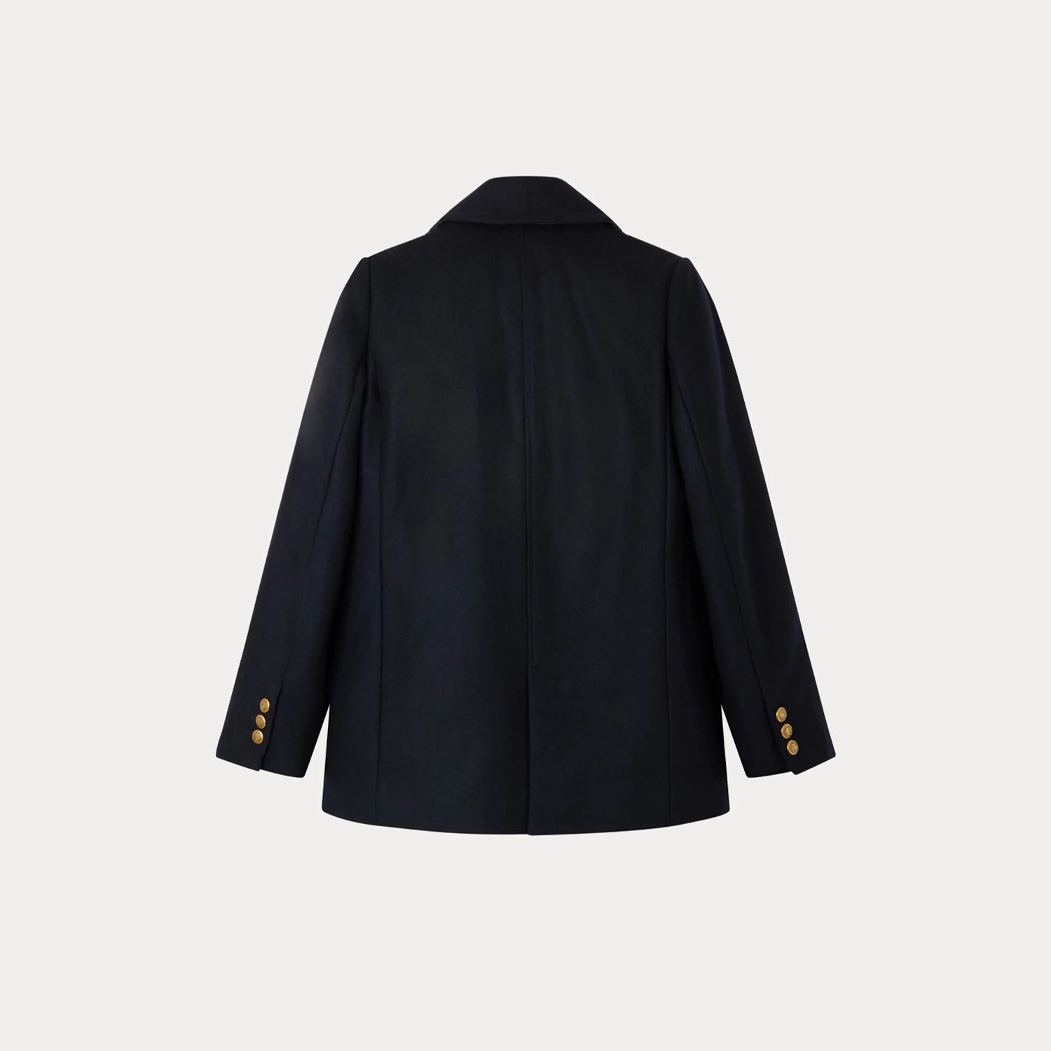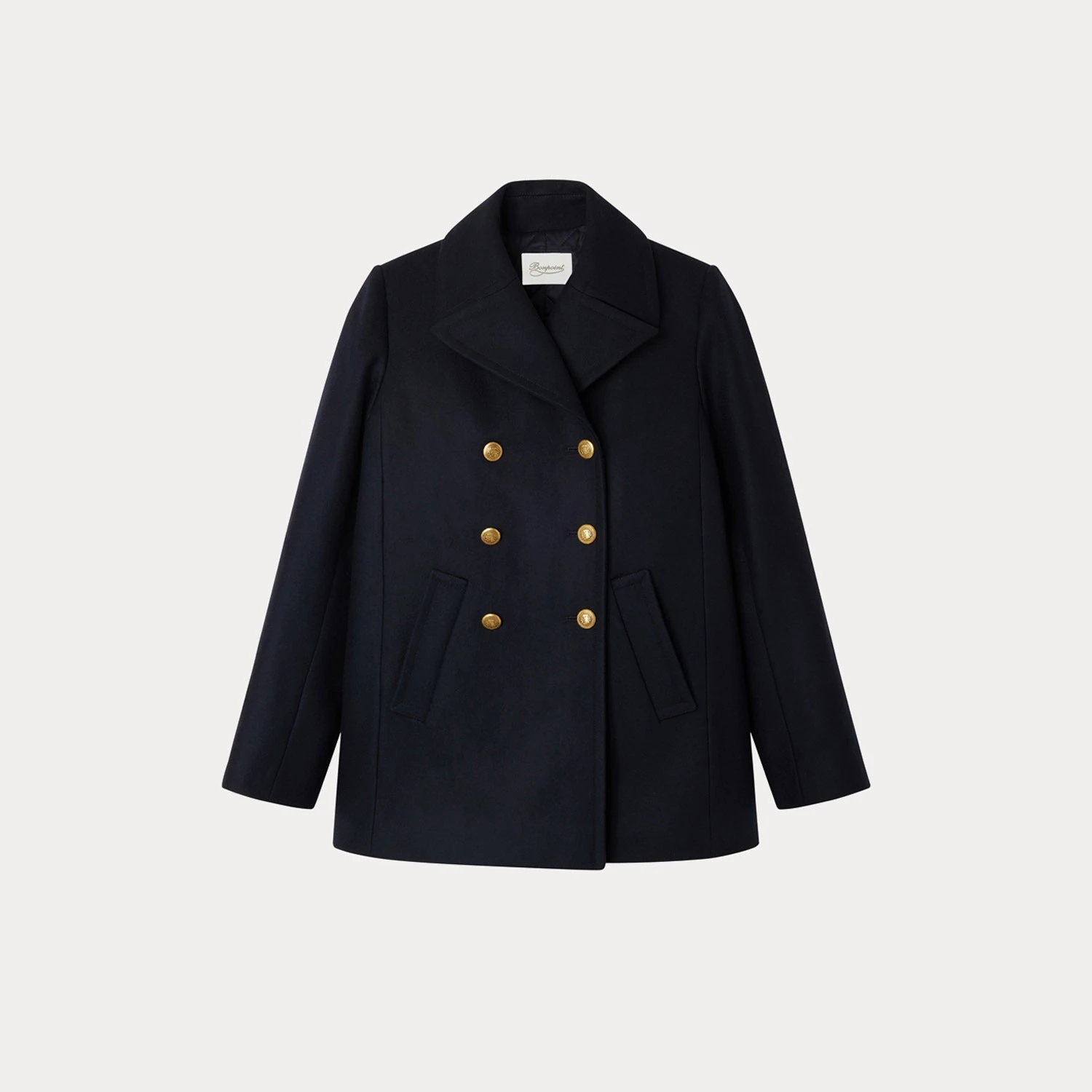 Le caban Lafayette pour femme se démarque par son style officier plein de féminité caractérisé par un double boutonnage contrastant. Les deux poches obliques devant ajoutent une touche pratique.