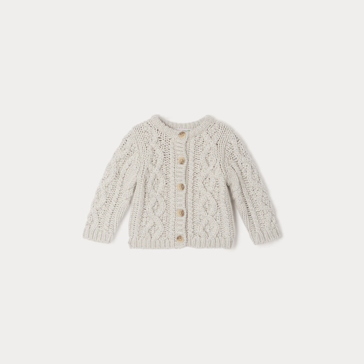 Le cardigan Bartolina pour bébé illustre le savoir-faire artisanal de la Maison avec sa maille à grosse jauge agrémentée de torsades. Des boutons contrastants forment l’ouverture devant.