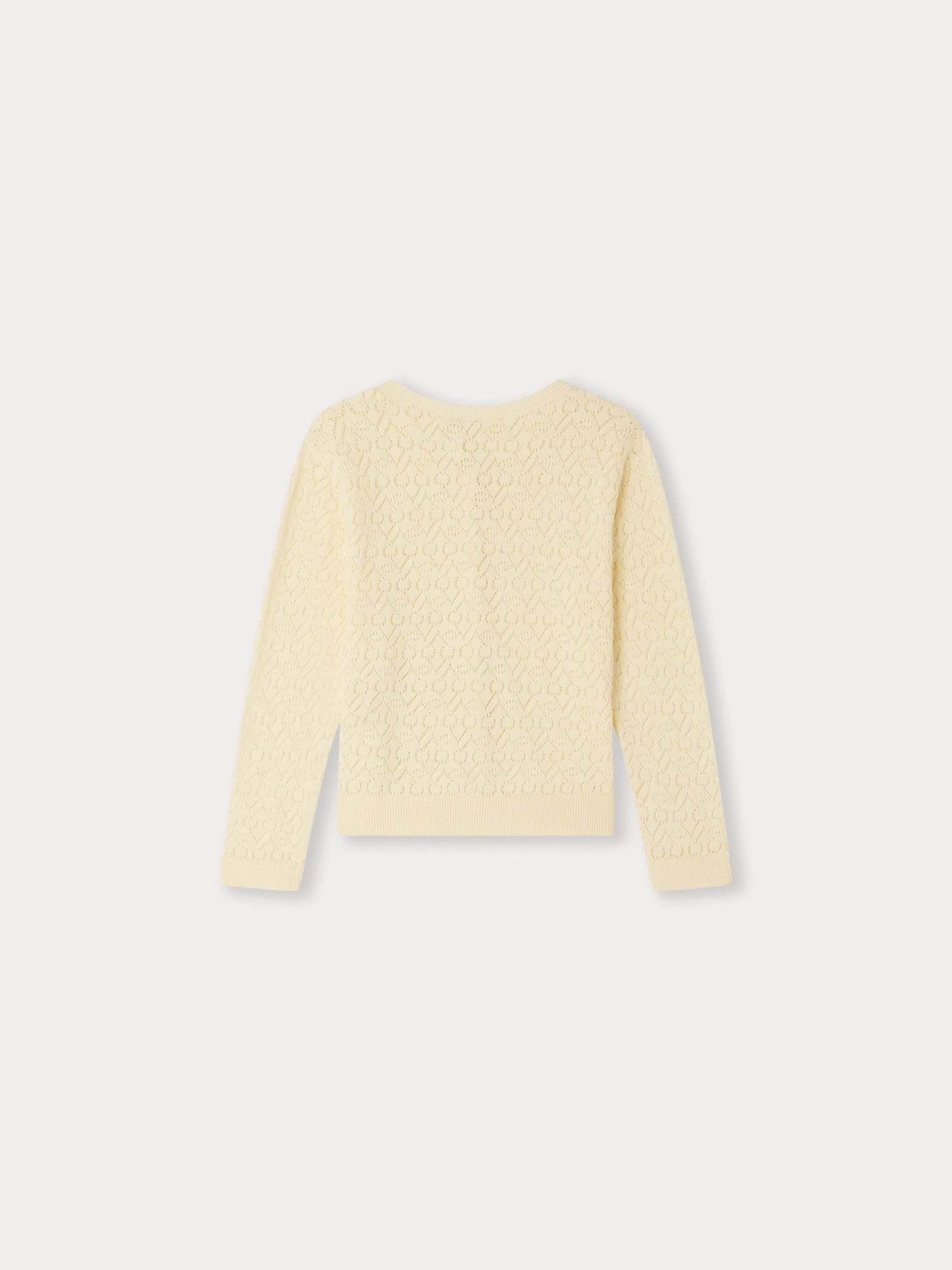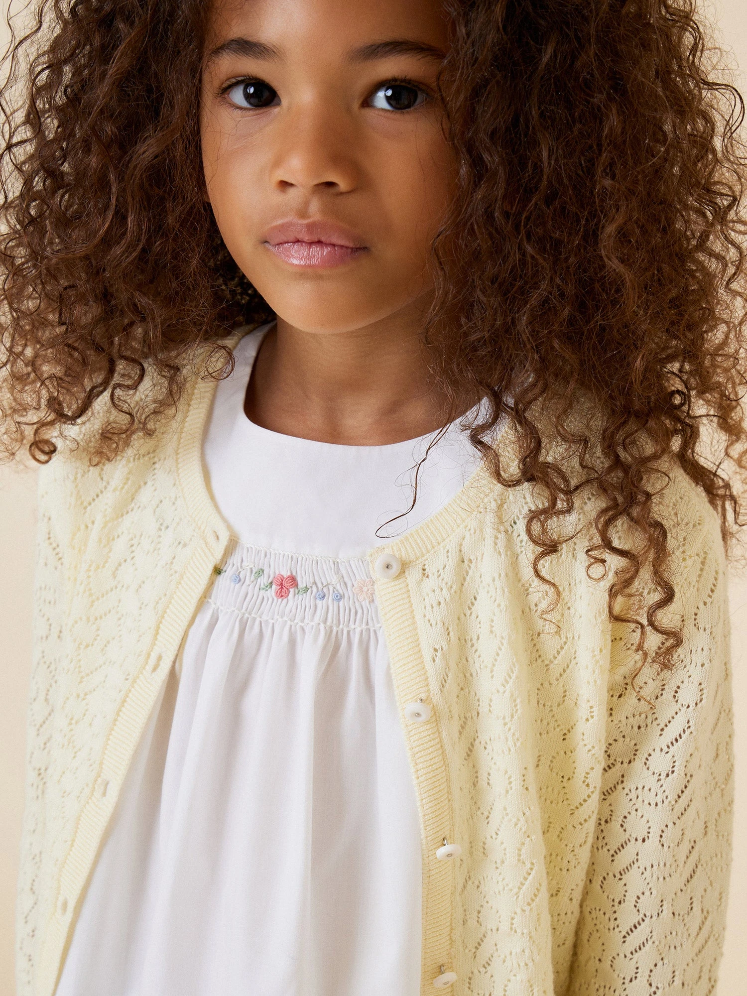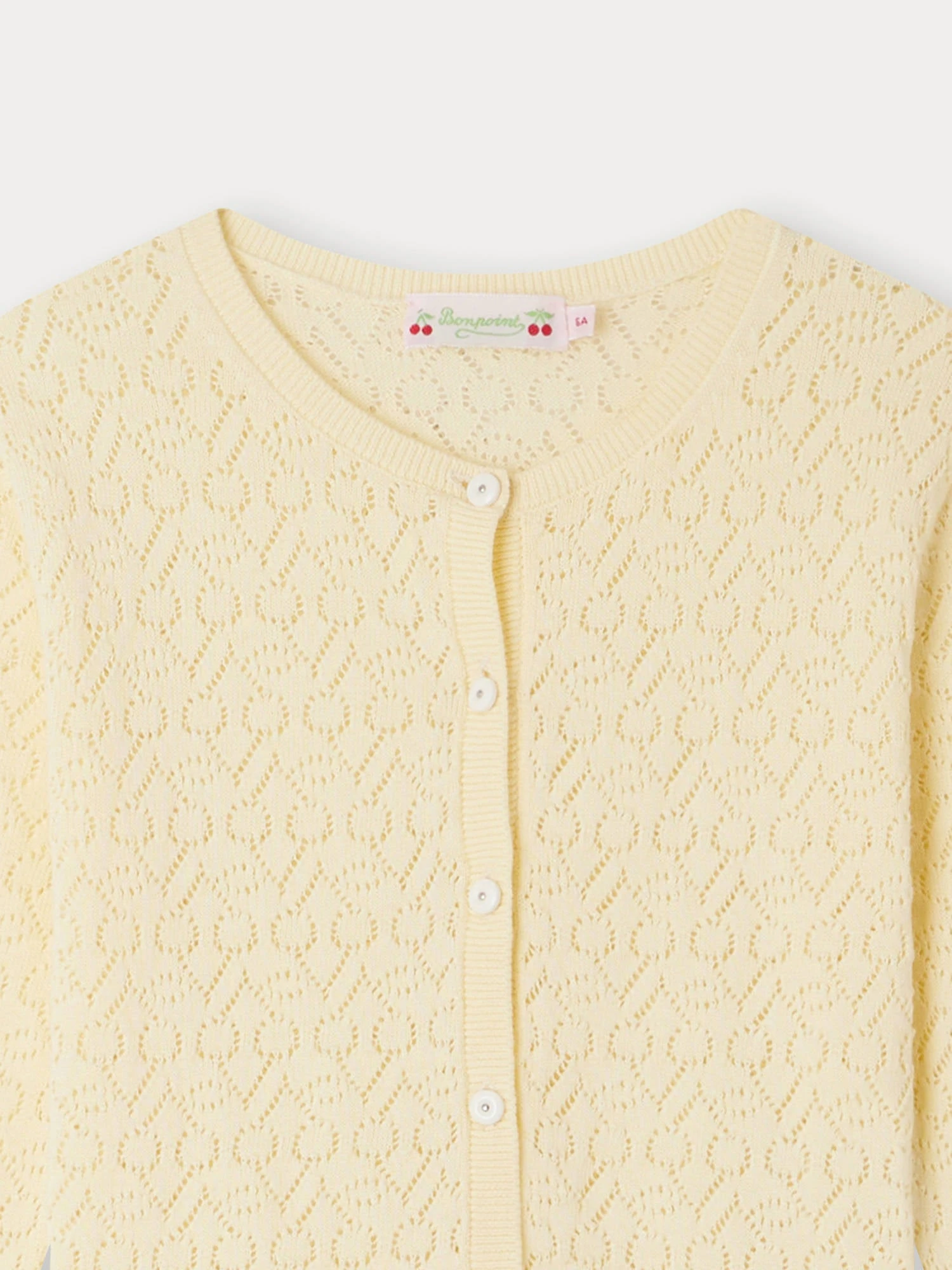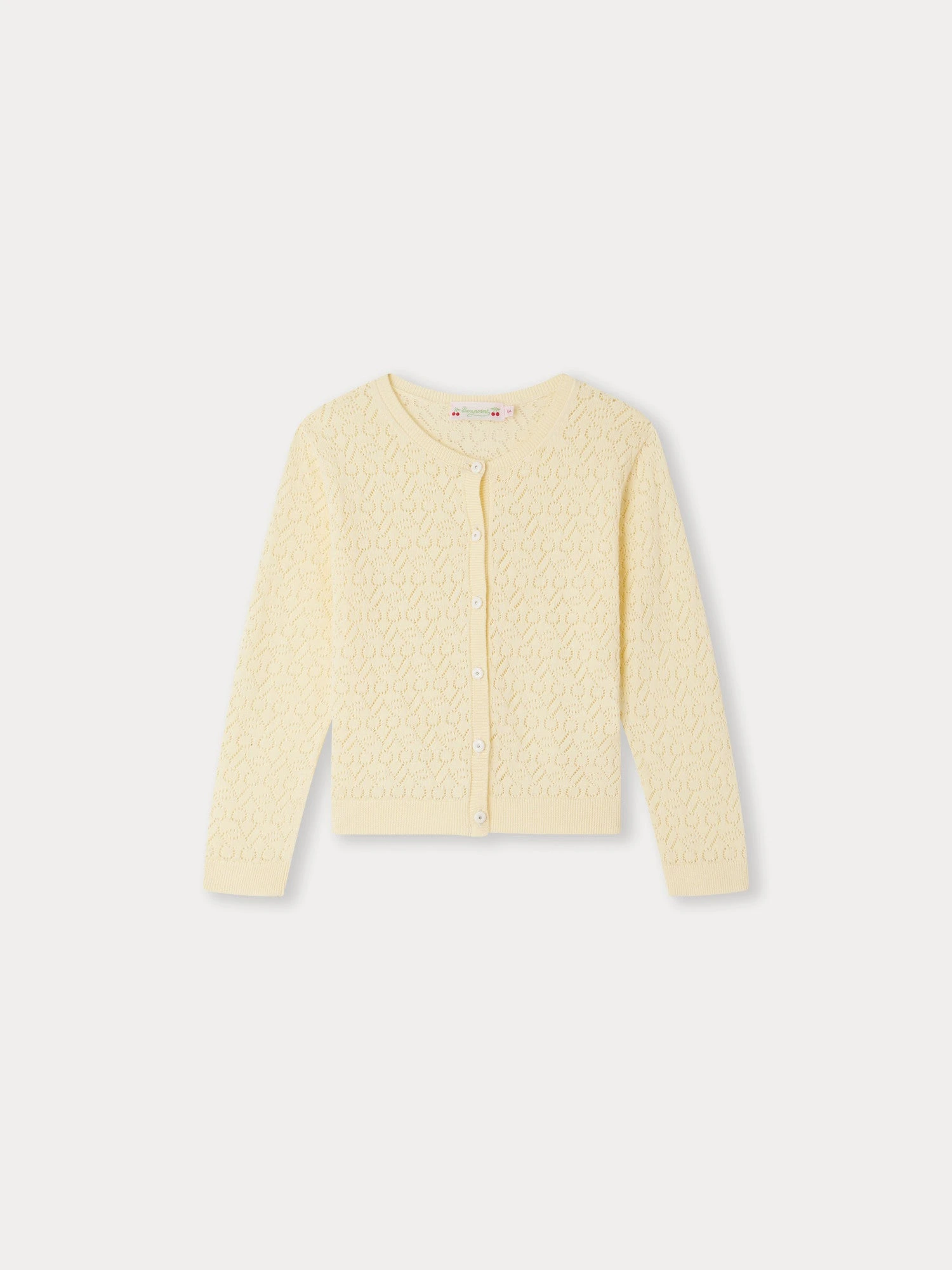 Ce cardigan pour fille Cherry est ravissant avec son motif cerise ajouré sur l’ensemble. Il est confectionné à partir d’une fine maille de coton biologique et est agrémenté de bords-côtes.