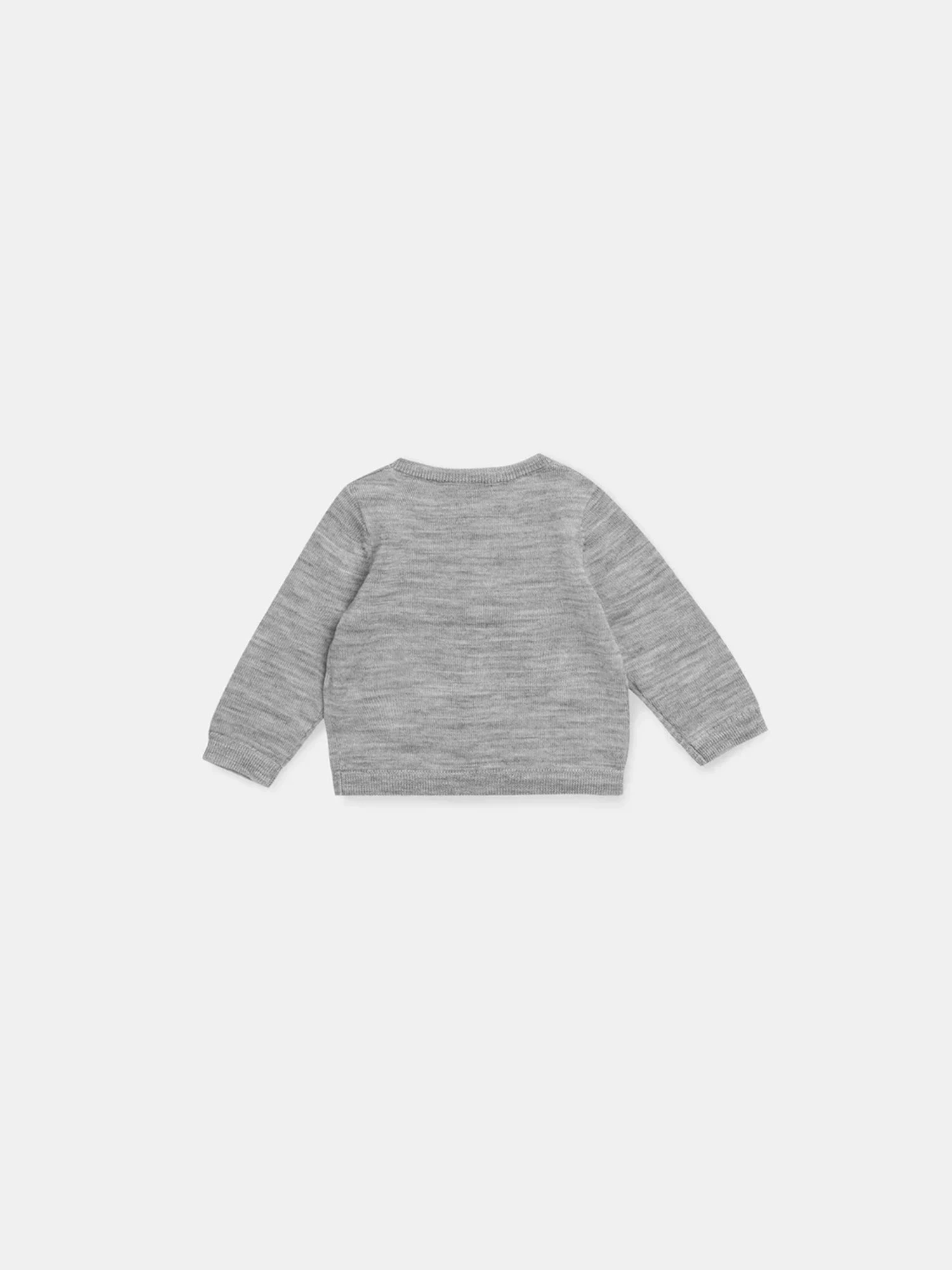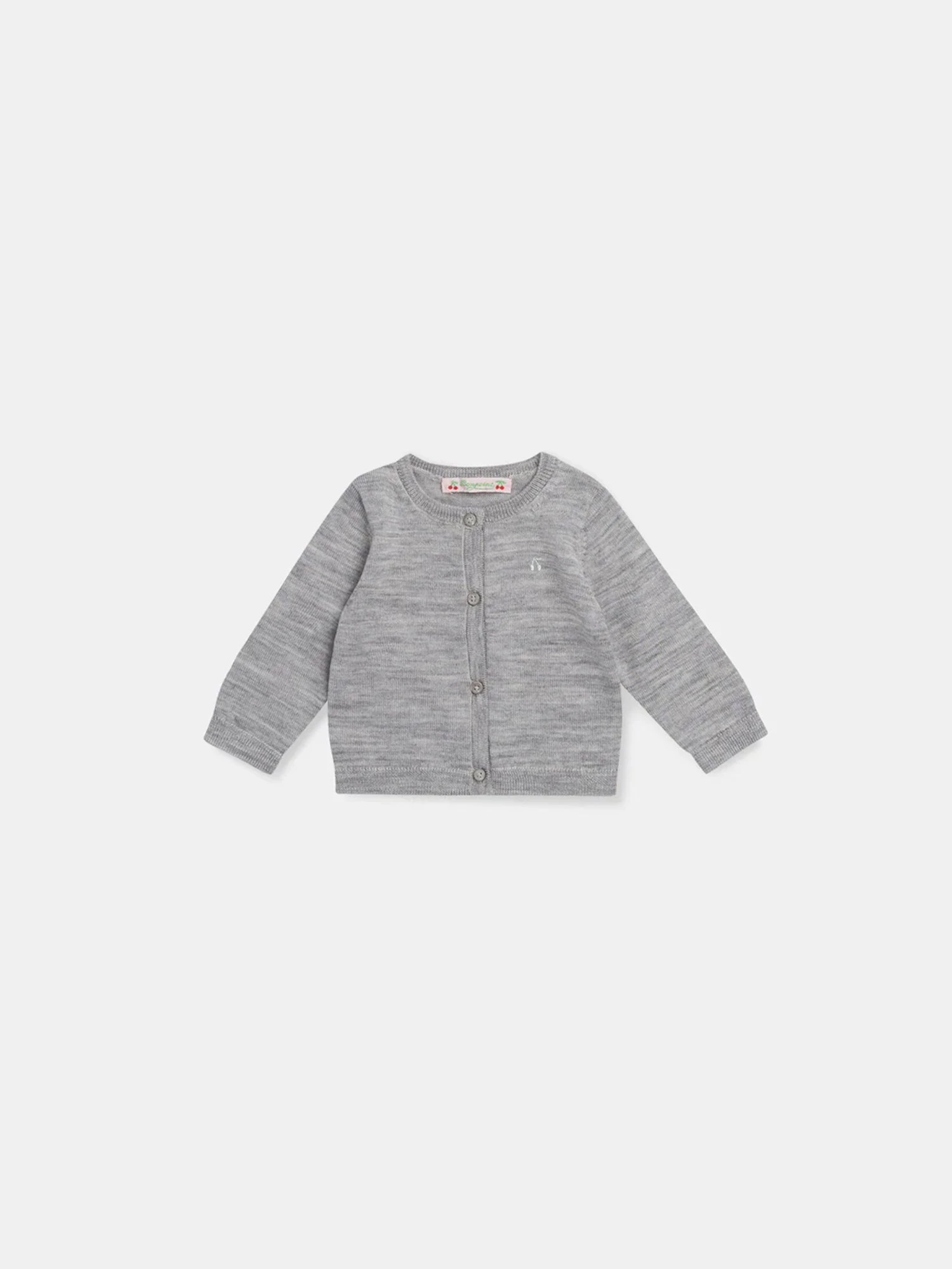 Tout le raffinement de ce cardigan en laine mérinos réside dans sa sobriété. Ce gilet gris chiné clair arbore un col rond. Il peut être porté seul au-dessus d’un body ou ouvert sur une robe ou une chemise.