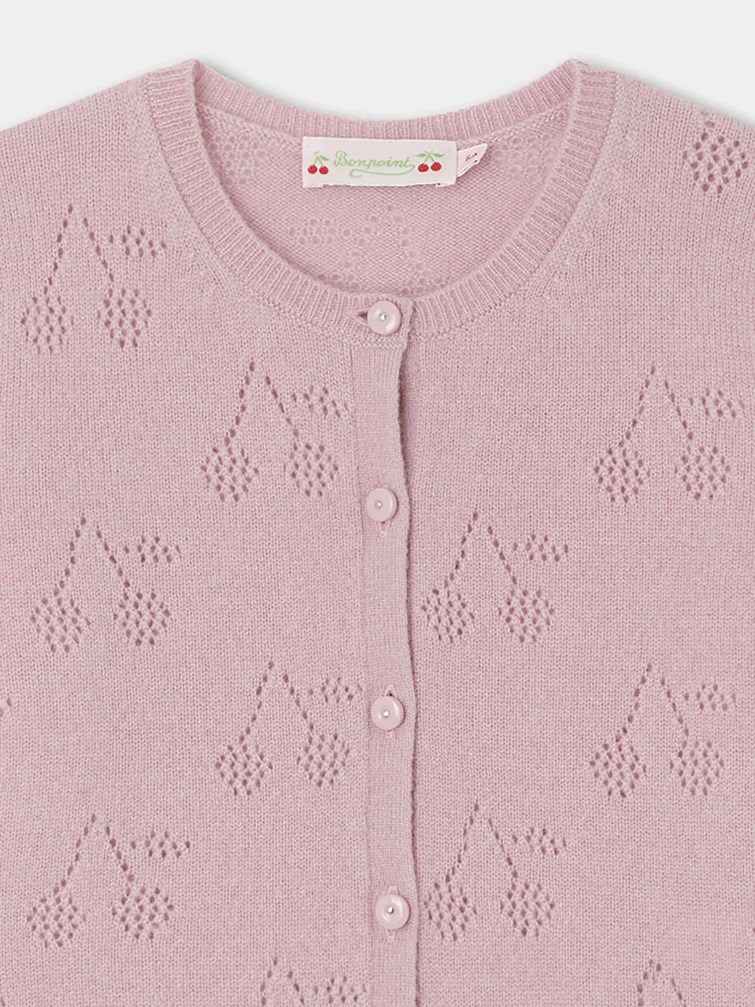 Le cardigan Thindra pour fille se démarque par sa teinte tendre et ses cerises ajourées partout sur le corps et les manches. Ce modèle doux se ferme par des boutons devant.