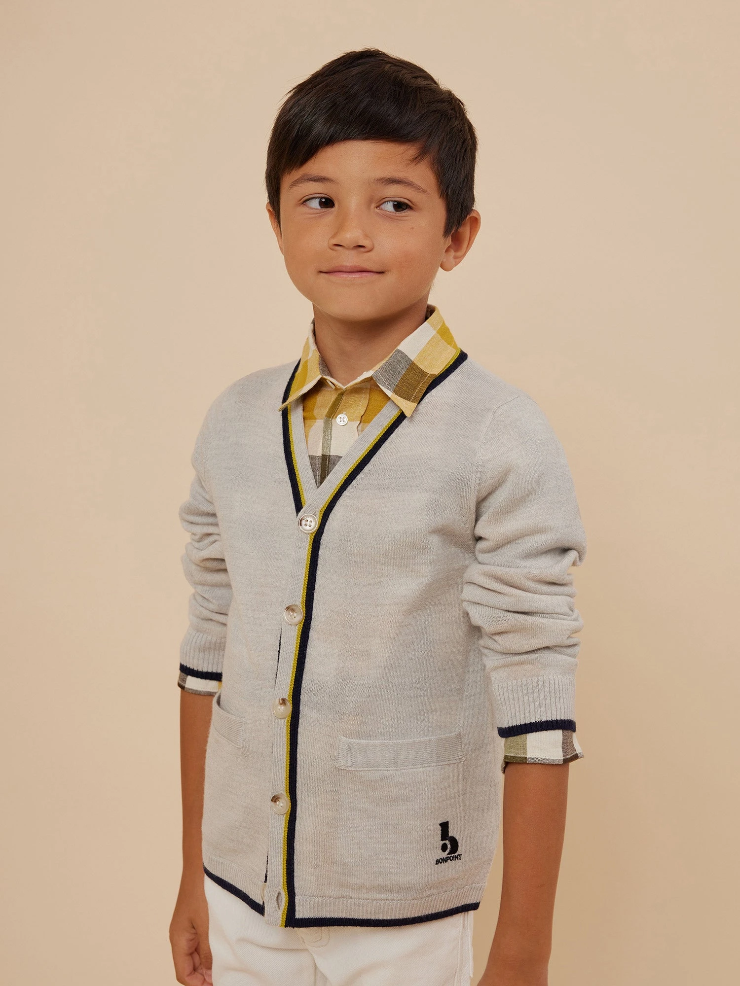 Ce cardigan pour garçon Tilian mise sur l’élégance avec son col V. Il se démarque par ses fines bandes contrastantes et son logo Bonpoint brodé au devant.