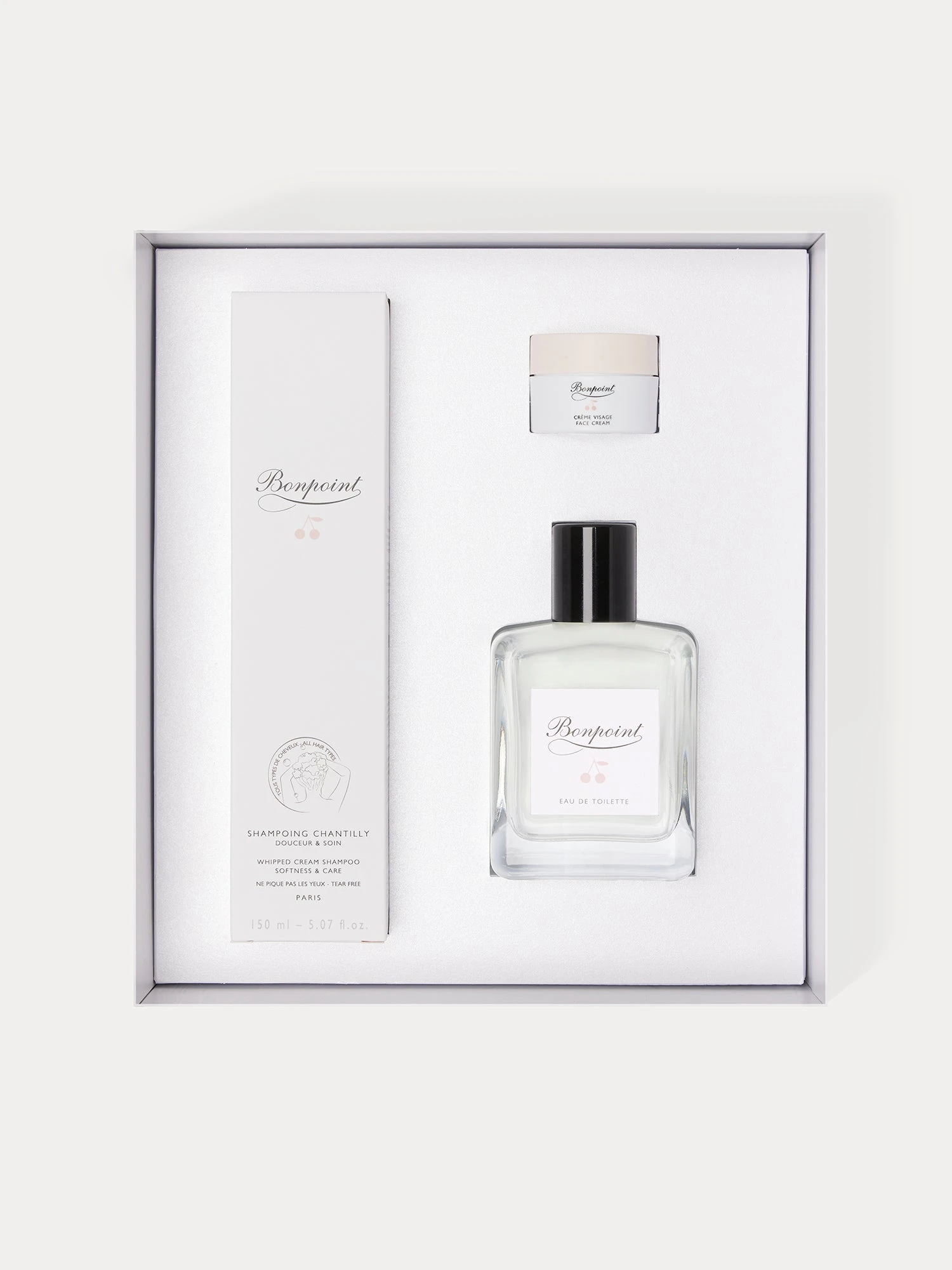 Ce coffret contient l’unique et emblématique Eau de toilette de la maison Bonpoint en format 100 ml ainsi qu’un shampoing chantilly 150 ml à la texture aérienne et crémeuse pour transformer le lavage des cheveux en un moment amusant.