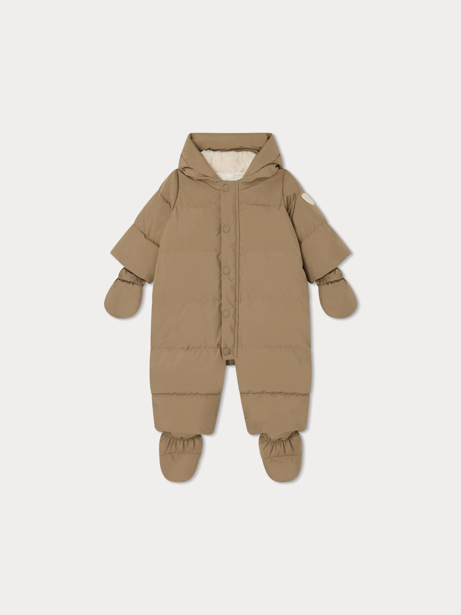 Cette combinaison pilote Tagonfly protège Bébé du froid avec son garnissage en plumes, sa large capuche et ses moufles et chaussons amovibles. Elle est confectionnée à partir de fibres recyclées.