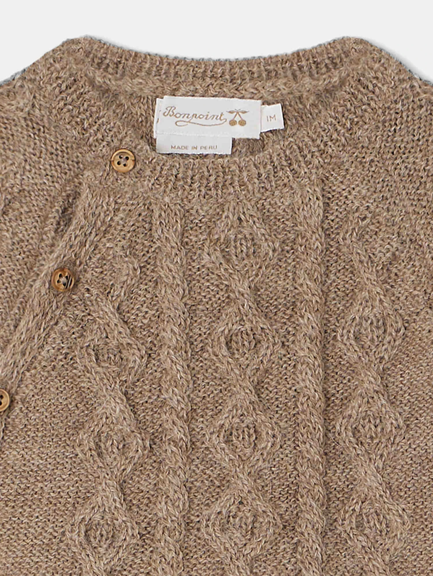 L’ensemble Bergamote pour bébé est gage de chaleur avec sa maille en laine majoritaire certifiée qui garantit le bien-être animal. Le haut se distingue par un très joli jeu de torsades.