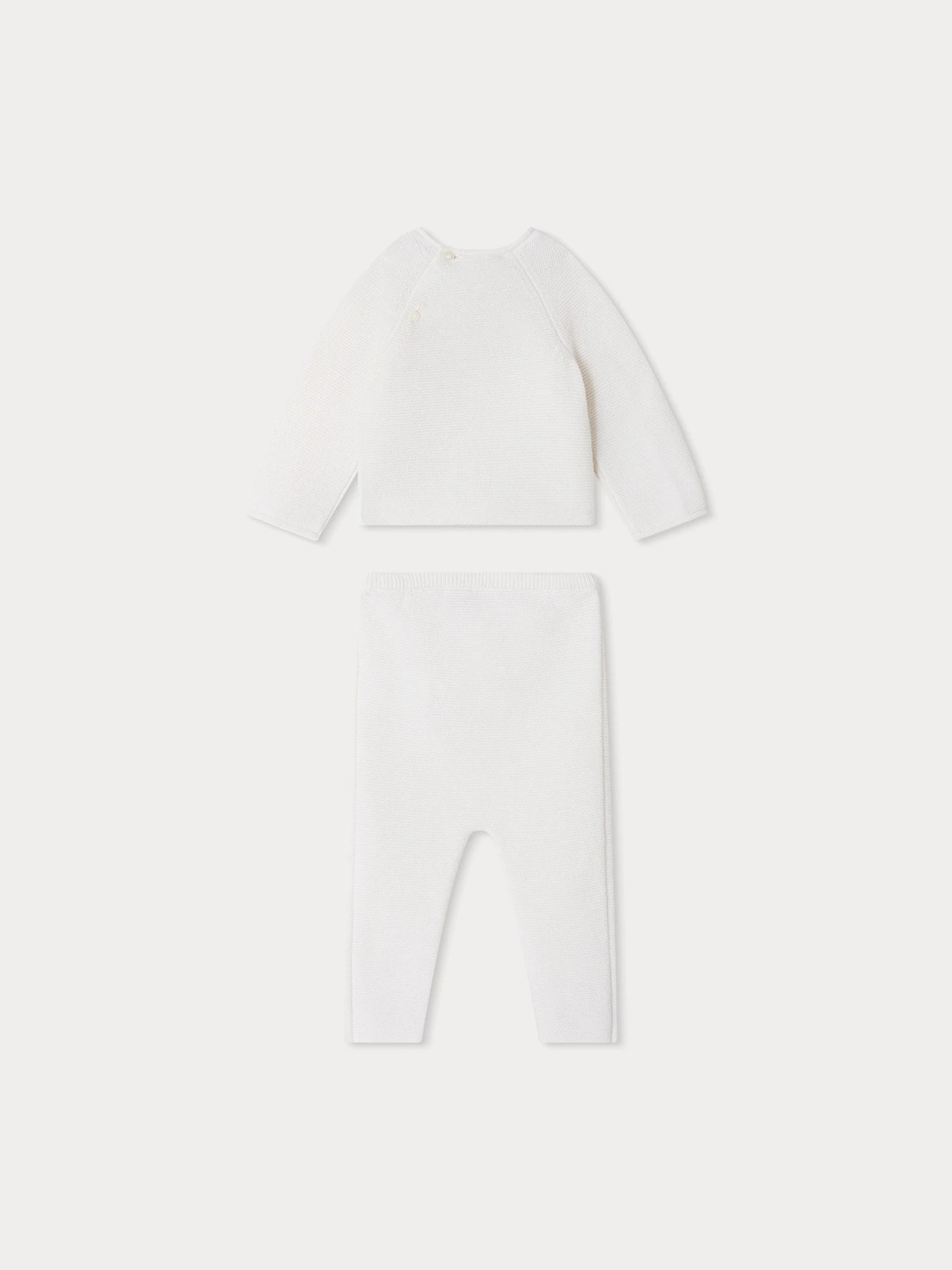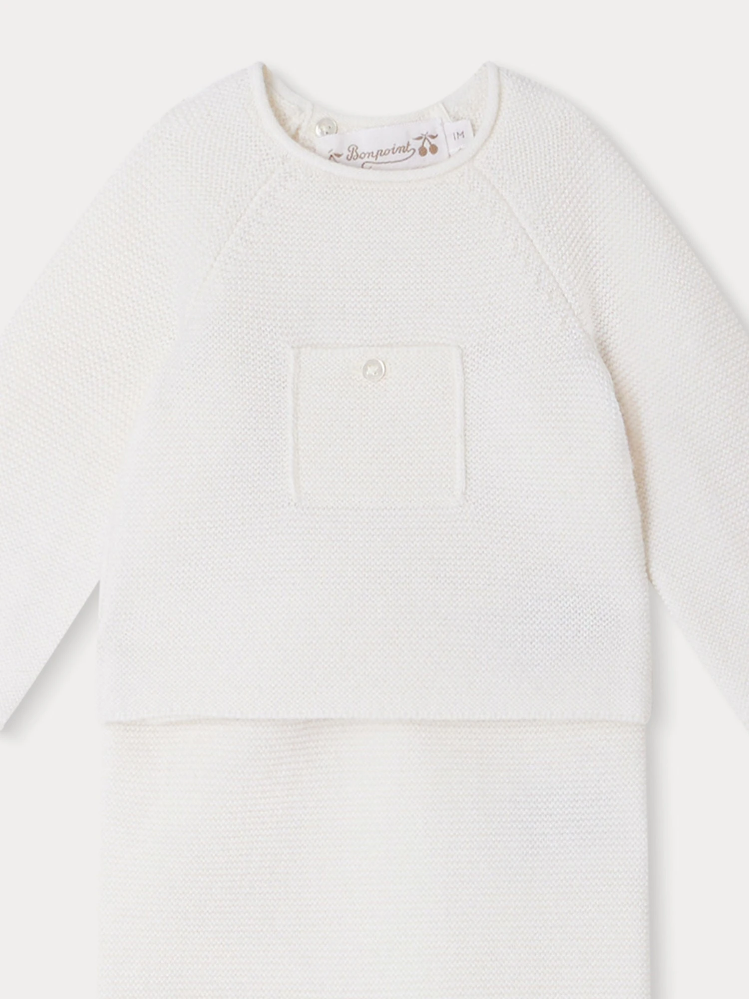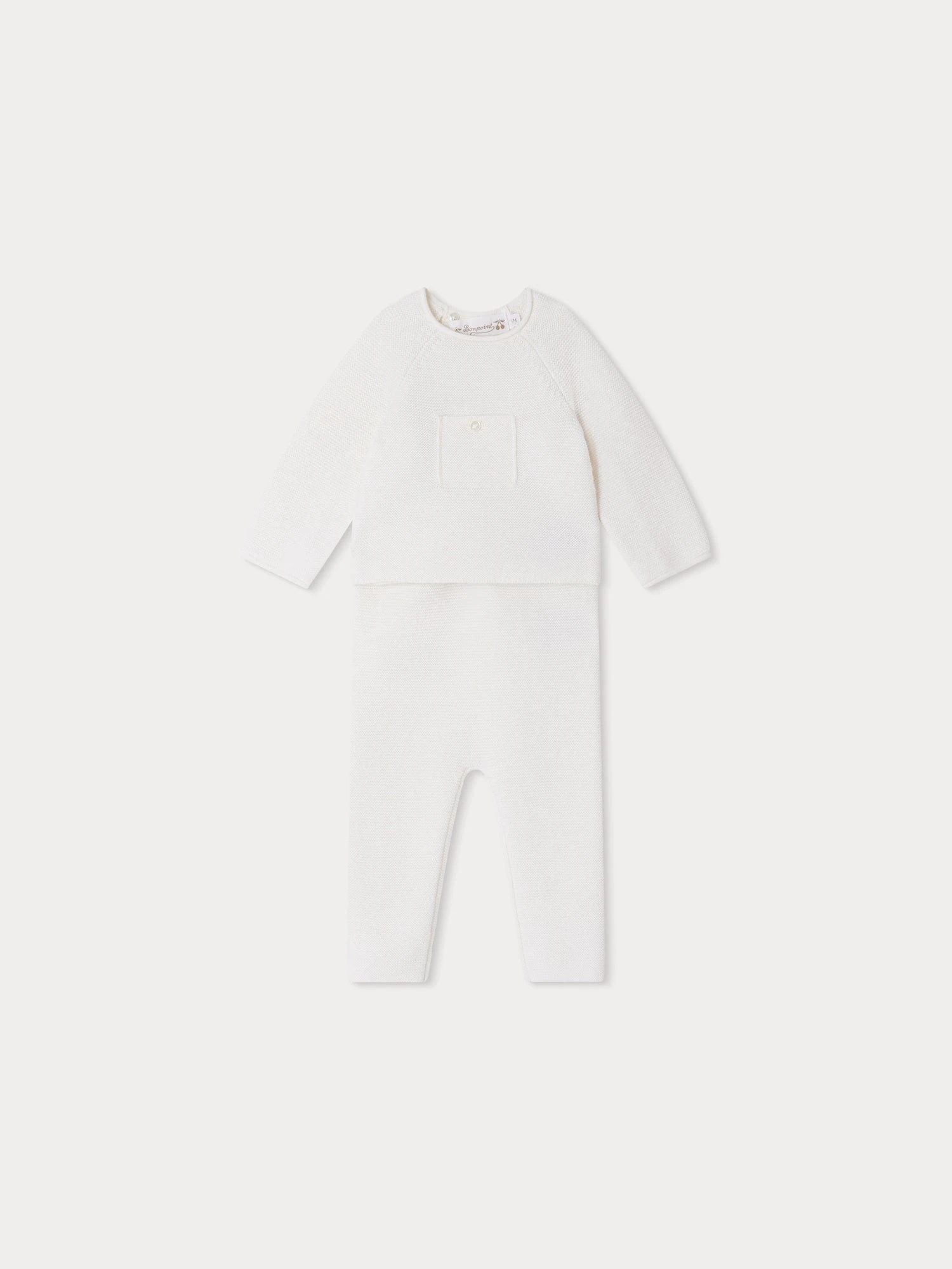 L’ensemble Den pour bébé mise sur la douceur avec sa conception en tricot mélangeant laine et coton. Il se démarque par sa poche plaquée et boutonnée sur la poitrine.