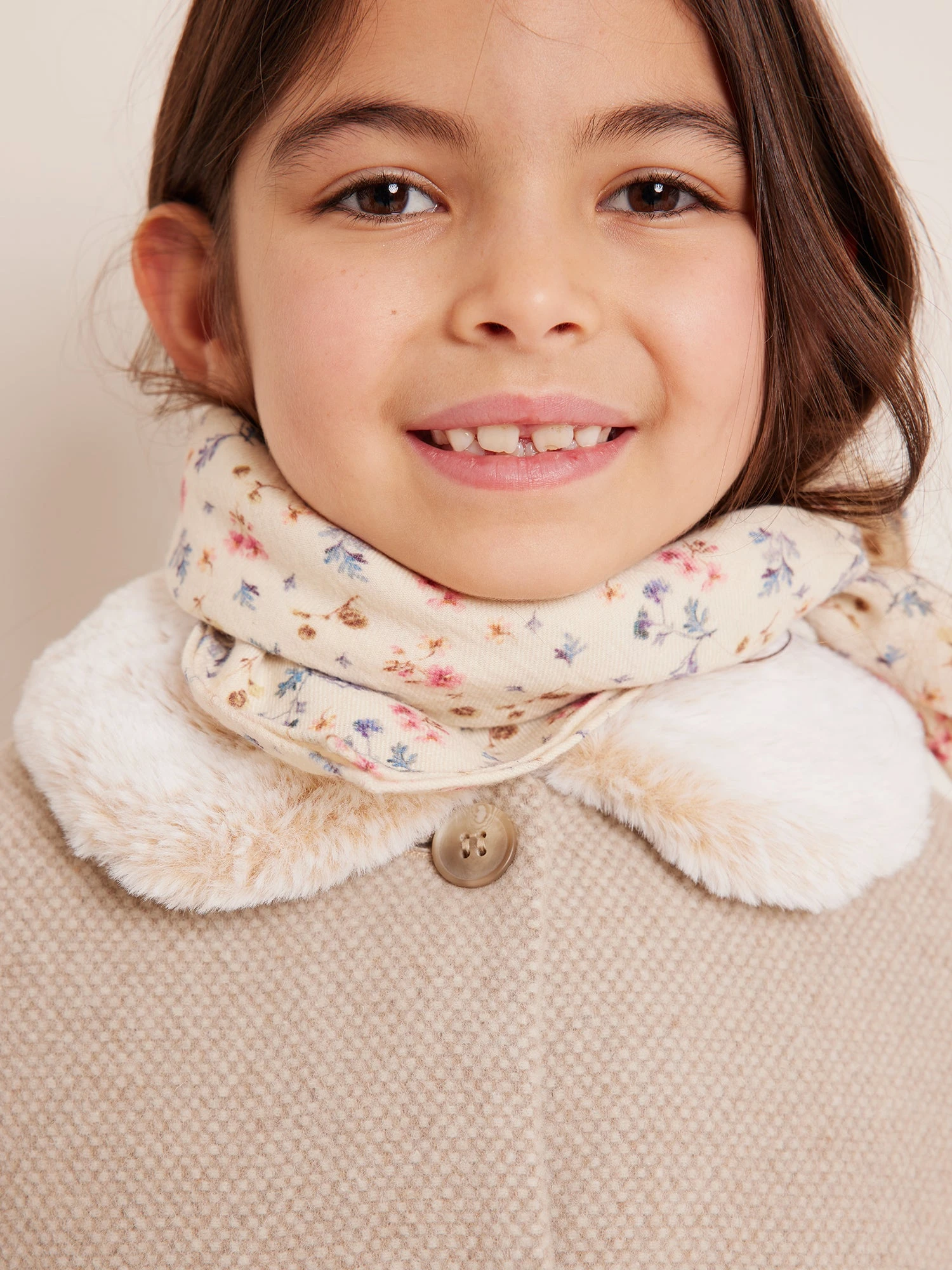 Décliné en laine mélangée et coton, ce foulard Cayati pour fille se pare d’un semis de fleurs colorées. Cet incontournable de la Maison est facile à assortir.