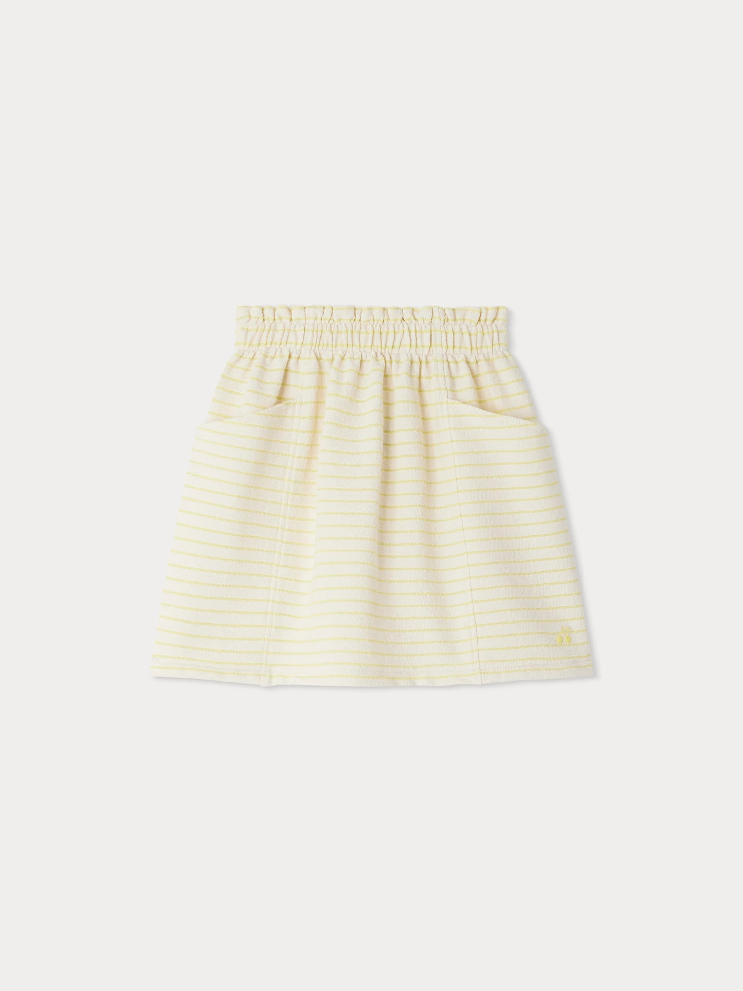 La jupe Felicitee, entièrement en jersey rayé avec des nuances irisées, apporte une note décontractée à la tenue des filles. La cerise emblématique est discrètement brodée en ton sur ton au bas de la jupe.