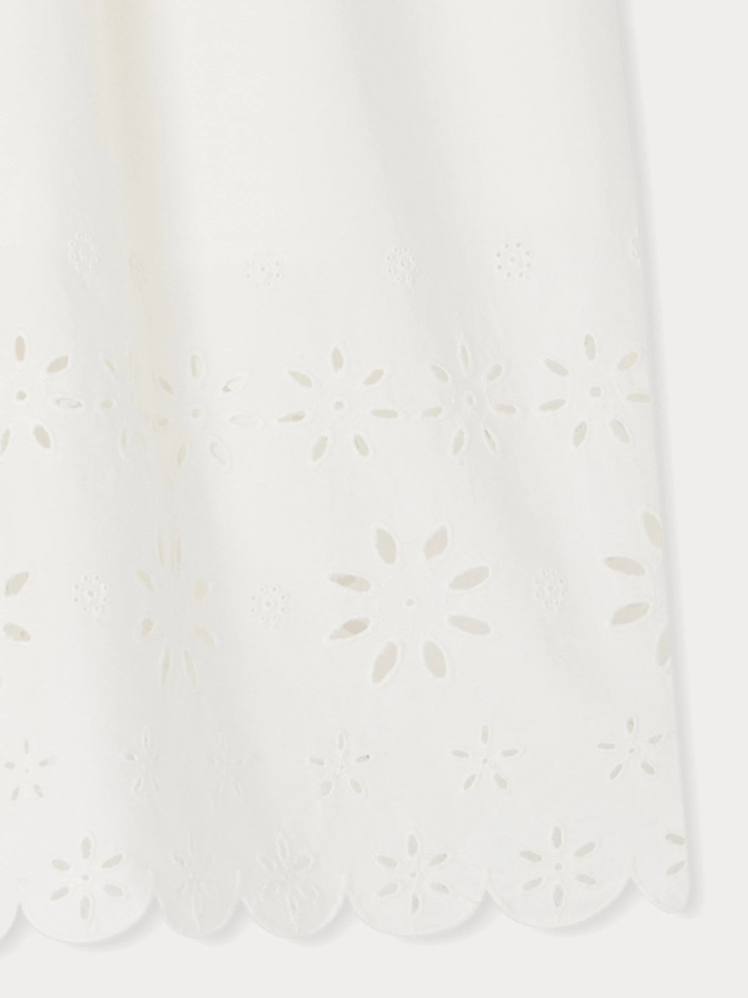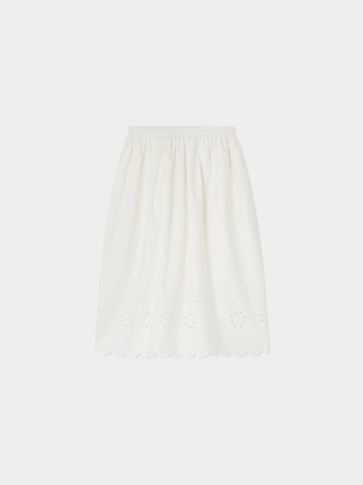 La jupe Flora habille les filles pour les cérémonies avec sa coupe longue à la base festonnée. Des détails fleuris en broderie anglaise subliment le bas de ce modèle uni.