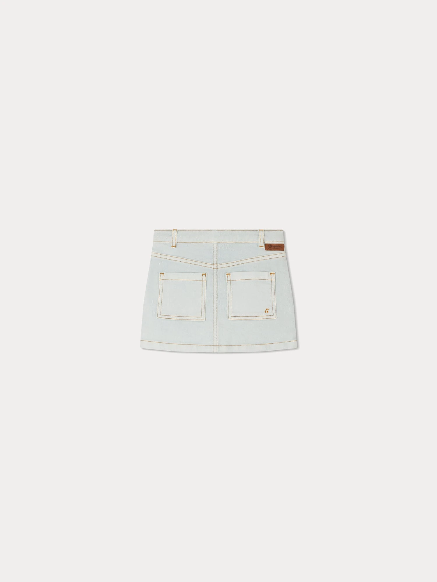 La jupe Gretel pour fille réinterprète l’incontournable mini jupe en jean avec ses boutons-pression métallisés sur le devant. Une broderie emblématique Bonpoint assortie aux finitions surpiquées crée le contraste.