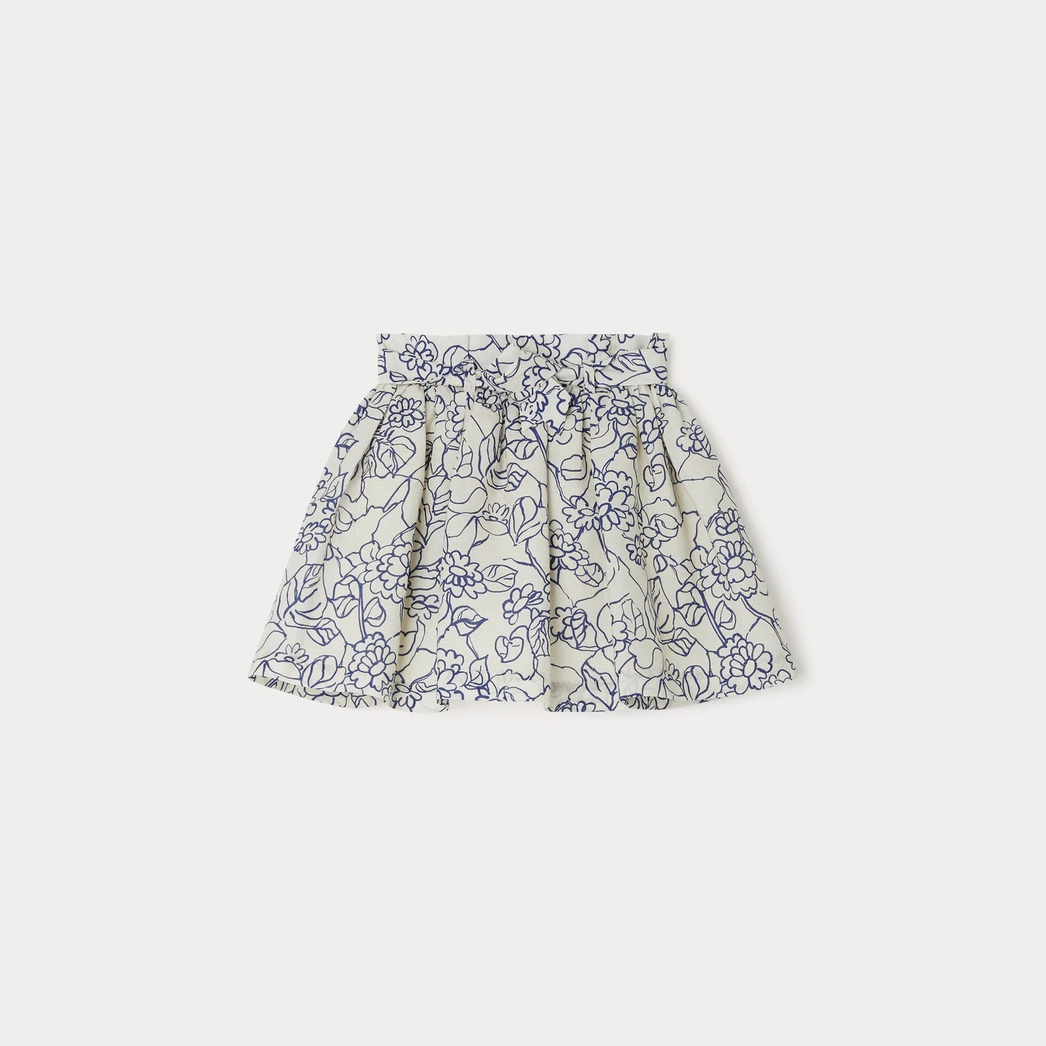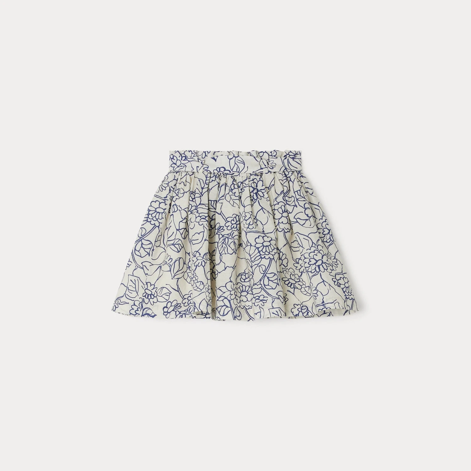 La jupe Tuie confère légèreté et mouvement à la tenue des filles avec sa coupe évasée et ses fronces sous la taille. Son imprimé bicolore dessine de charmantes fleurs au style naïf.