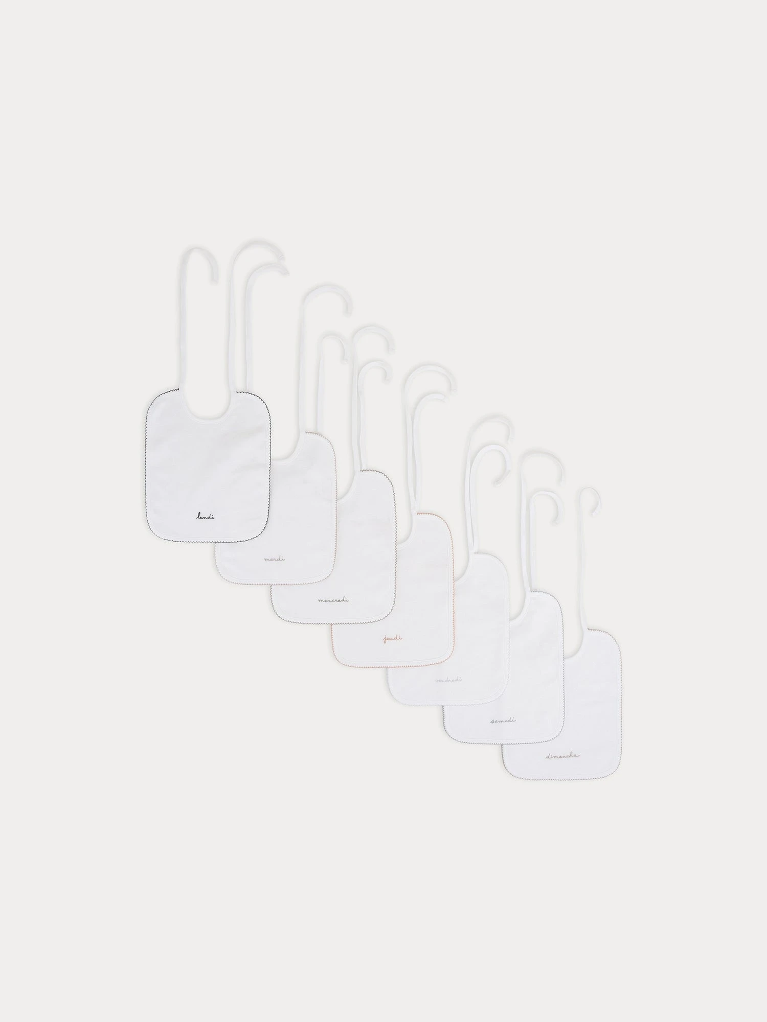 Avec ce lot de bavoirs, bébé découvre les saveurs jour après jour. En coton à côtes, ils arborent chacun une couleur différente au niveau du contour, et une délicate broderie pour chaque jour de la semaine.