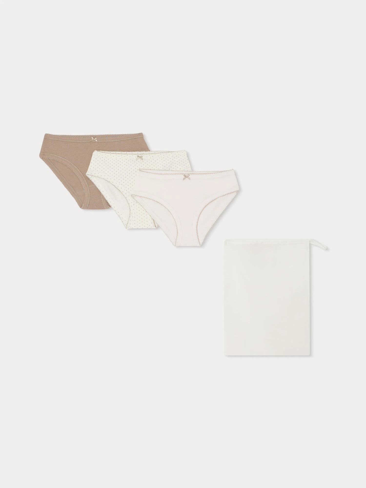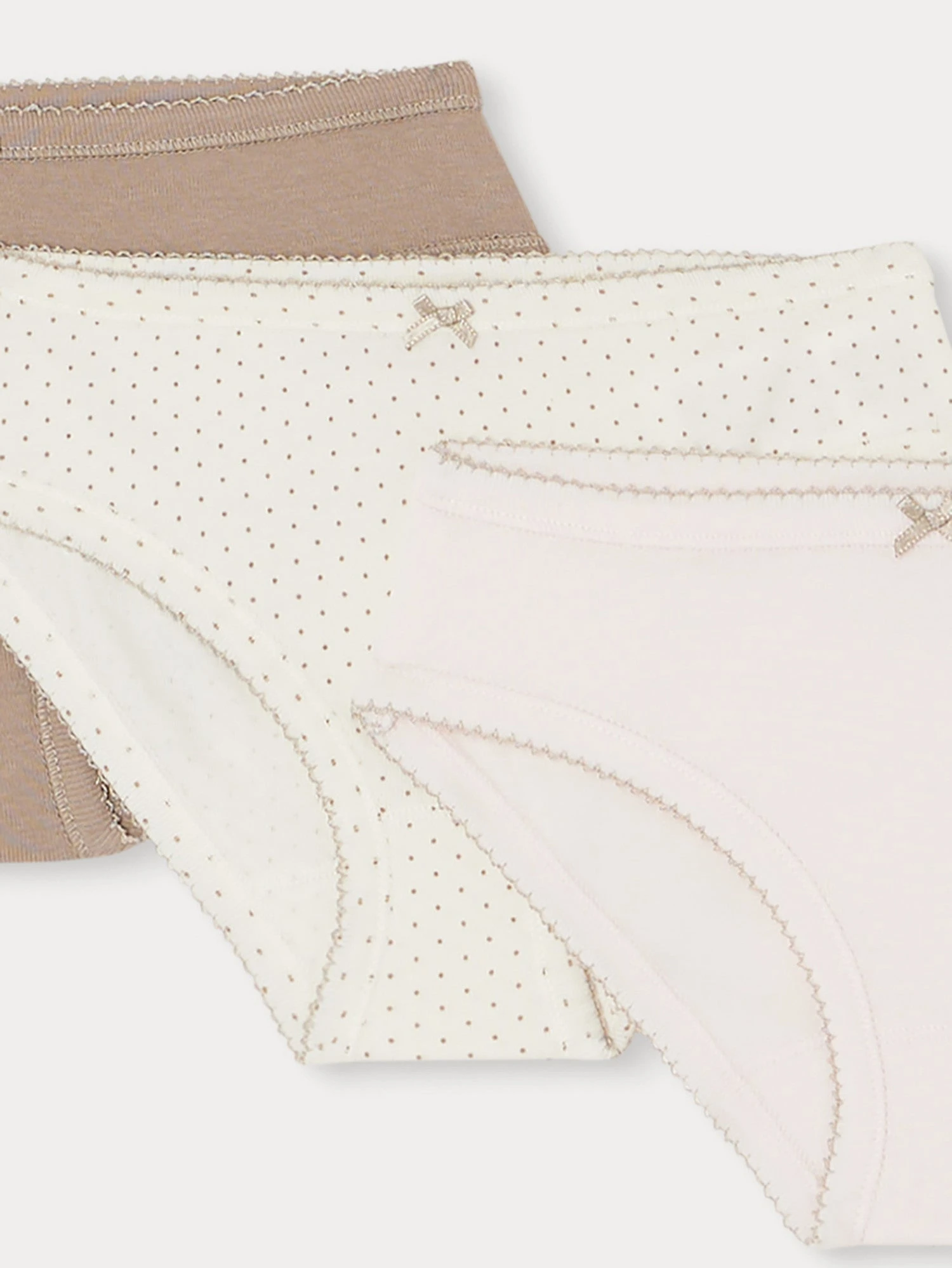 En coton biologique doux, ce lot de culottes Aubree pour fille comprend deux modèles unis et un à pois. Ces dessous assortis sont finis de picots délicats et d’un petit nœud satiné à l’avant.