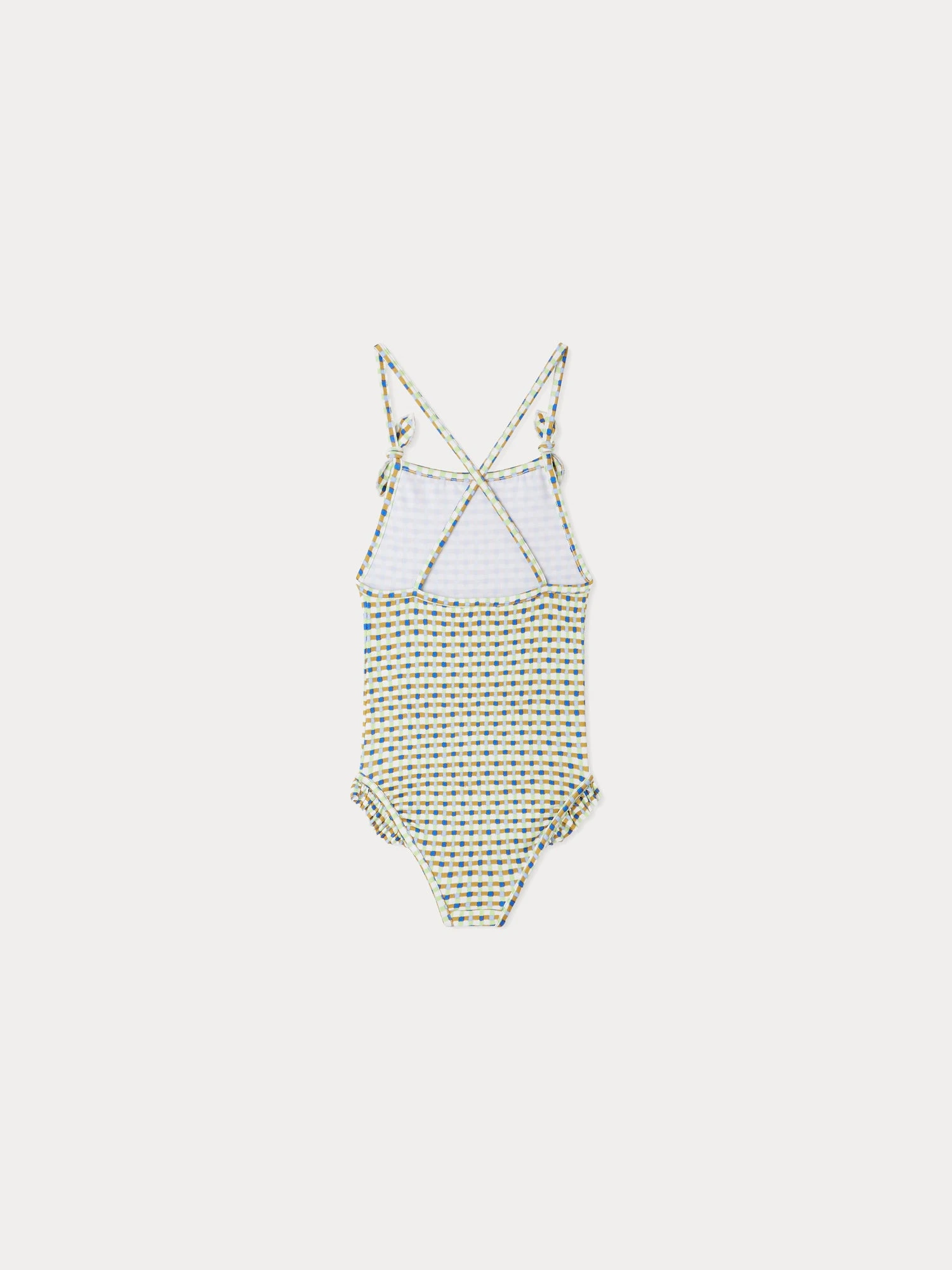 Imprimé d’un motif vannerie multicolore sur l’ensemble, le maillot de bain une pièce Abbie pour fille dispose de bretelles croisées au dos, de nouettes et de finitions volantées. Ce modèle est entièrement conçu en matière recyclée.
