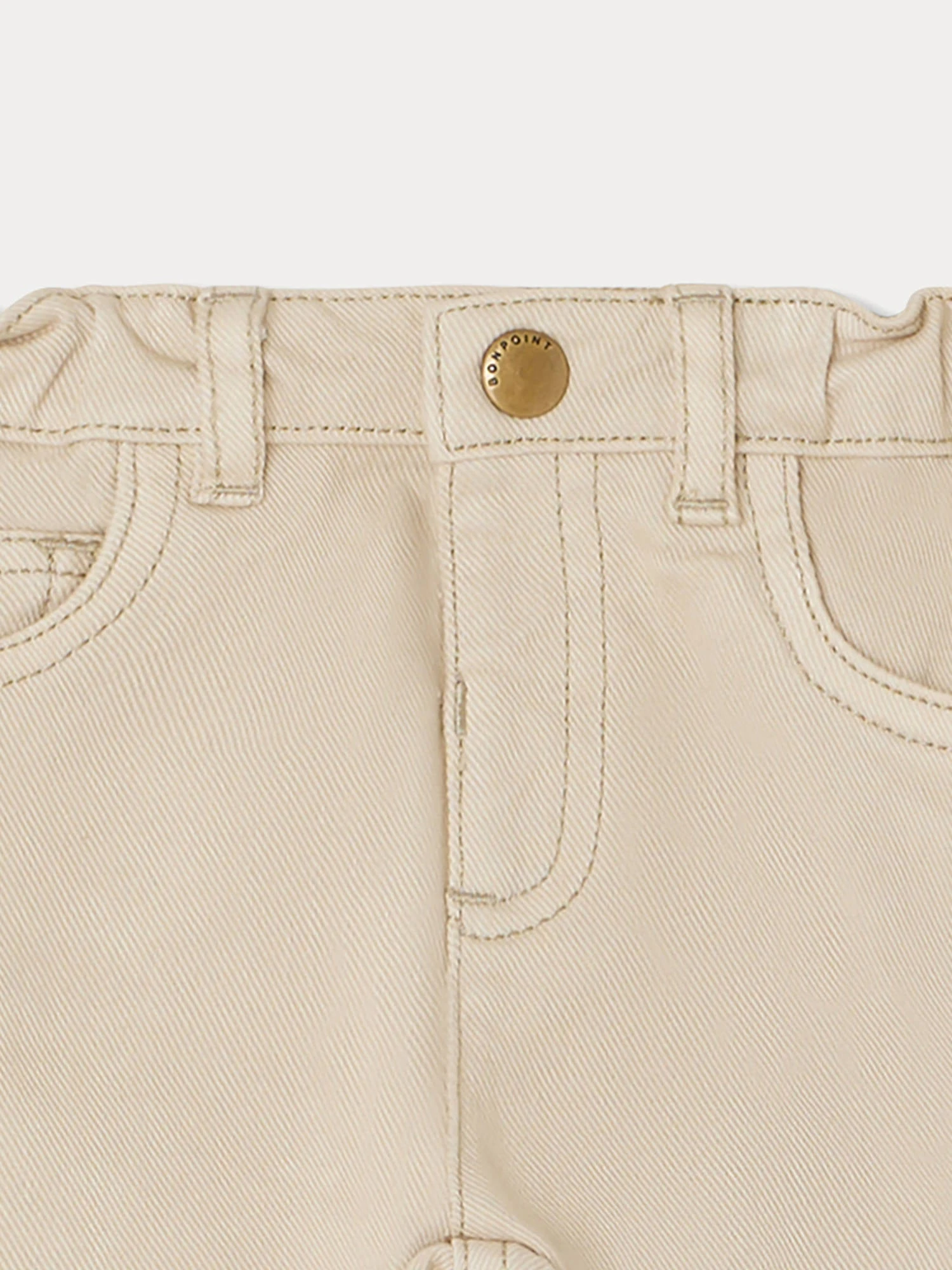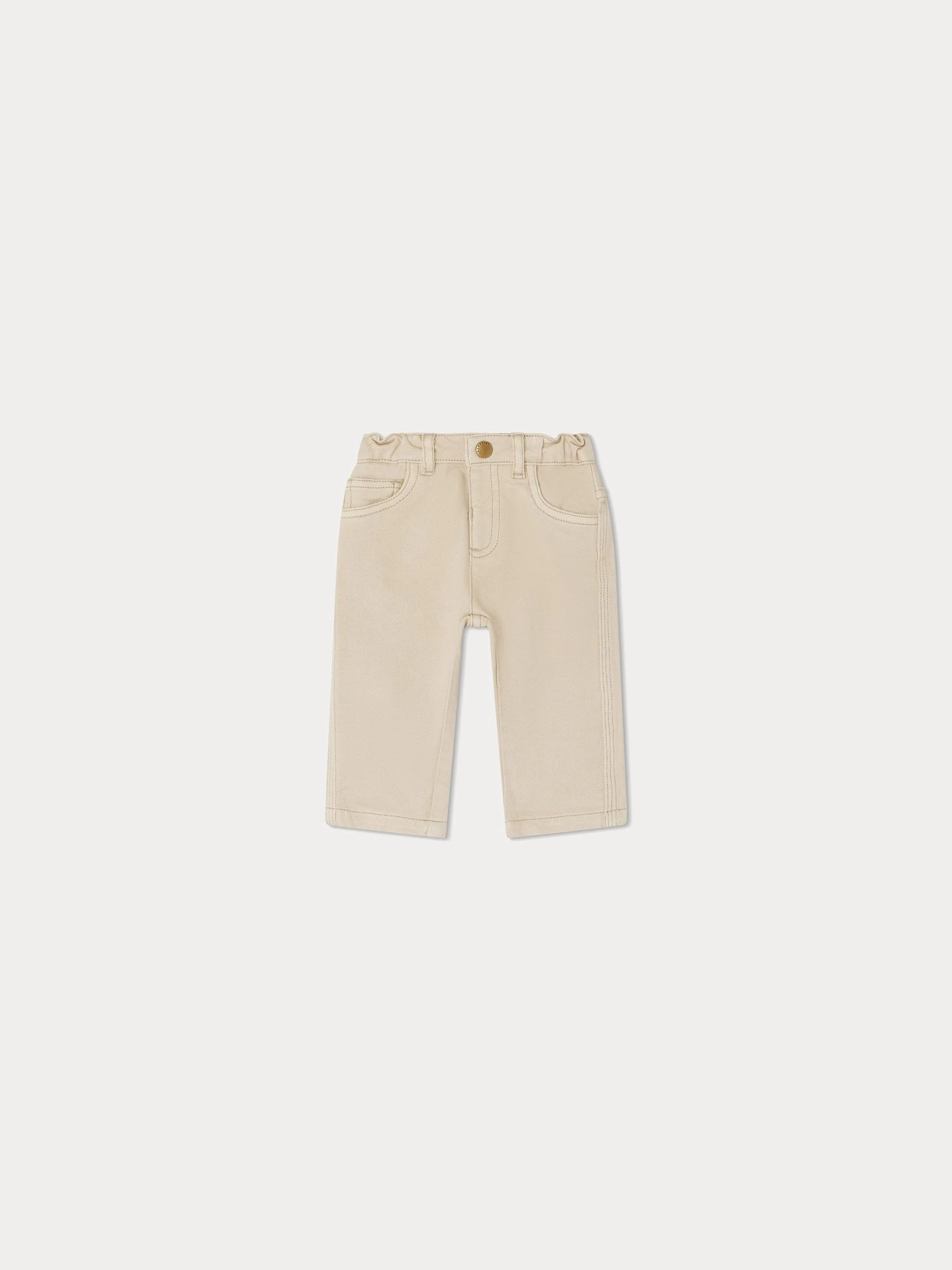 Ce pantalon pour bébé Cookie est élégant avec sa coupe droite à cinq poches et son jacron Bonpoint au dos. Sa confection a utilisé des techniques de teinture peu consommatrices d’eau.