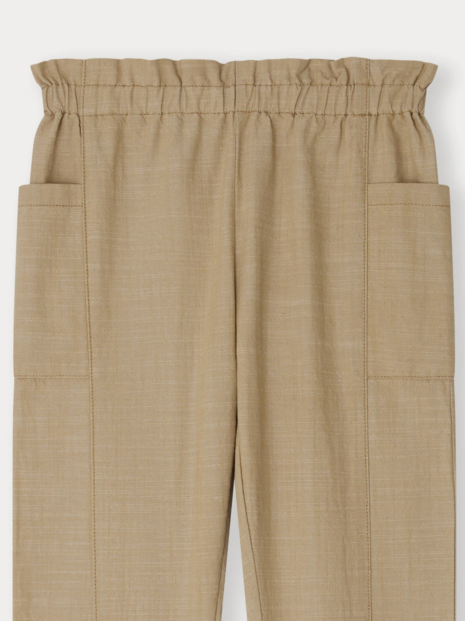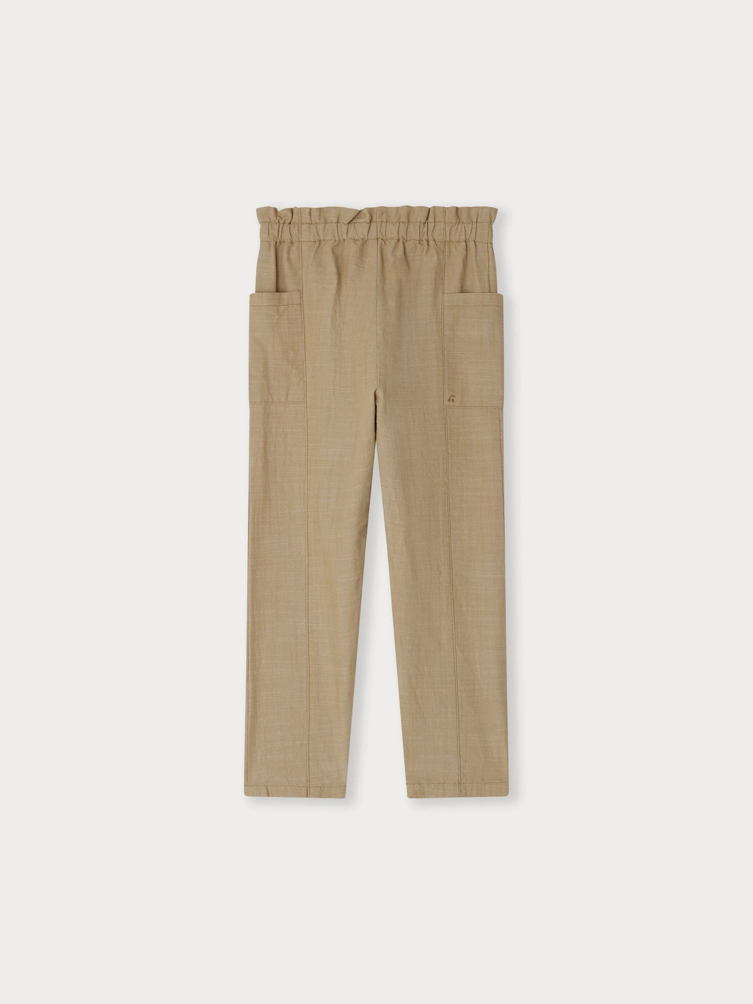 En coton biologique, ce pantalon Tiche pour fille se distingue par ses jolis détails. De coupe droite et élastiqué à la taille, il dispose d’une ceinture plissée et de grandes poches plaquées sur les hanches.