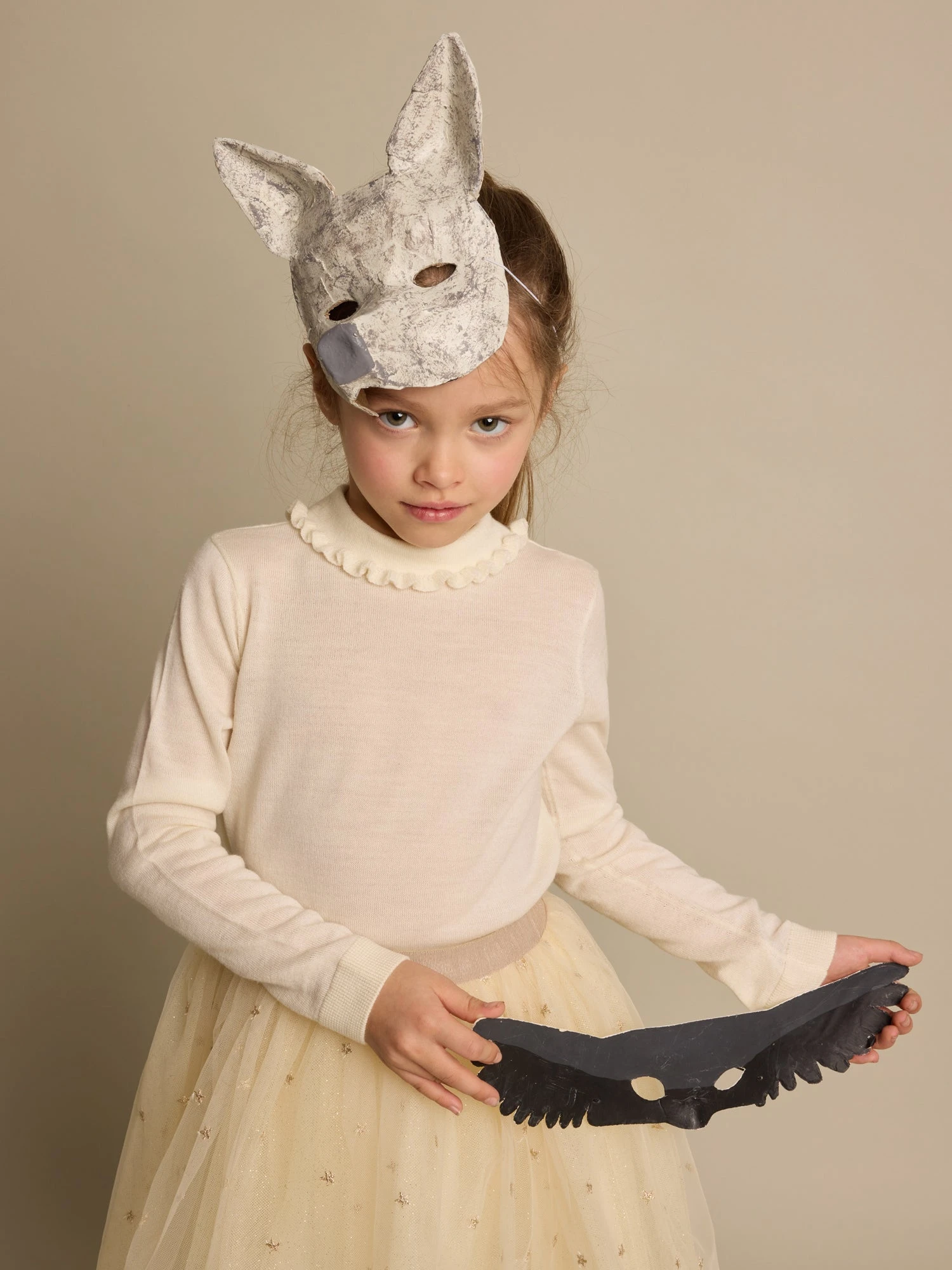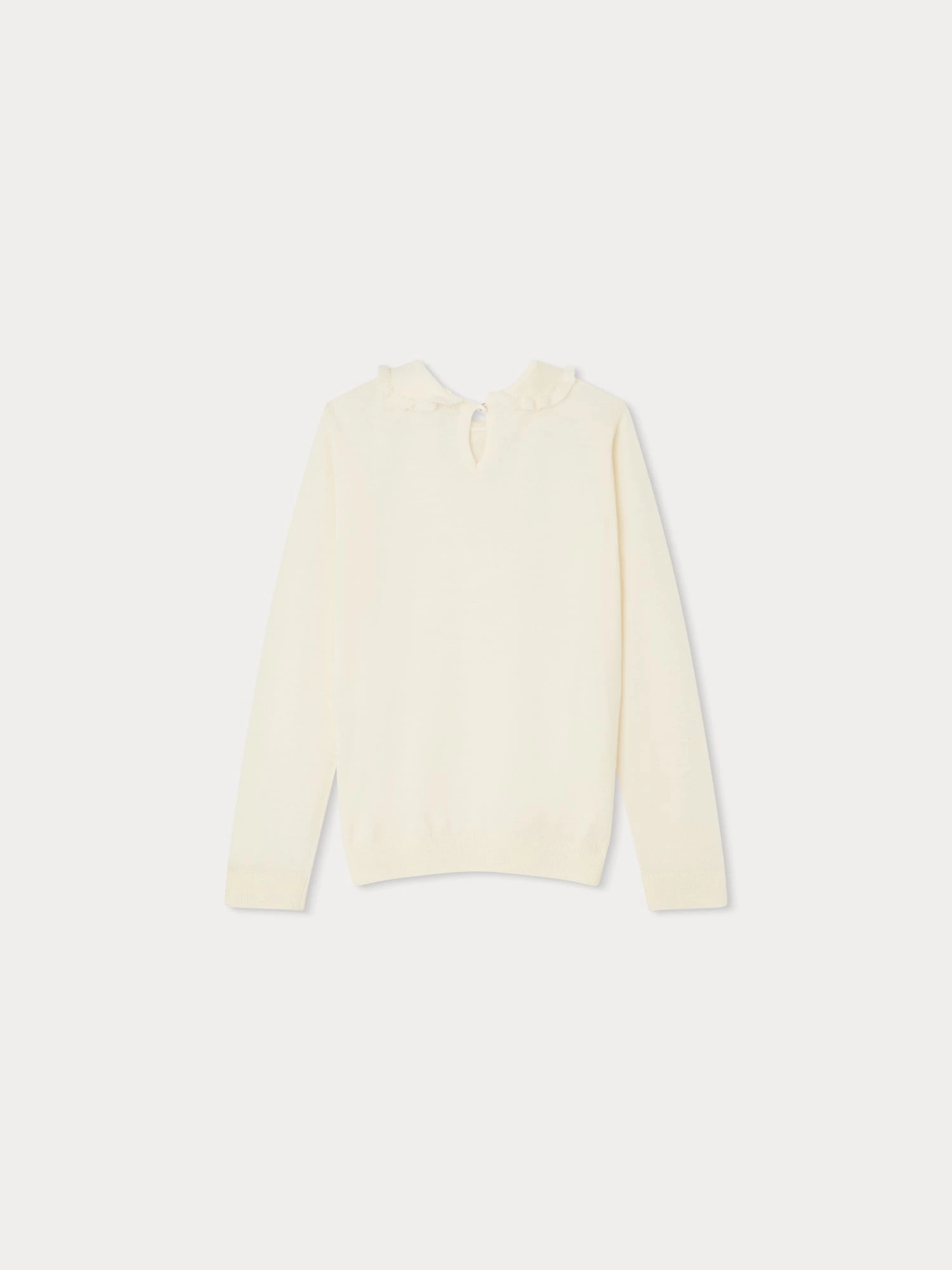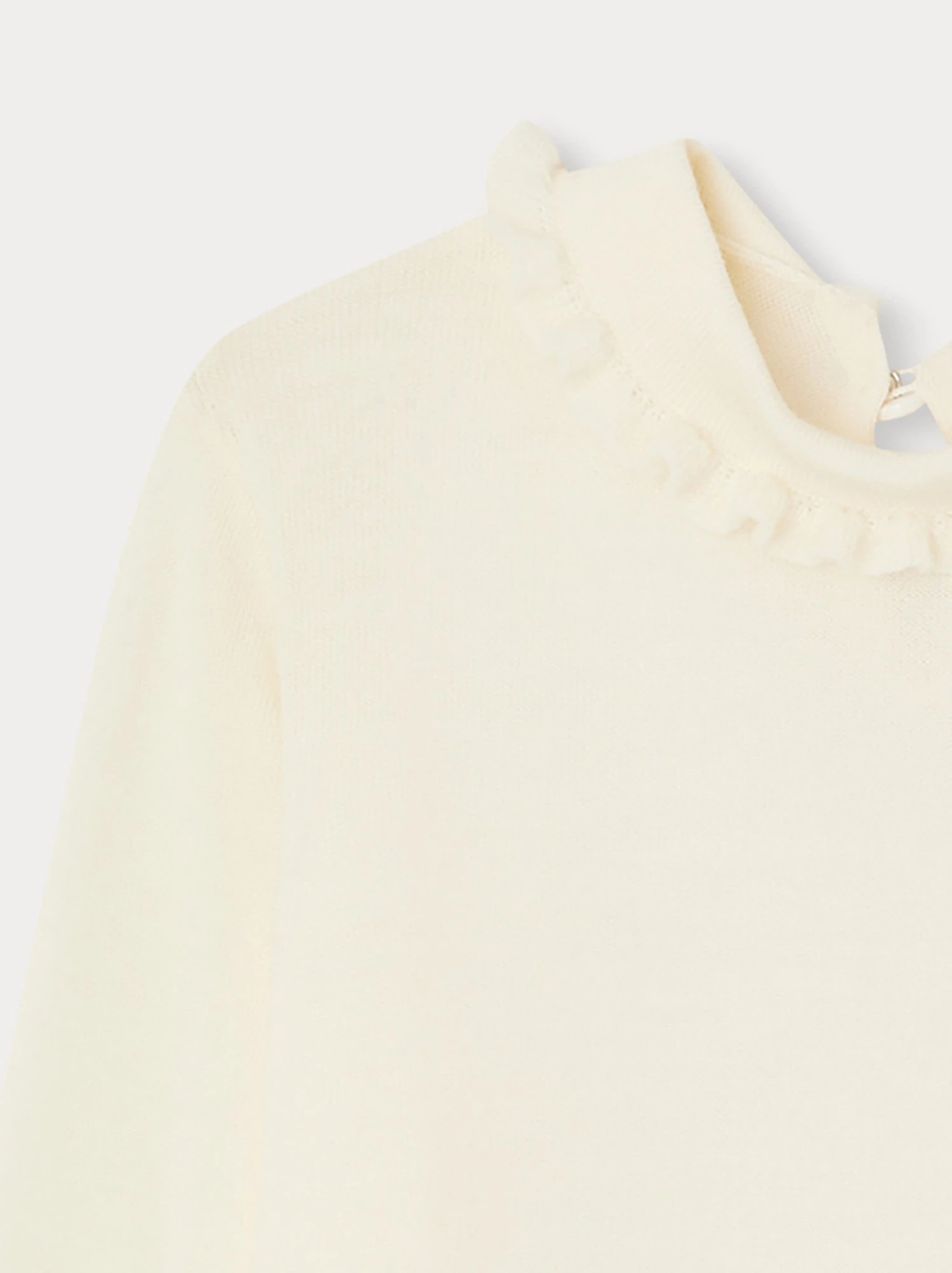 Ce pull pour fille Drynji doit toute son élégance à son col montant orné d’un petit volant. Il est confectionné dans une laine douce, chaude, résistante et biodégradable.