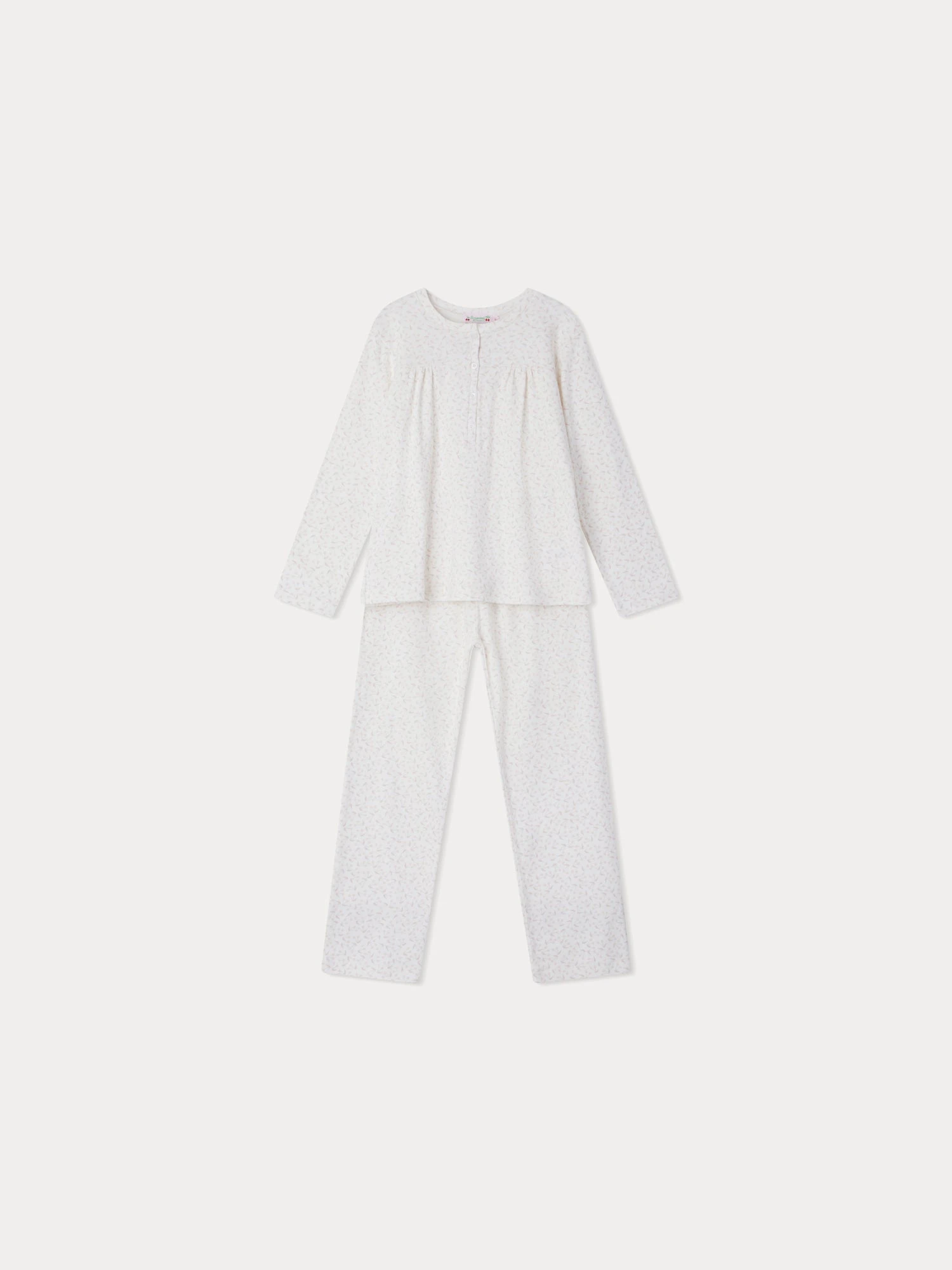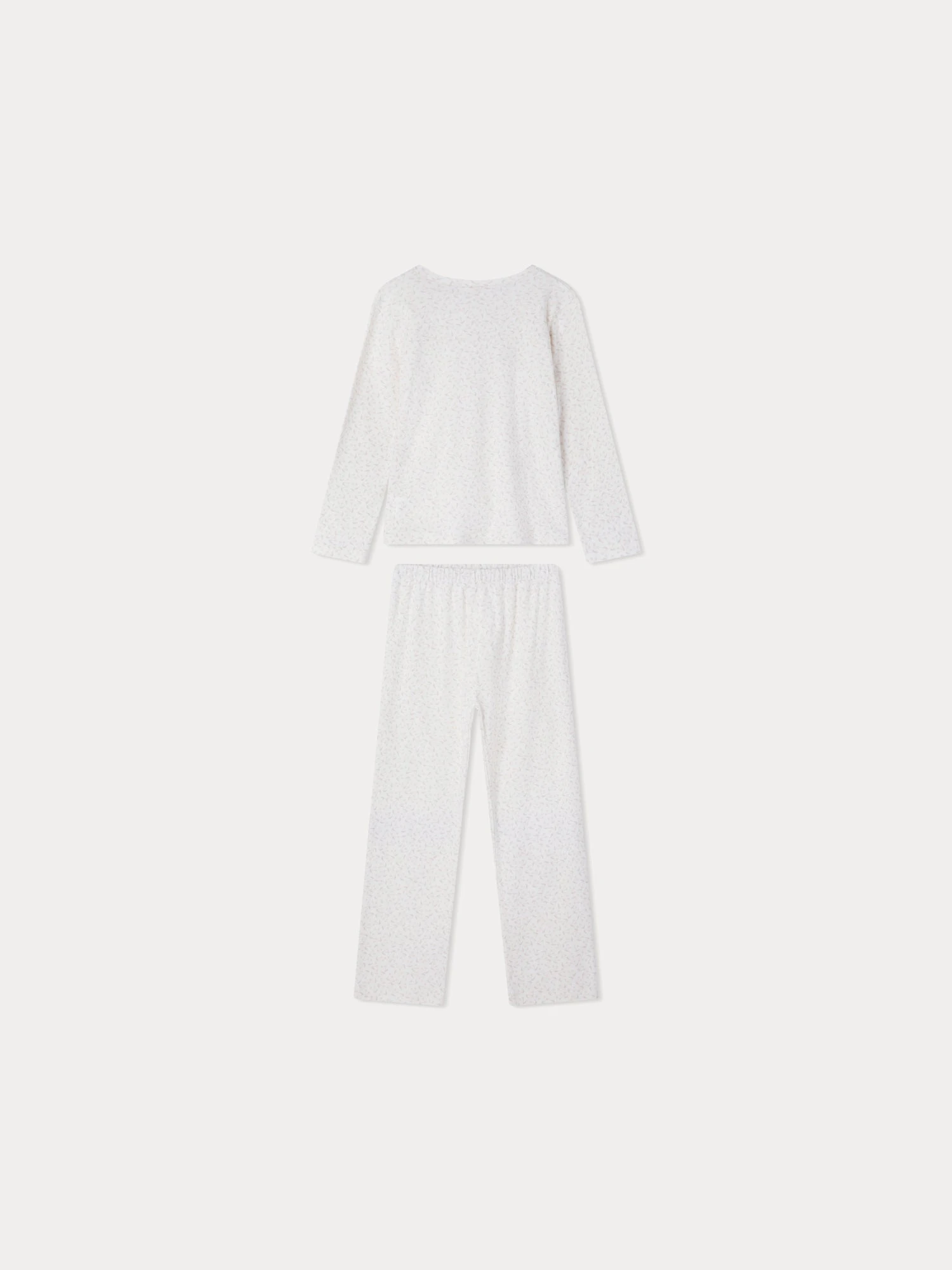 Le pyjama Bellina pour fille est réalisé en coton issu de fibres biologiques certifiées. Ce modèle deux pièces se caractérise par son imprimé intégral aux petites cerises discrètes.