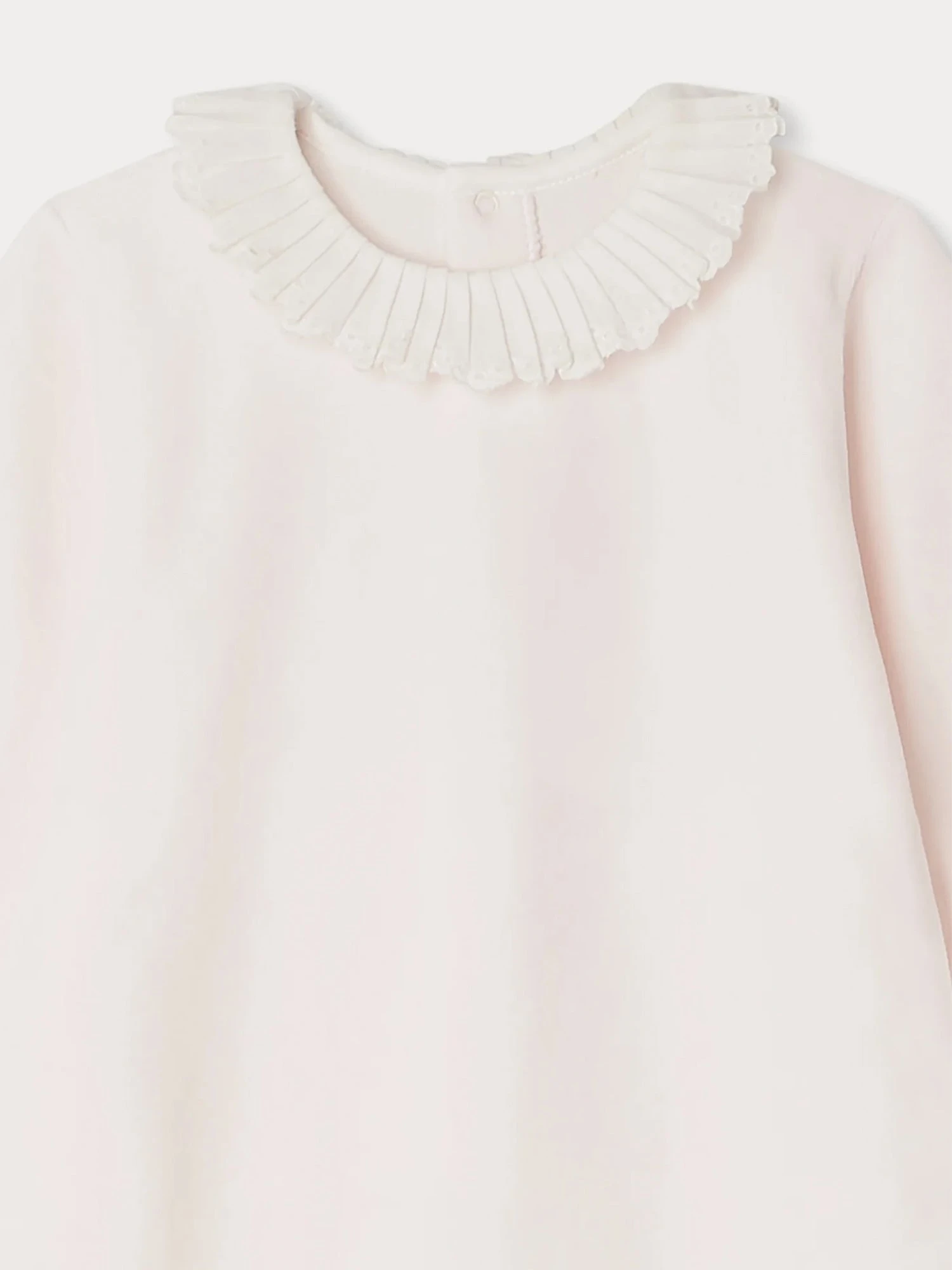 Le pyjama Héritière pour bébé est ravissant avec sa collerette plissée et ses poignets élastiqués aux bords volantés. Il se ferme à l’aide de pressions discrètes au dos.