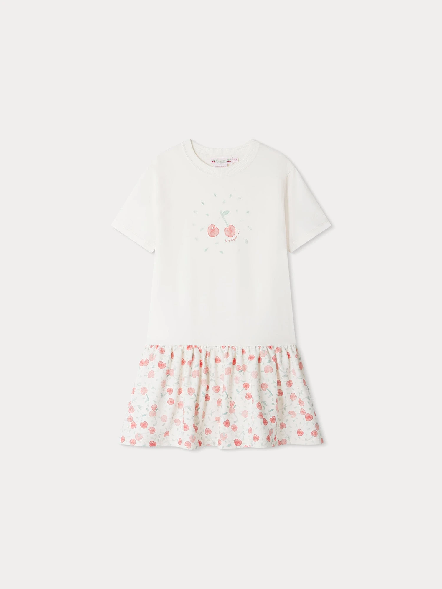 Composée d’un t-shirt à manches courtes et d’une base froncée, cette robe Amaia pour fille rend hommage à l’iconique cerise Bonpoint. On la retrouve imprimée sur le haut et sur l’ensemble de la jupe.