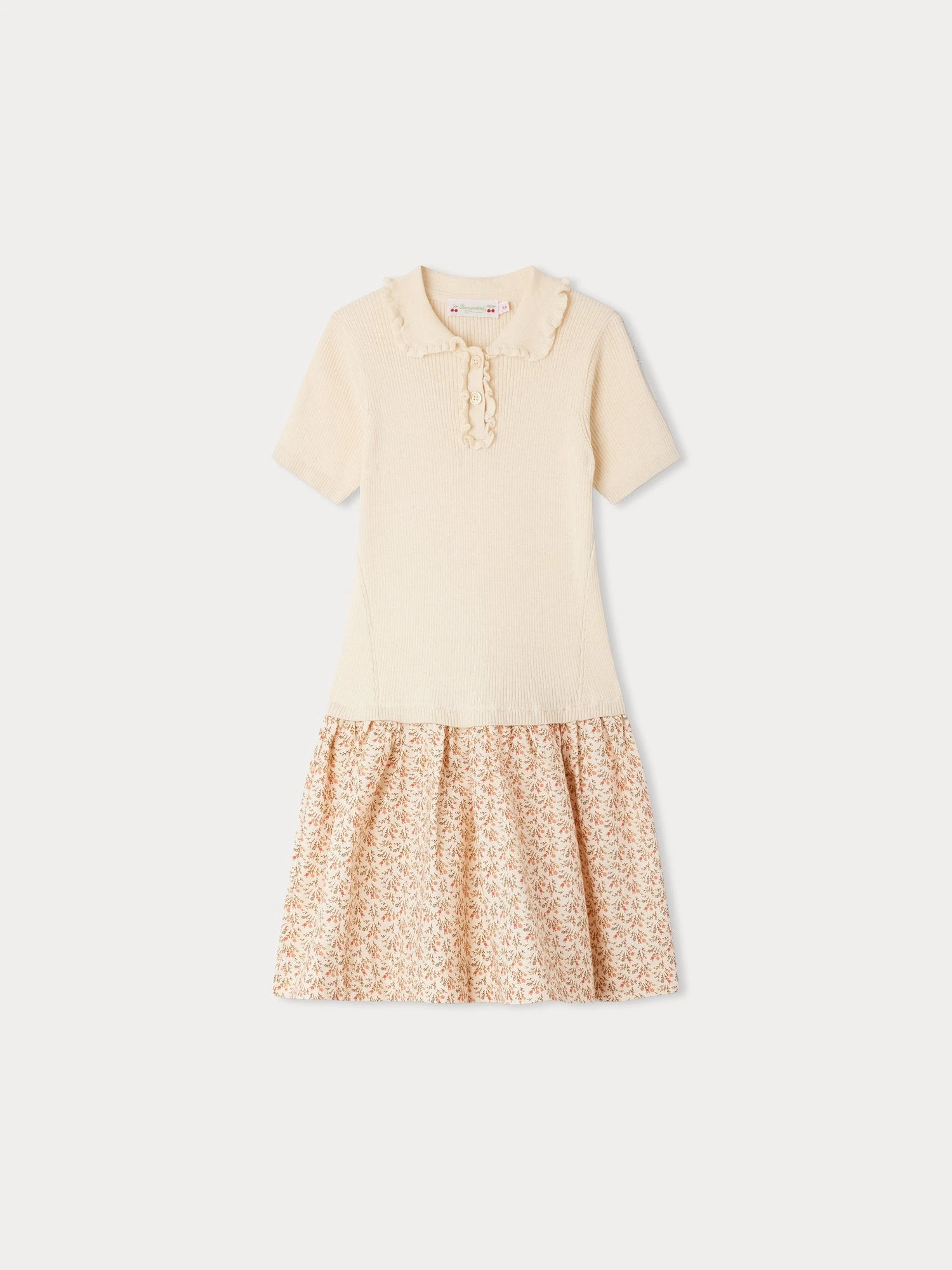 Confectionnée en coton biologique, la robe bimatière Clivia pour fille se compose d’un haut à manches courtes et d’une jupe en tissu floral froncé. Le col Claudine et la patte de boutonnage sont agrémentés de volants.