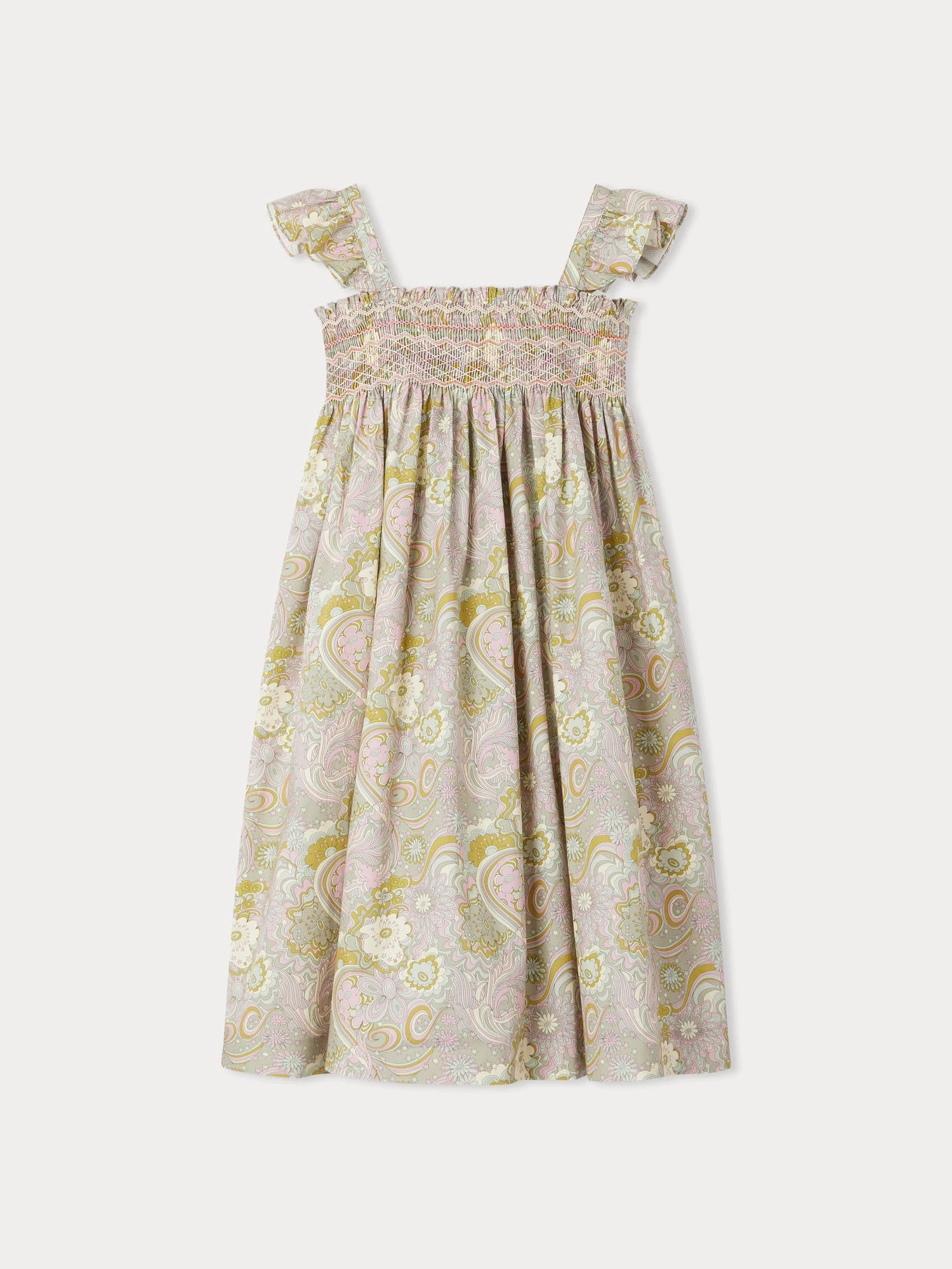 La robe Frances pour fille se caractérise par son tissu Liberty plein de poésie. Les smocks sur le buste sont brodés à la main, et surplombent des fronces qui donnent du mouvement à la coupe évasée.