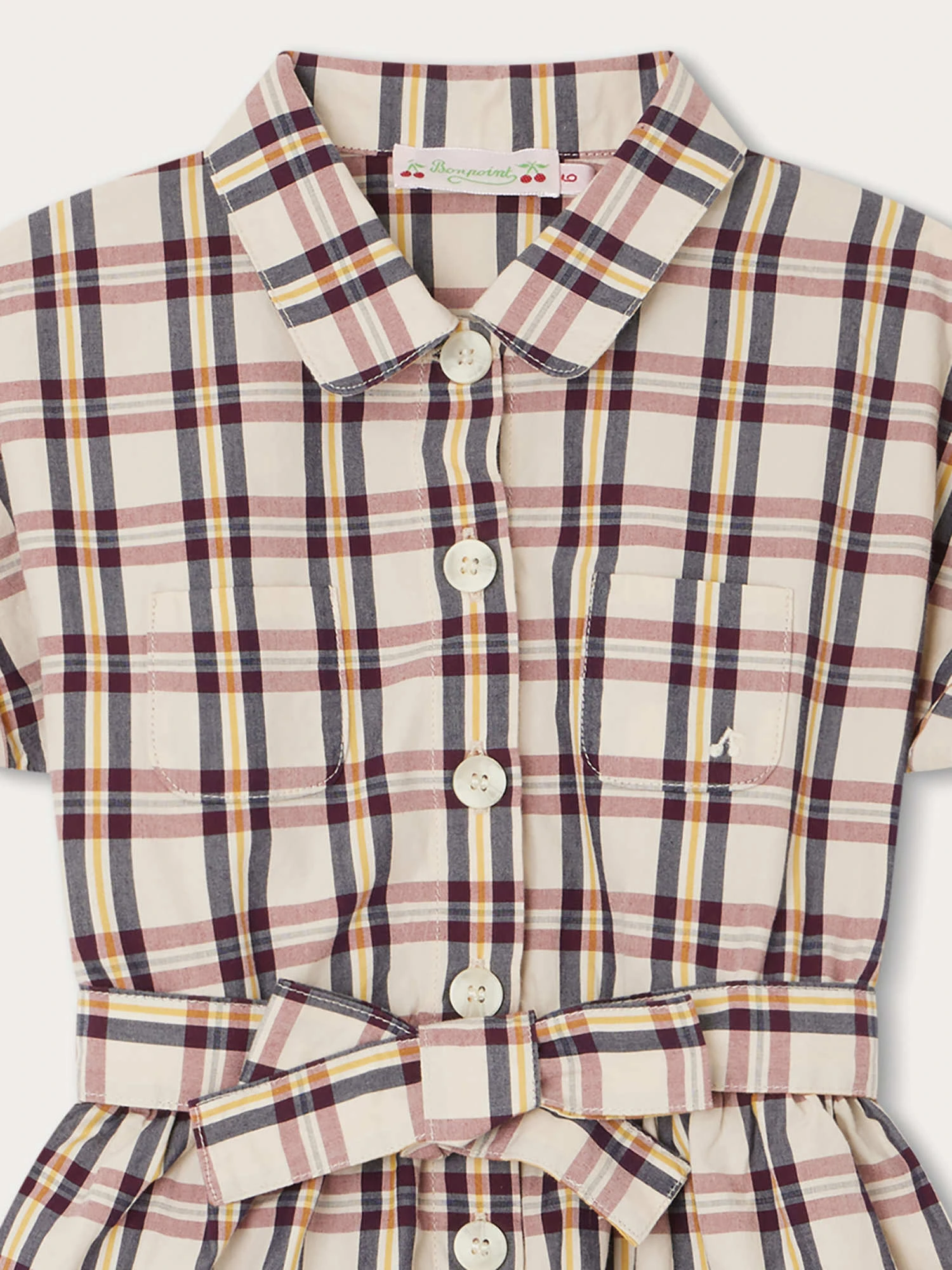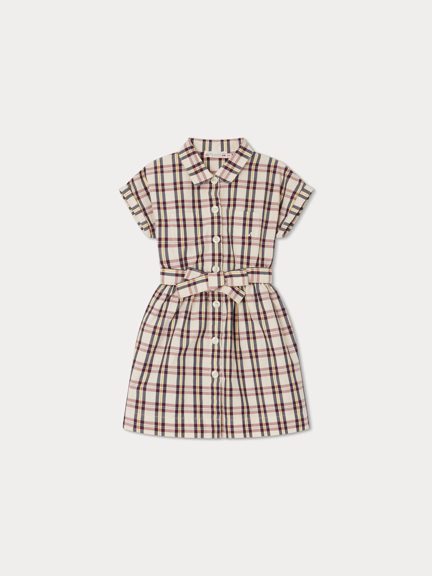 La robe Gisele pour fille revisite un style rétro avec ses jolis carreaux et ses gros boutons. Une des deux poches plaquées arrondies devant affiche la cerise emblématique de la Maison.