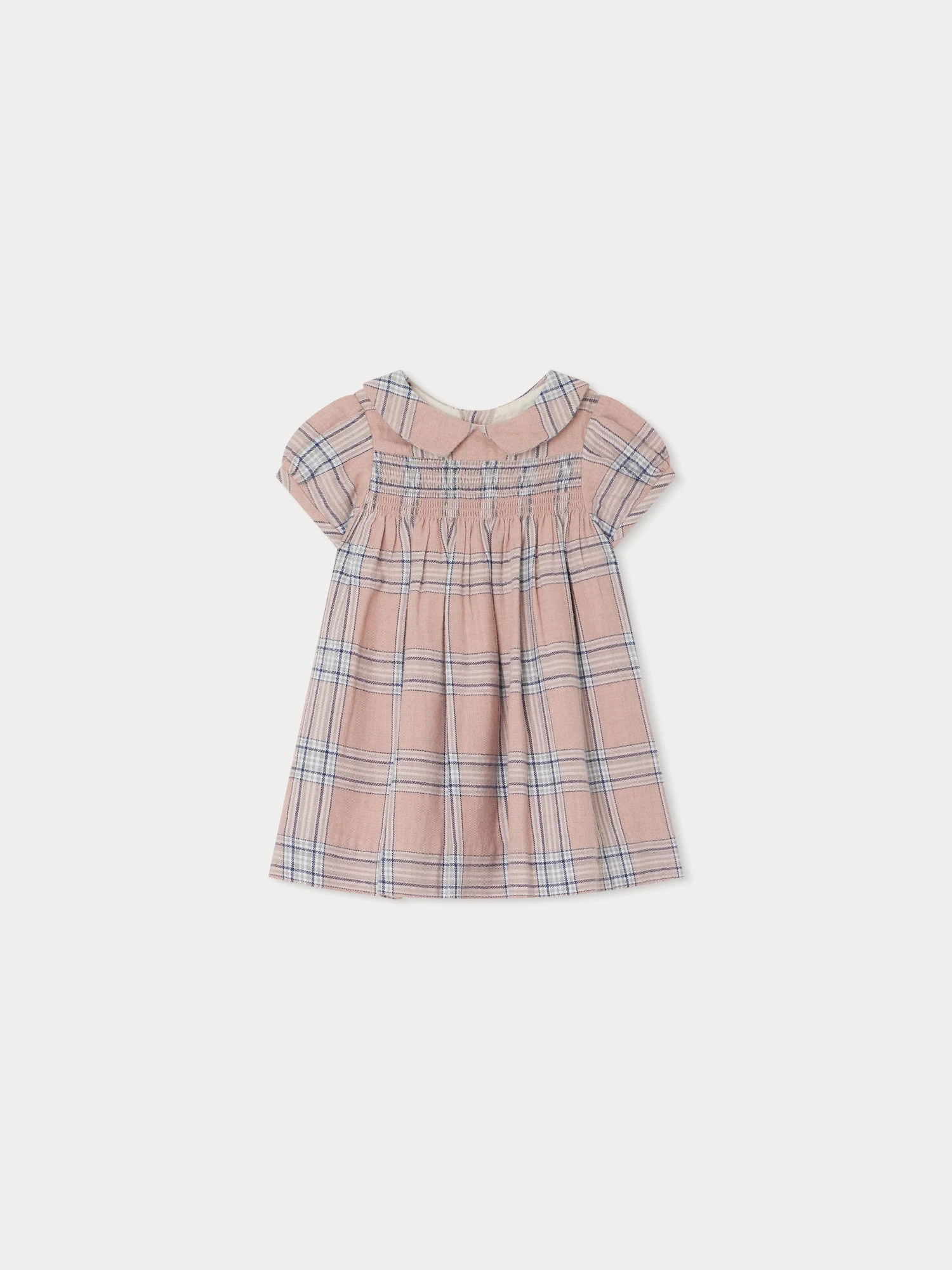 L’imprimé à carreaux colorés de la robe Joyeuse pour bébé est plein de grâce. Des smocks délicats s’invitent sur le buste et structurent la coupe évasée.
