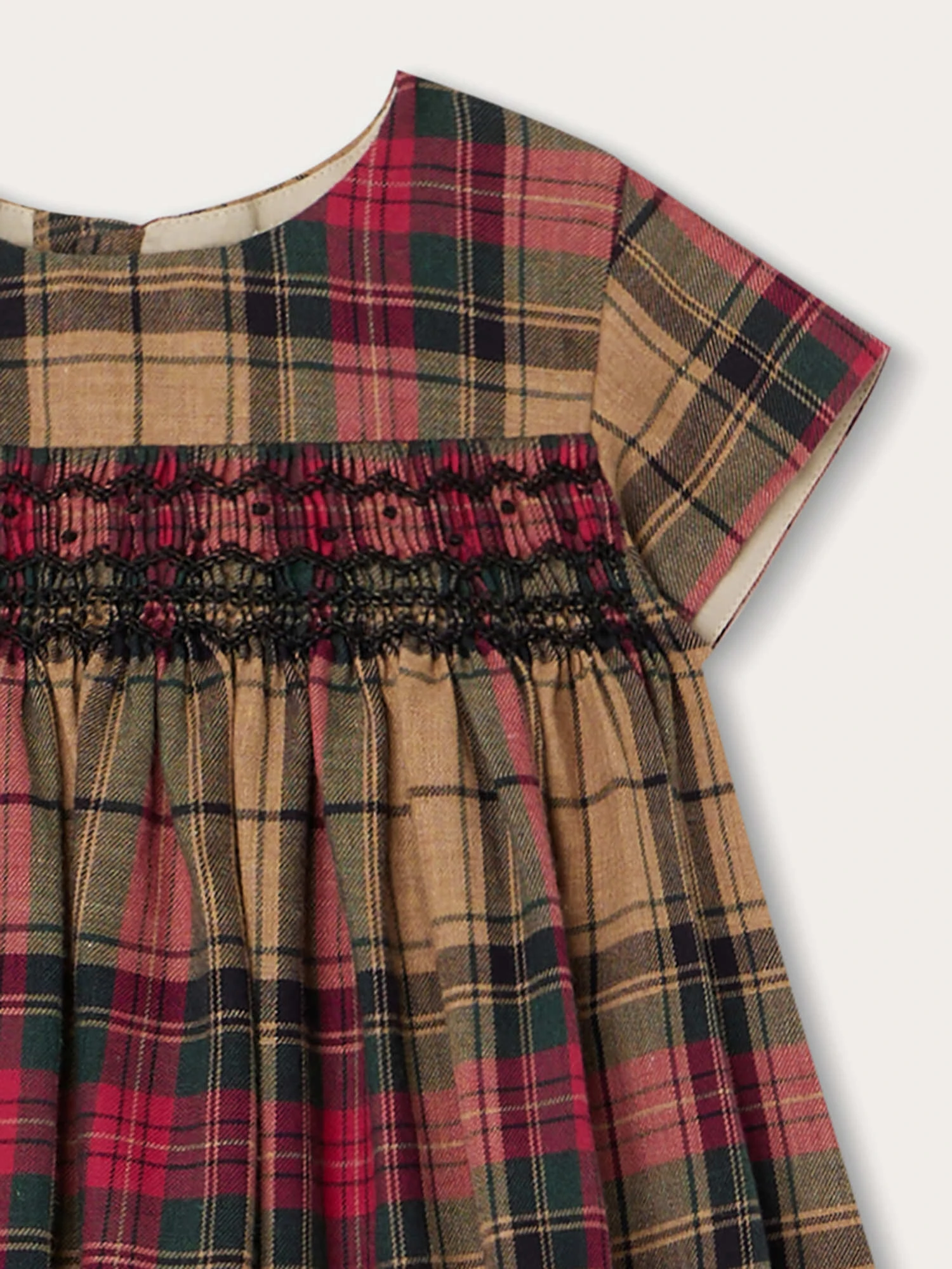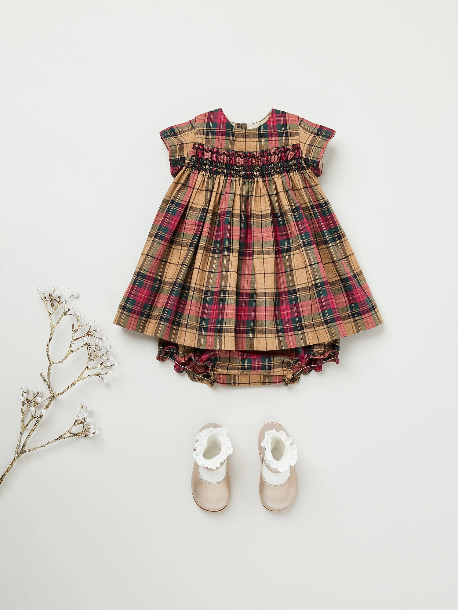 Cette robe pour bébé Maruska doit toute son élégance à ses smocks finement brodés à la main sur le buste. Elle se présente dans un ravissant motif à carreaux et est vendue avec son bloomer assorti.