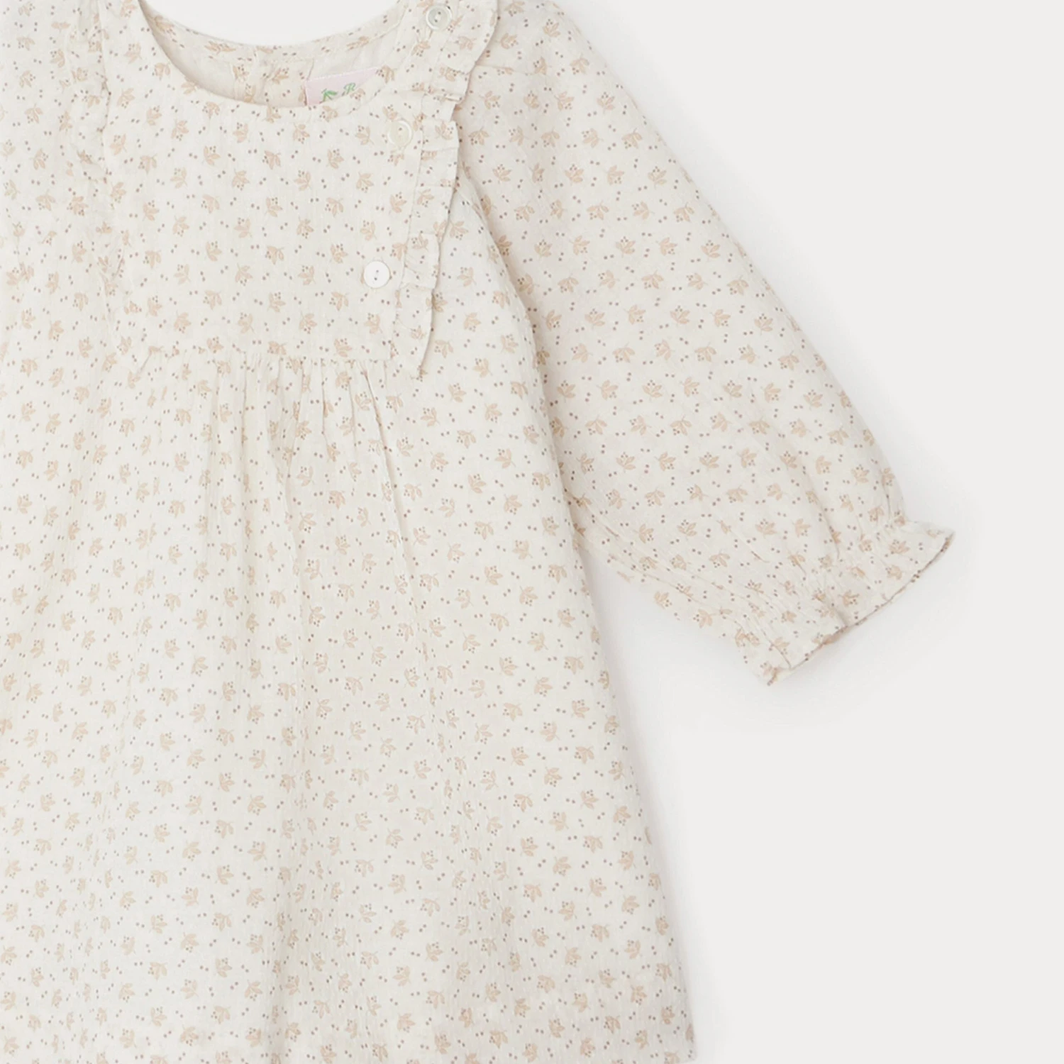 La robe Taelia pour bébé tire son charme de ses détails volantés sur l’empiècement devant et aux poignets. En tissu imprimé léger, elle est doublée en voile de coton pour plus de confort.