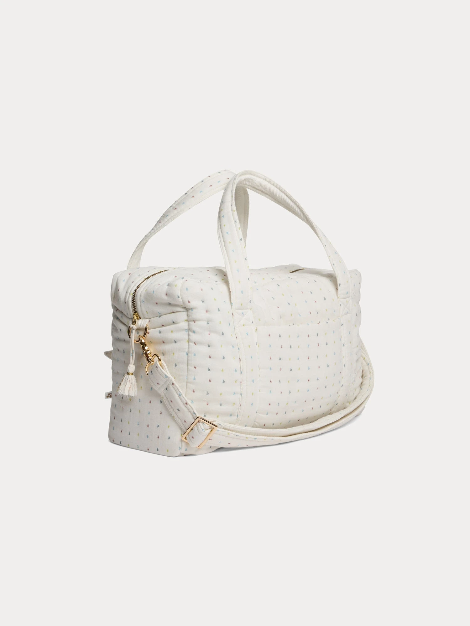 Le sac à langer matelassé Piou, conçu en double gaze de coton biologique imprimée, offre une multitude de poches pratiques. Idéal en tant que cadeau de naissance, il est agrémenté de charmants pompons et de breloques cerises et étoile.