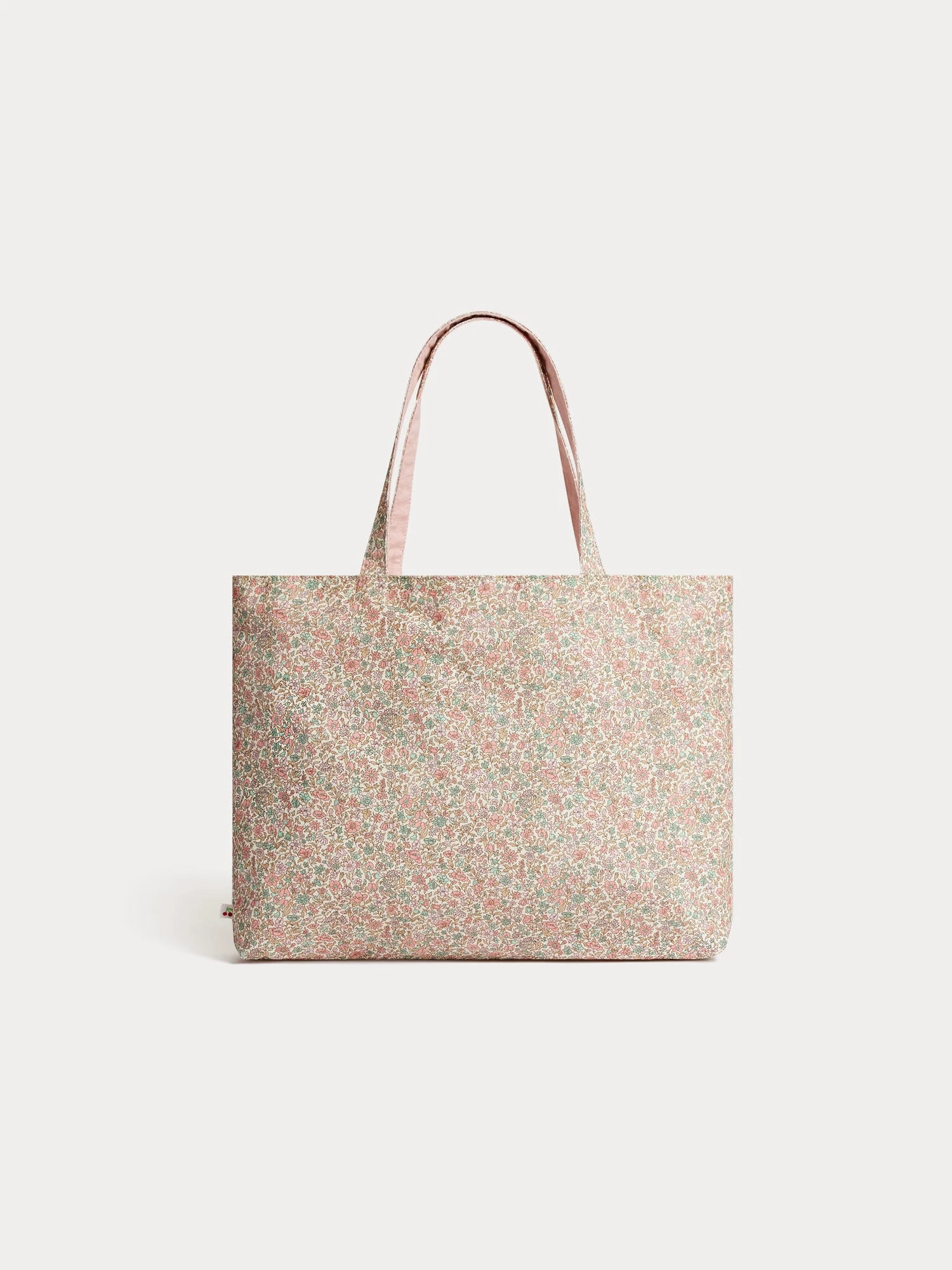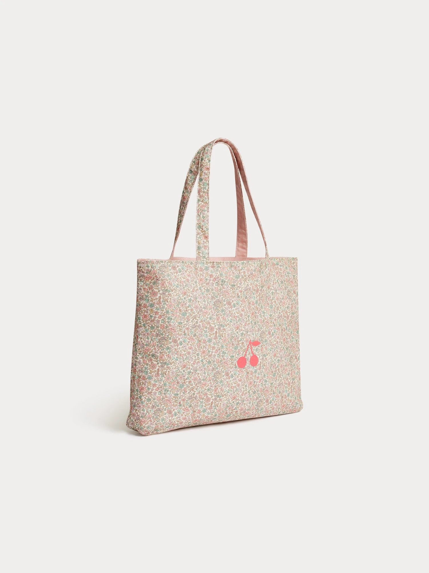 Le sac cabas Newbaggy pour fille rivalise de poésie avec son tissu Liberty aux ravissantes petites fleurs. Ce modèle grand format possède une cerise emblématique imprimée en contraste devant.