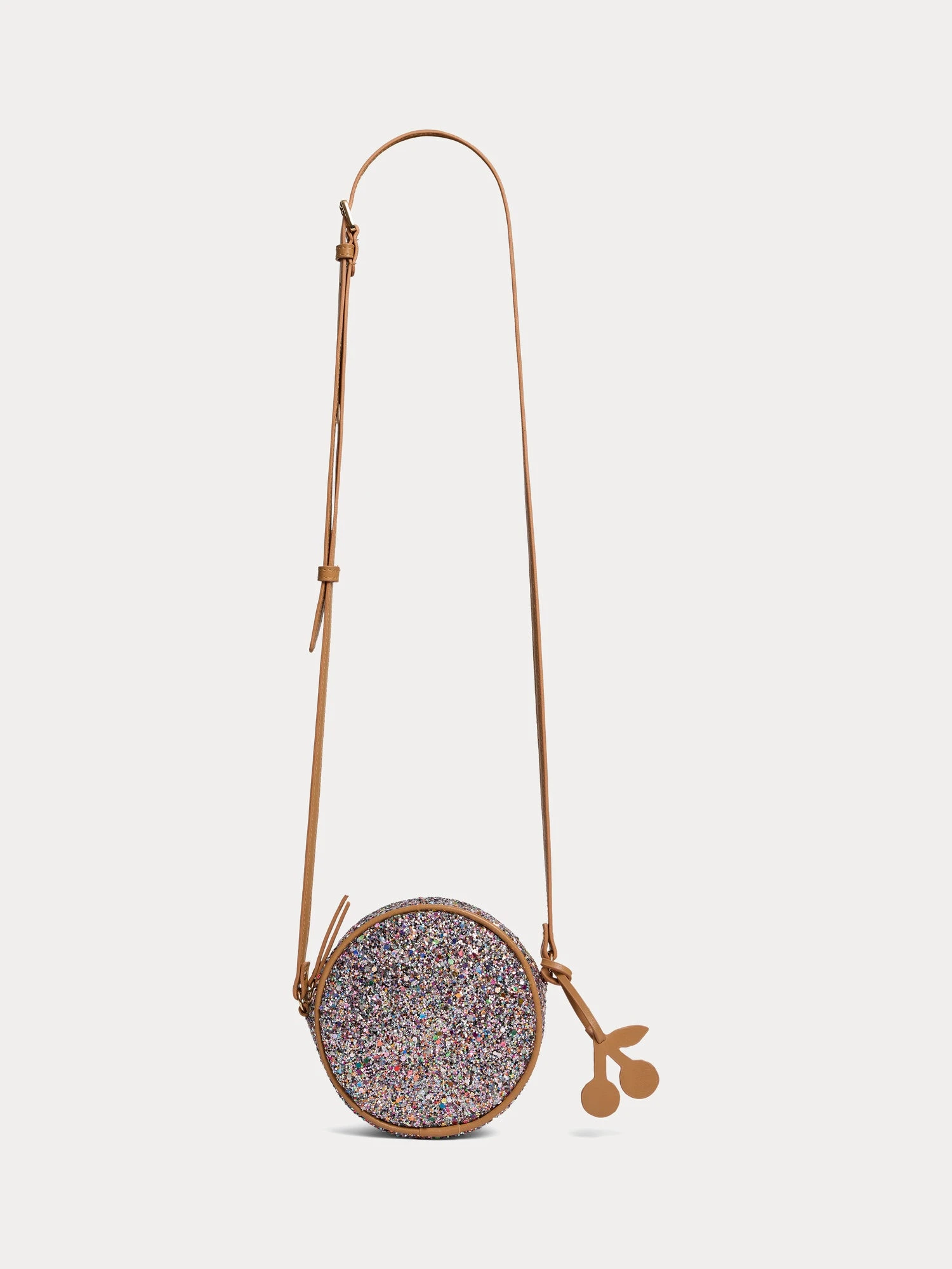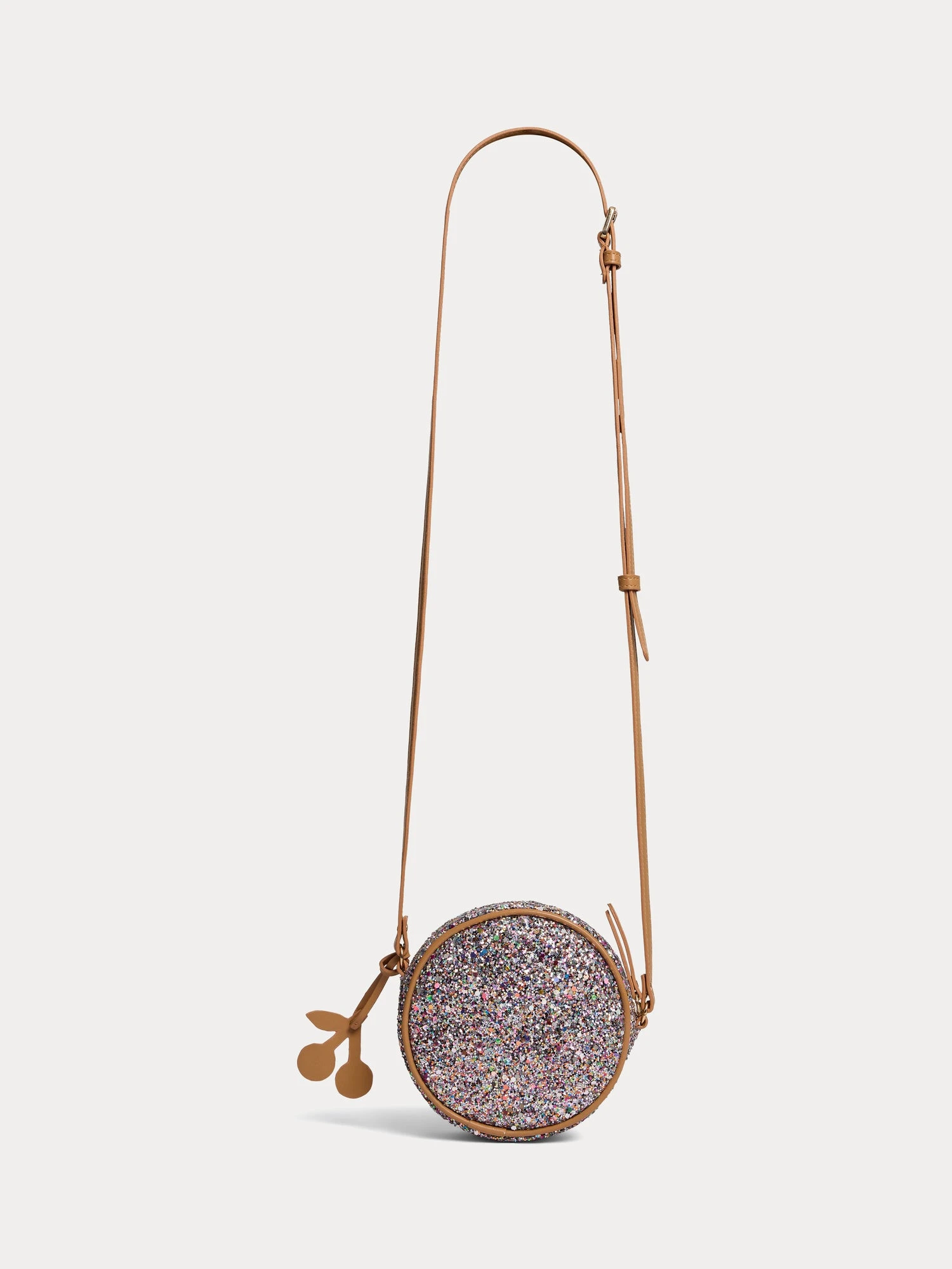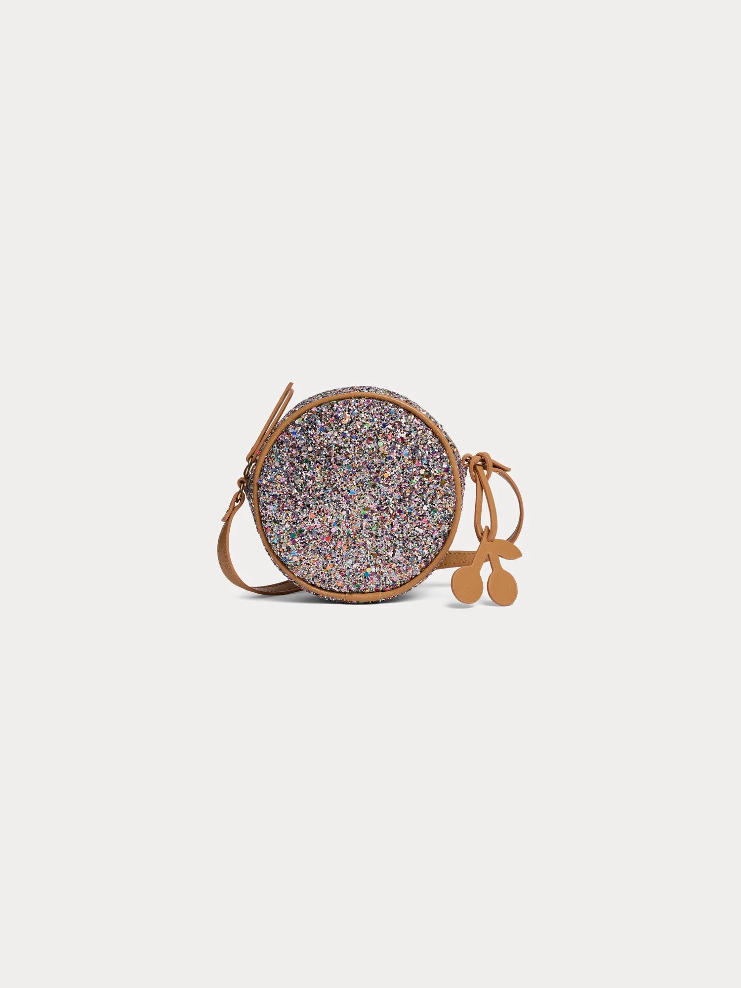 De forme ronde, le sac à bandoulière effet cuir Gomette pour fille s’habille de paillettes multicolores. Ce modèle iconique est signé d’une breloque cerise, symbole emblématique de la Maison.